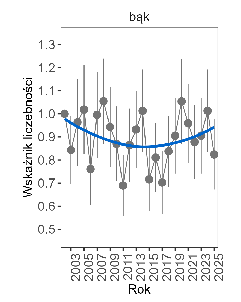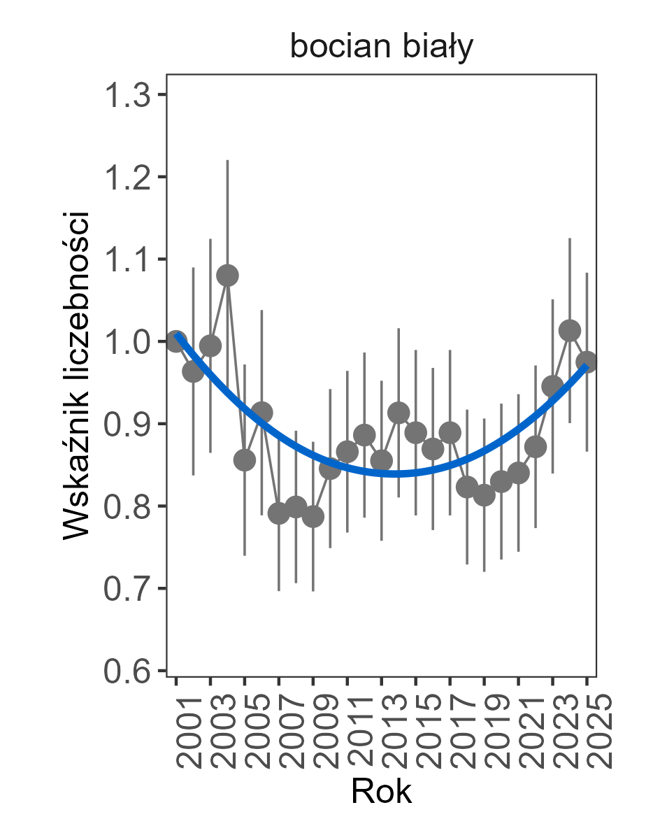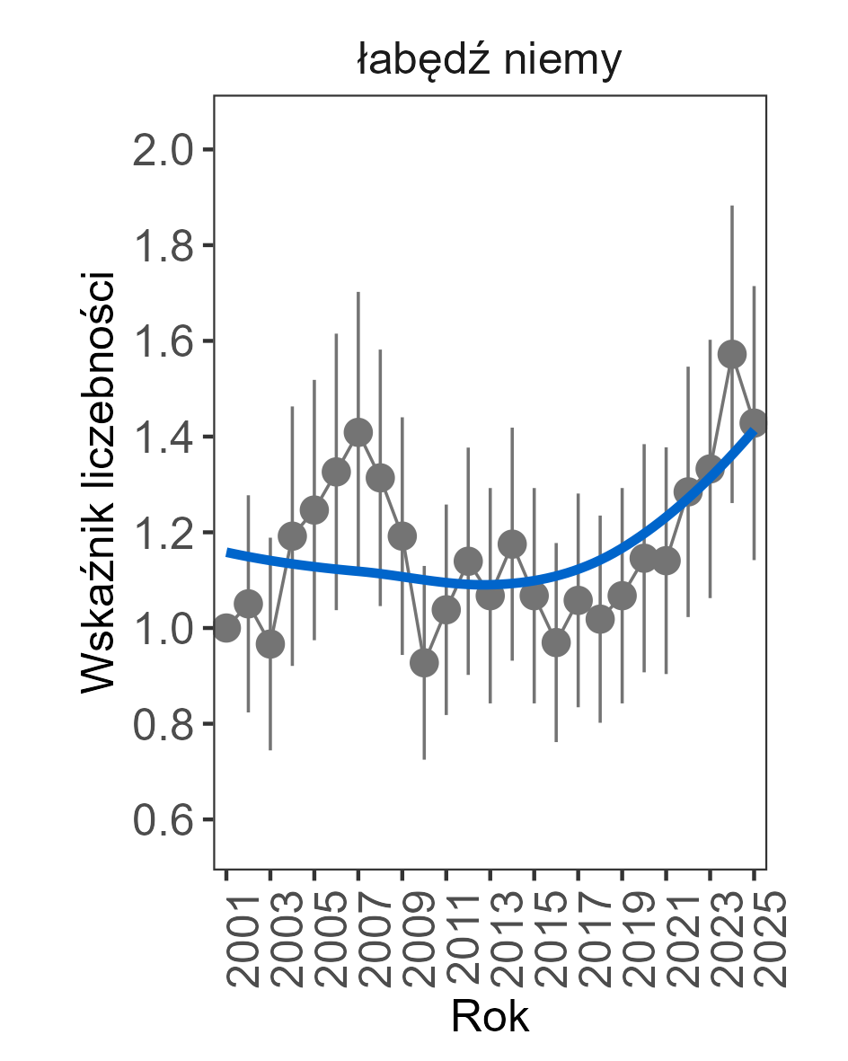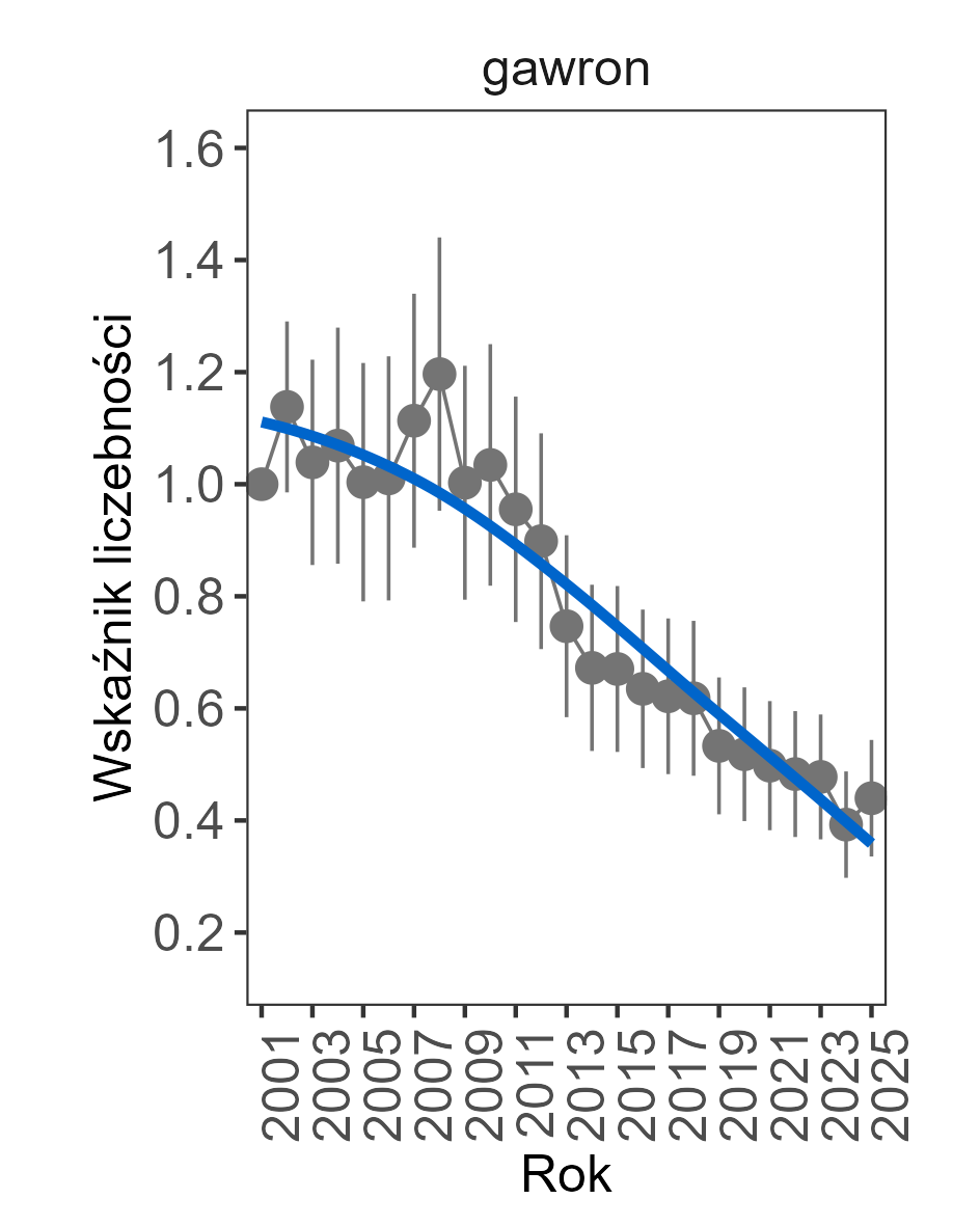 Spadek liczebności wykazano u gawrona oraz perkoza rdzawoszyjego, których wskaźniki liczebności zmniejszały się przeciętnie o odpowiednio 4% i 5% rocznie.