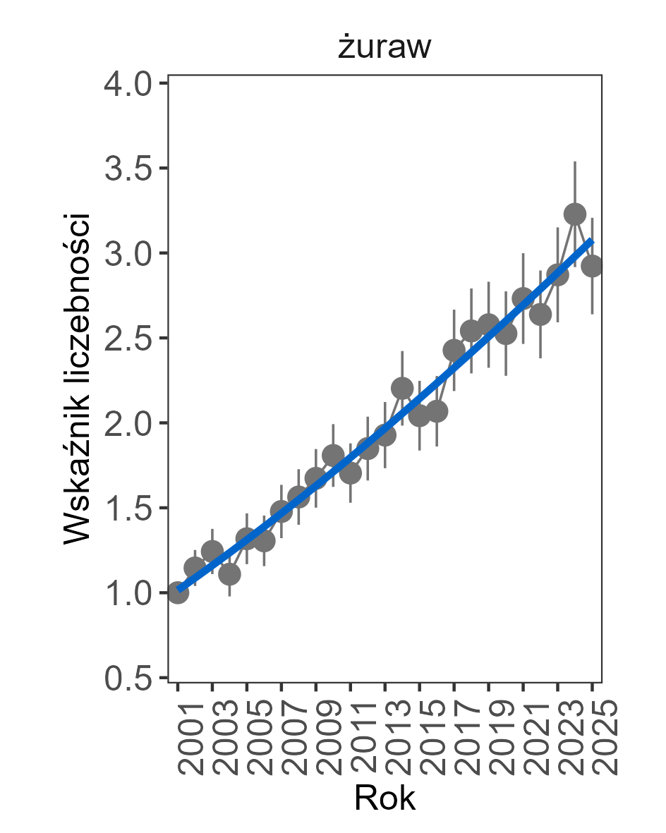 W całym okresie badań wykazano wzrostowy trend liczebności populacji żurawia, którego wskaźnik liczebności podczas trwania programu zwiększał się w dość stałym tempie na poziomie 5% rocznie. Wykazano również umiarkowany wzrost błotniaka stawowego (1% rocznie).