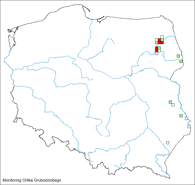 W roku 2025 gniazdowanie orlika grubodziobego stwierdzono w 12 spośród 20 kontrolowanych powierzchni 10x10 km.