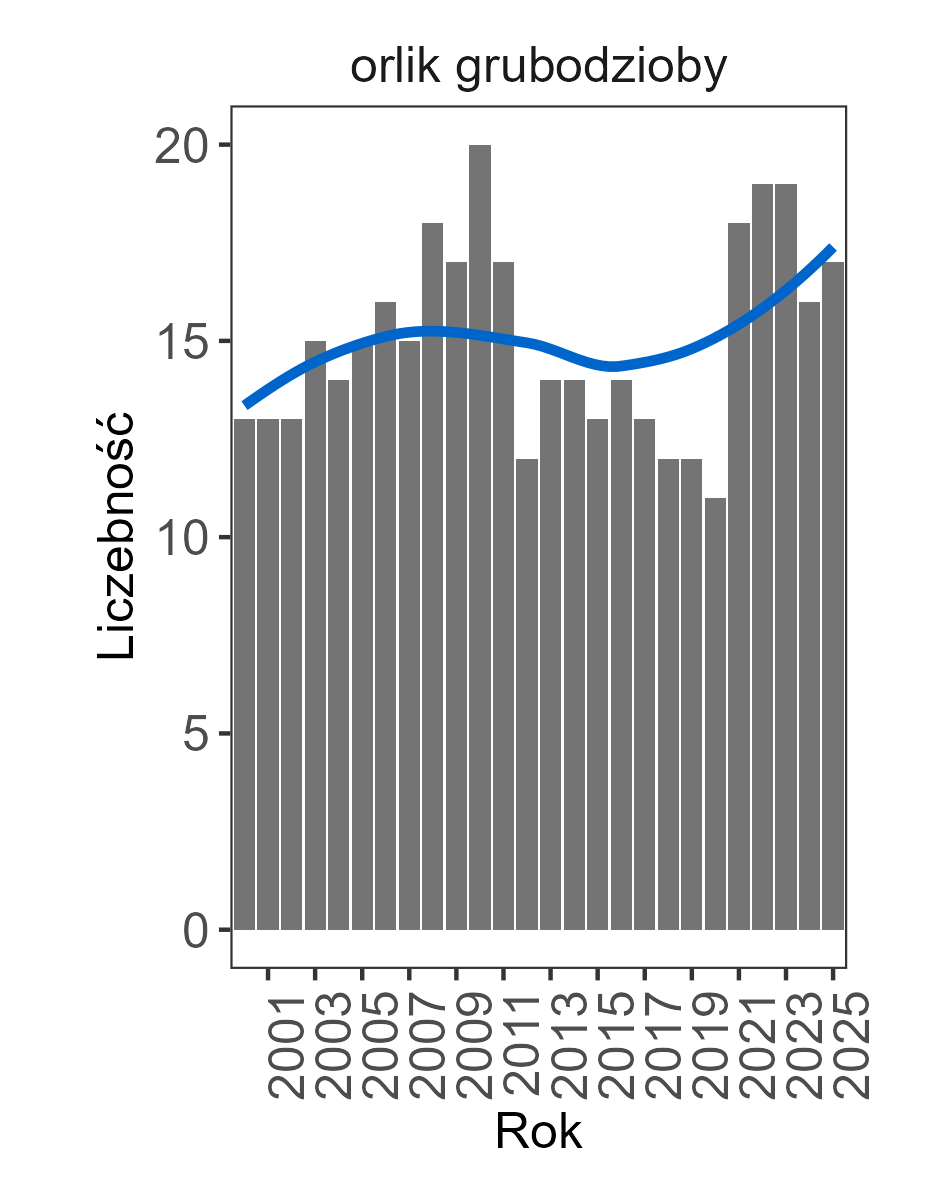Stwierdzono 17 par orlika grubodziobego. W latach 2000–2025 liczebność populacji lęgowej orlika grubodziobego wahała się w przedziale od 11 do 20 par. Wynik uzyskany w roku 2025 kształtuje się na poziomie średniej wartości tego parametru odnotowanej w całym okresie badań. Trend liczebności w całym okresie badań określono jako stabilny.