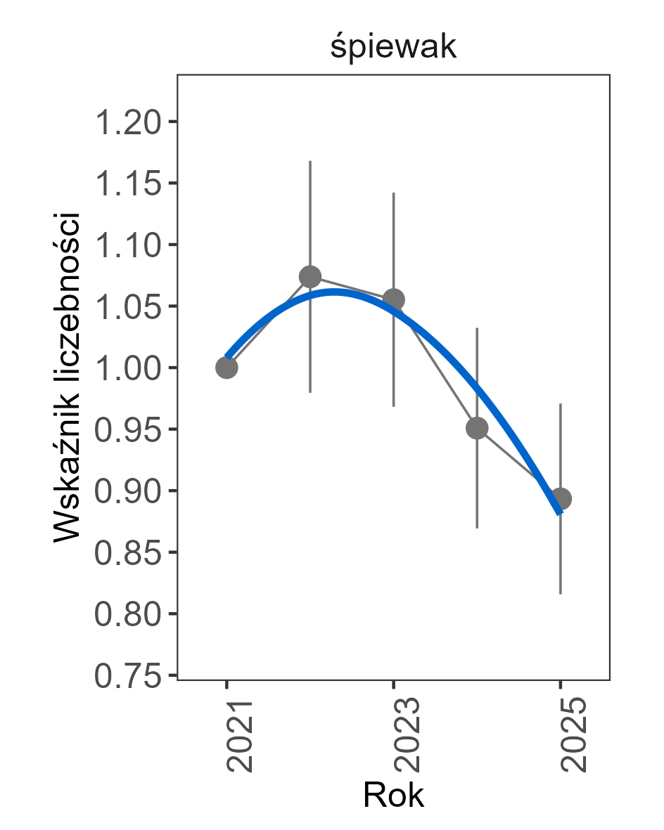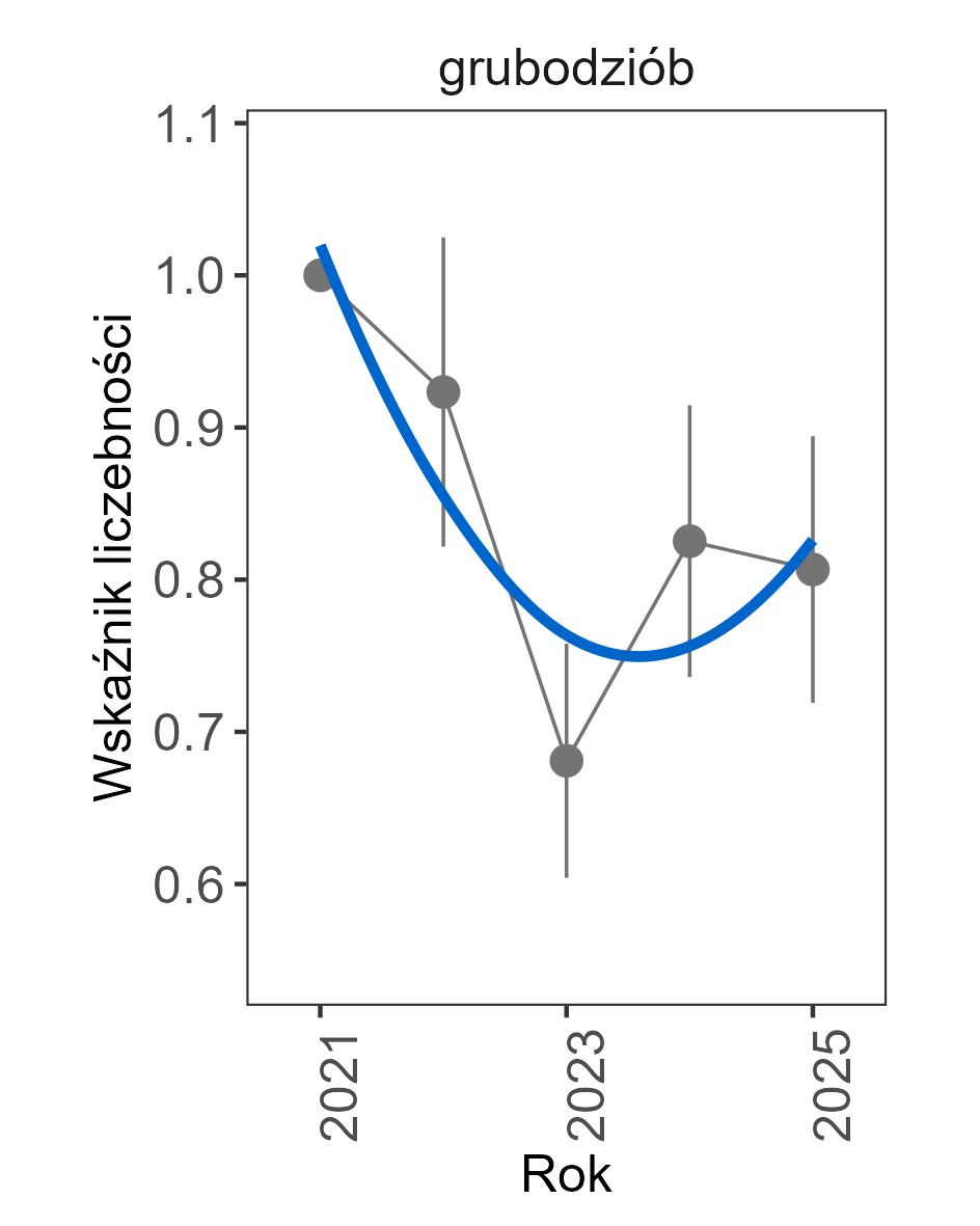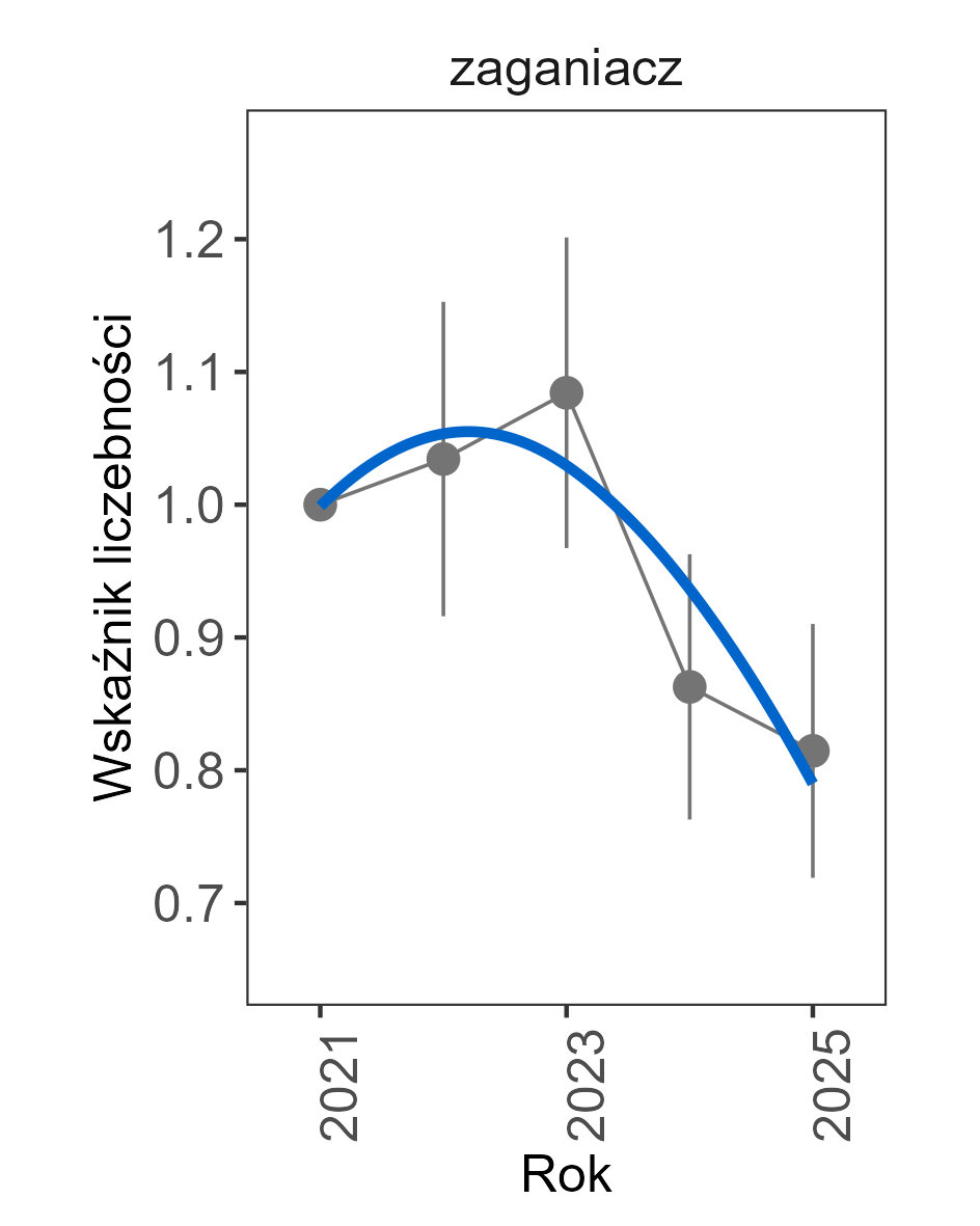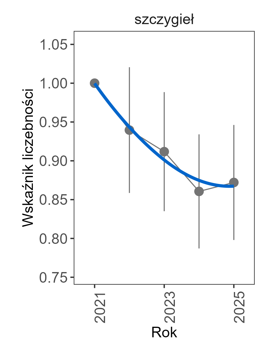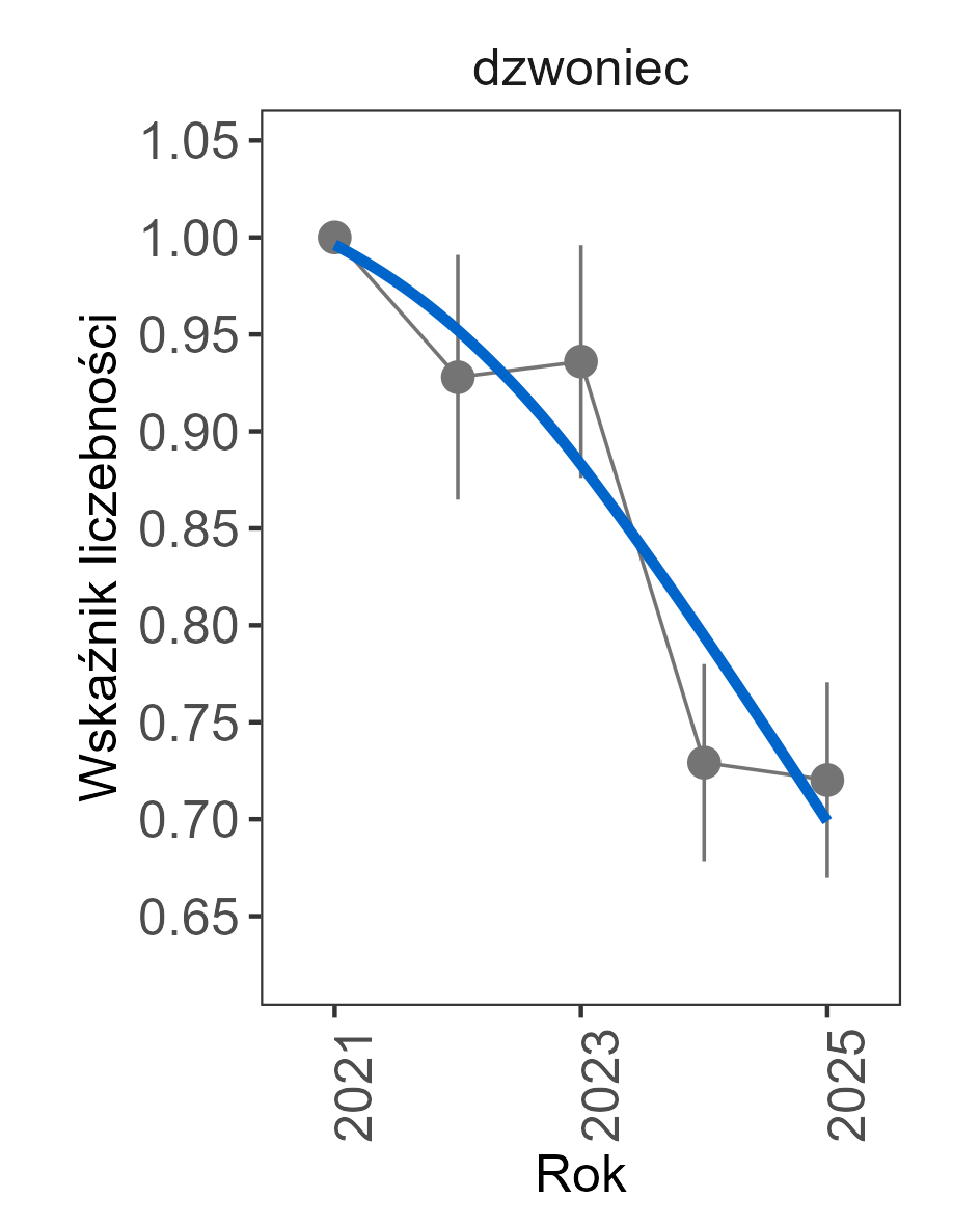 Wykresy zmian liczebności przedstawiono dla grupy 47 najbardziej rozpowszechnionych gatunków.
