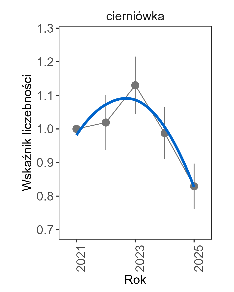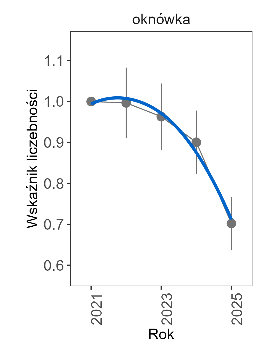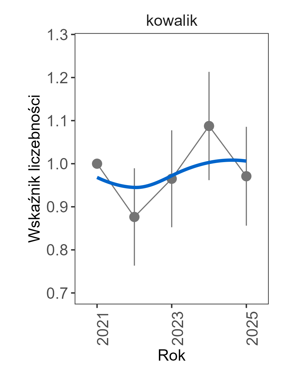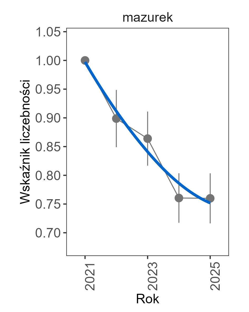 Wykresy zmian liczebności przedstawiono dla grupy 47 najbardziej rozpowszechnionych gatunków.