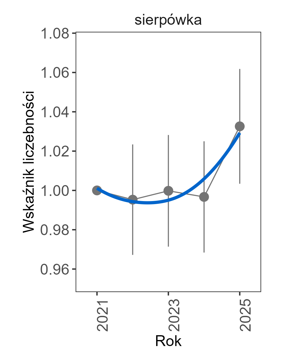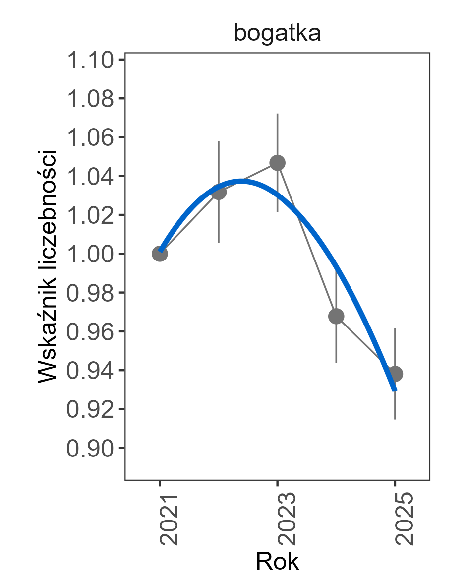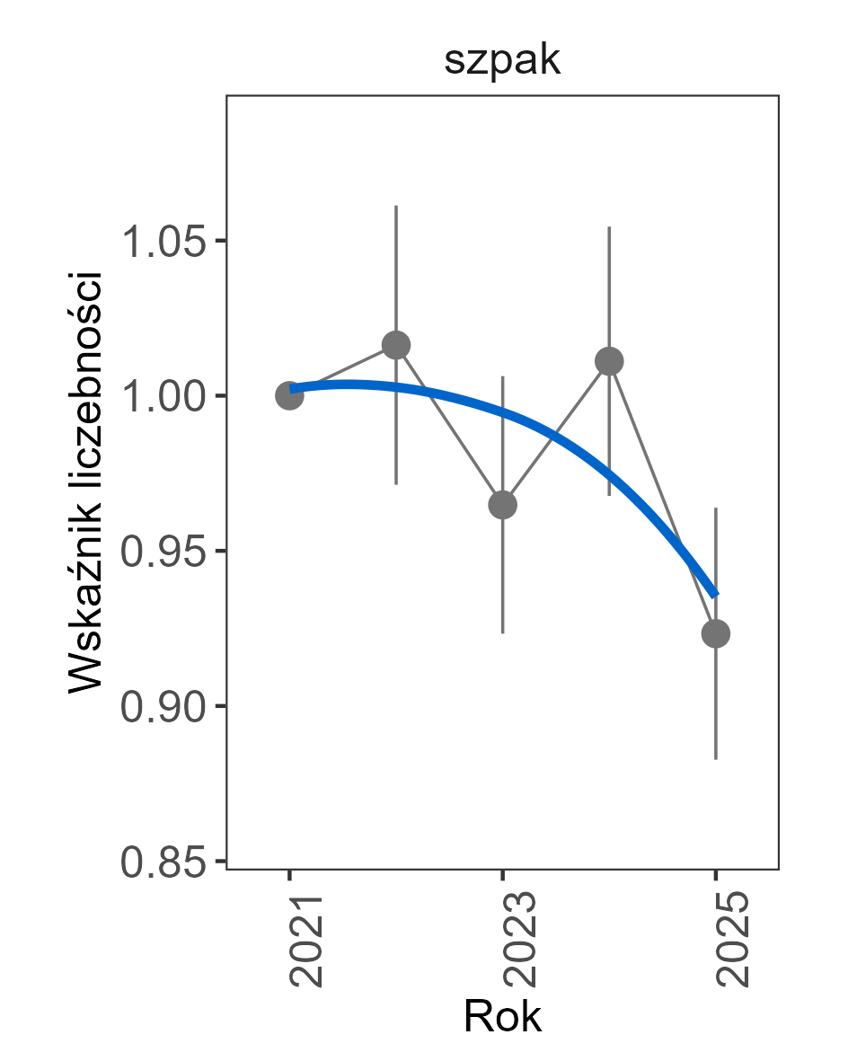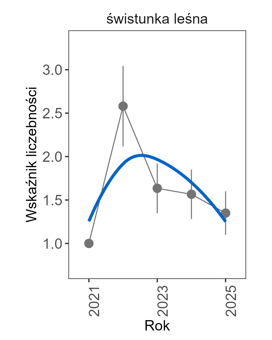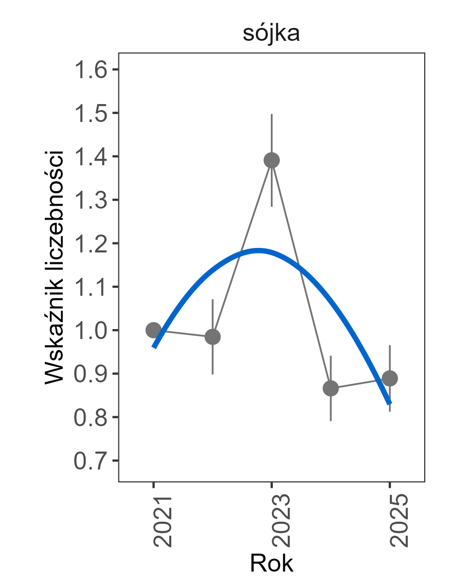 Wykresy zmian liczebności przedstawiono dla grupy 47 najbardziej rozpowszechnionych gatunków.