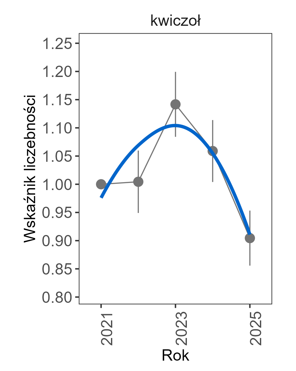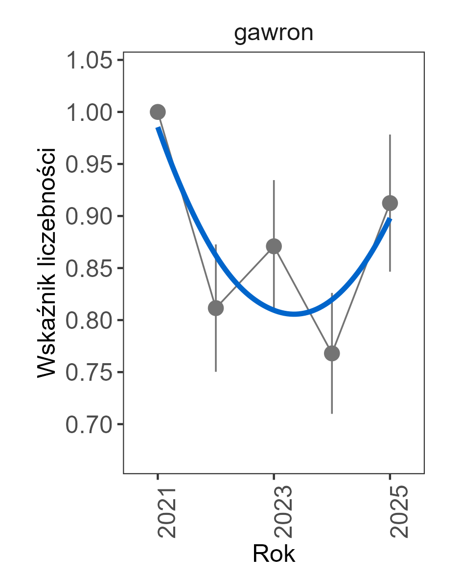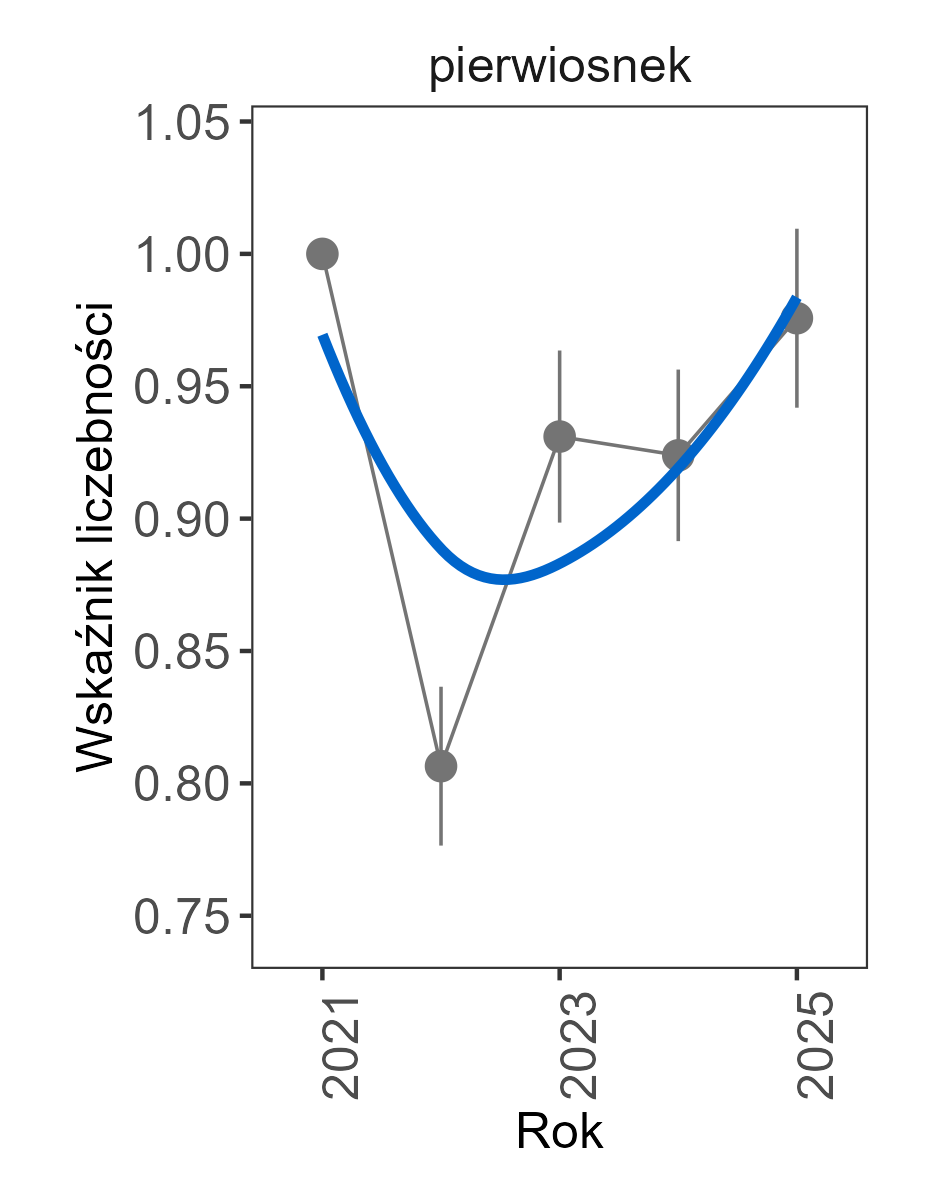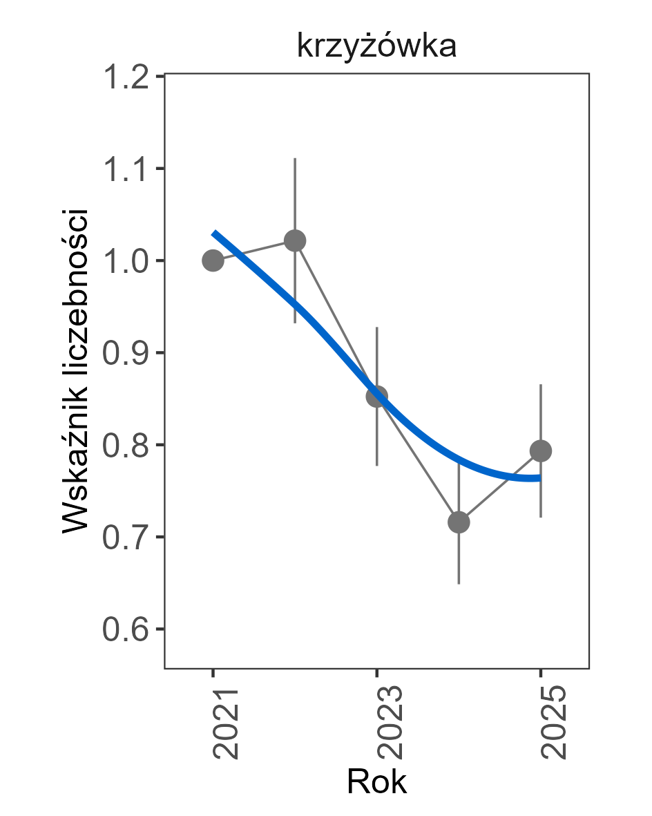 Wykresy zmian liczebności przedstawiono dla grupy 47 najbardziej rozpowszechnionych gatunków.