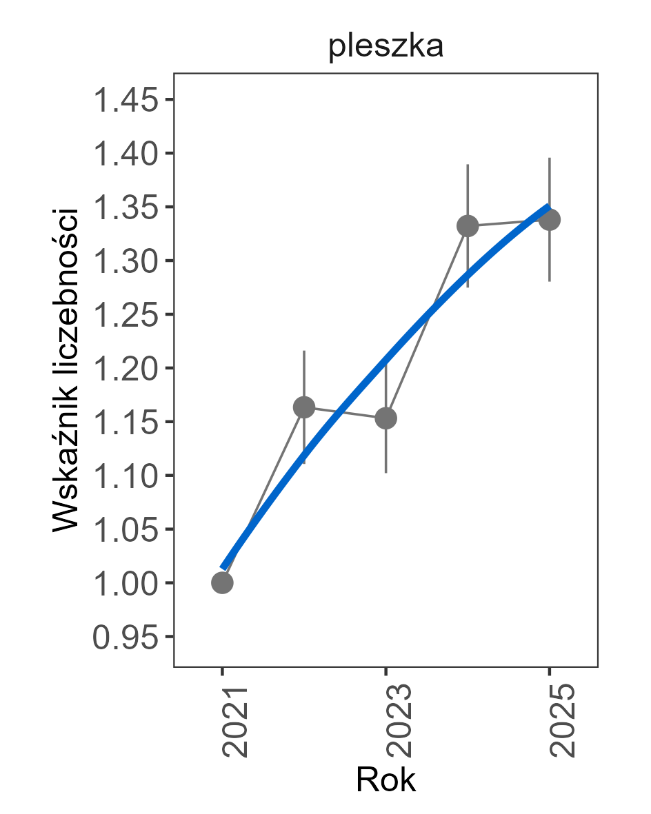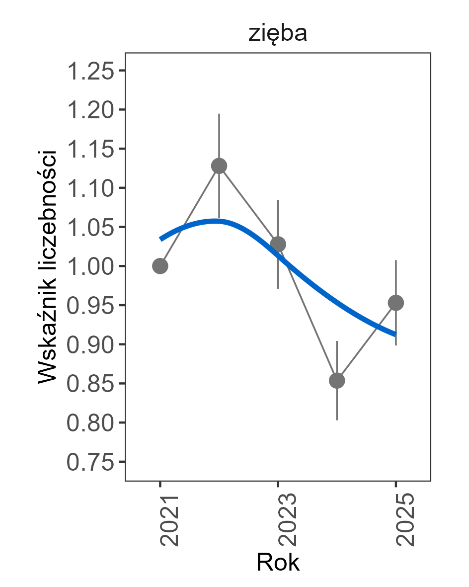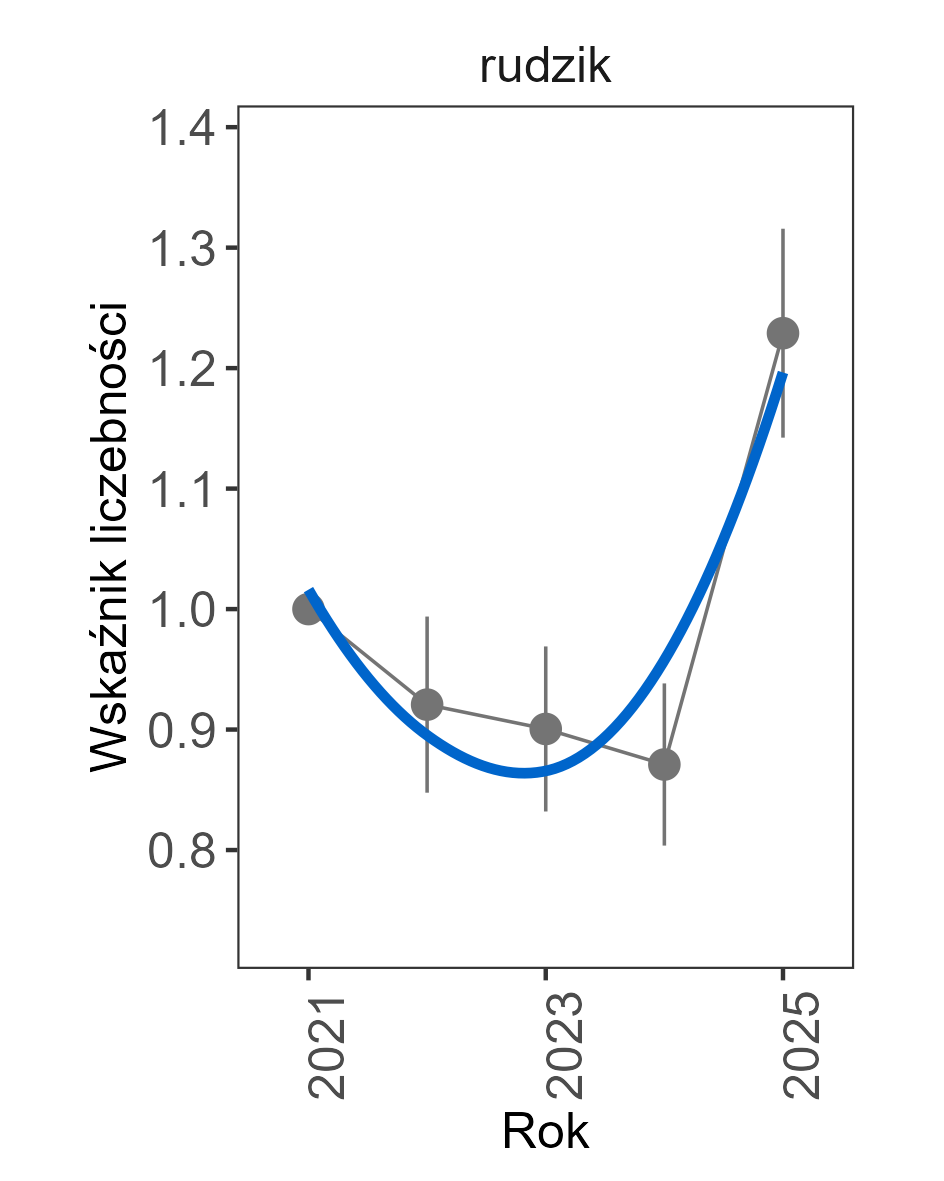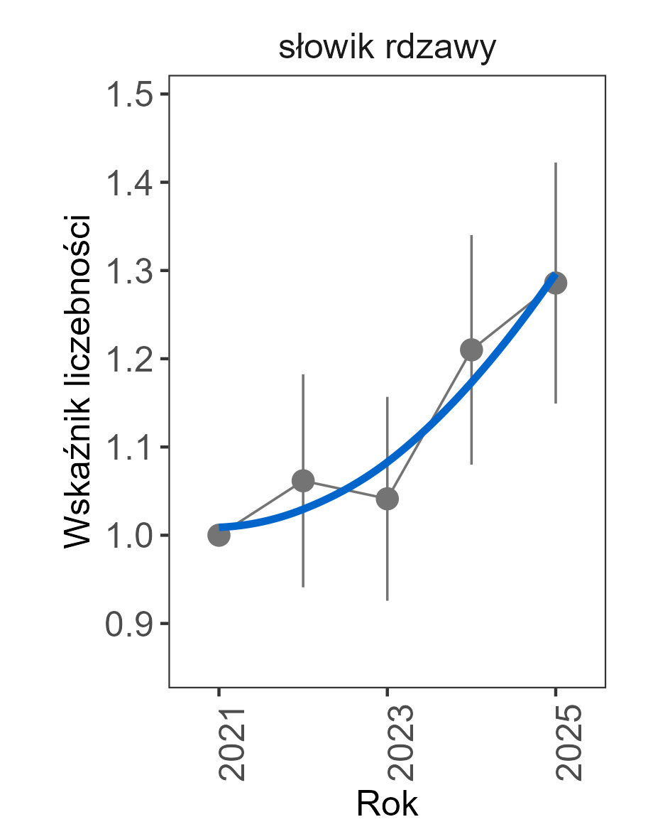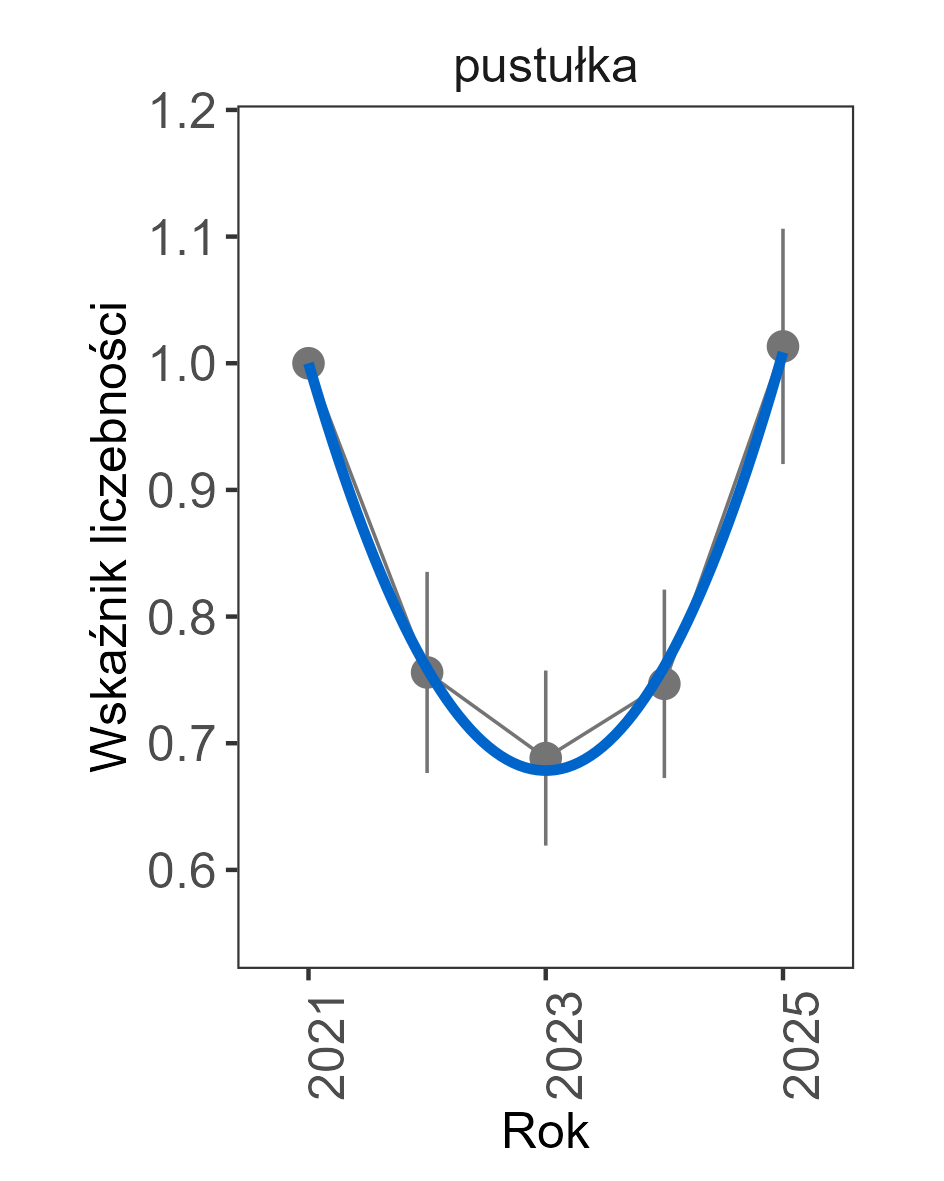 Wykresy zmian liczebności przedstawiono dla grupy 47 najbardziej rozpowszechnionych gatunków.