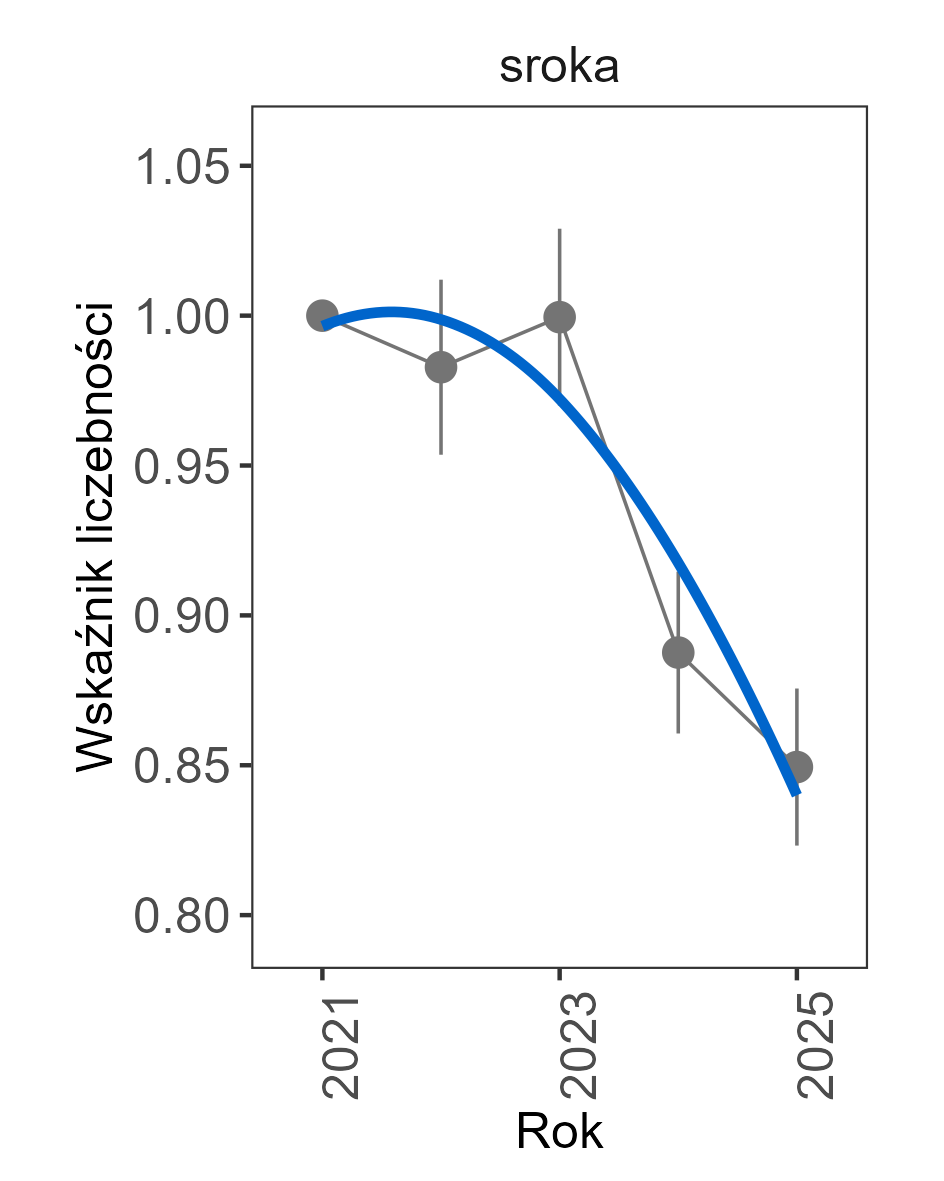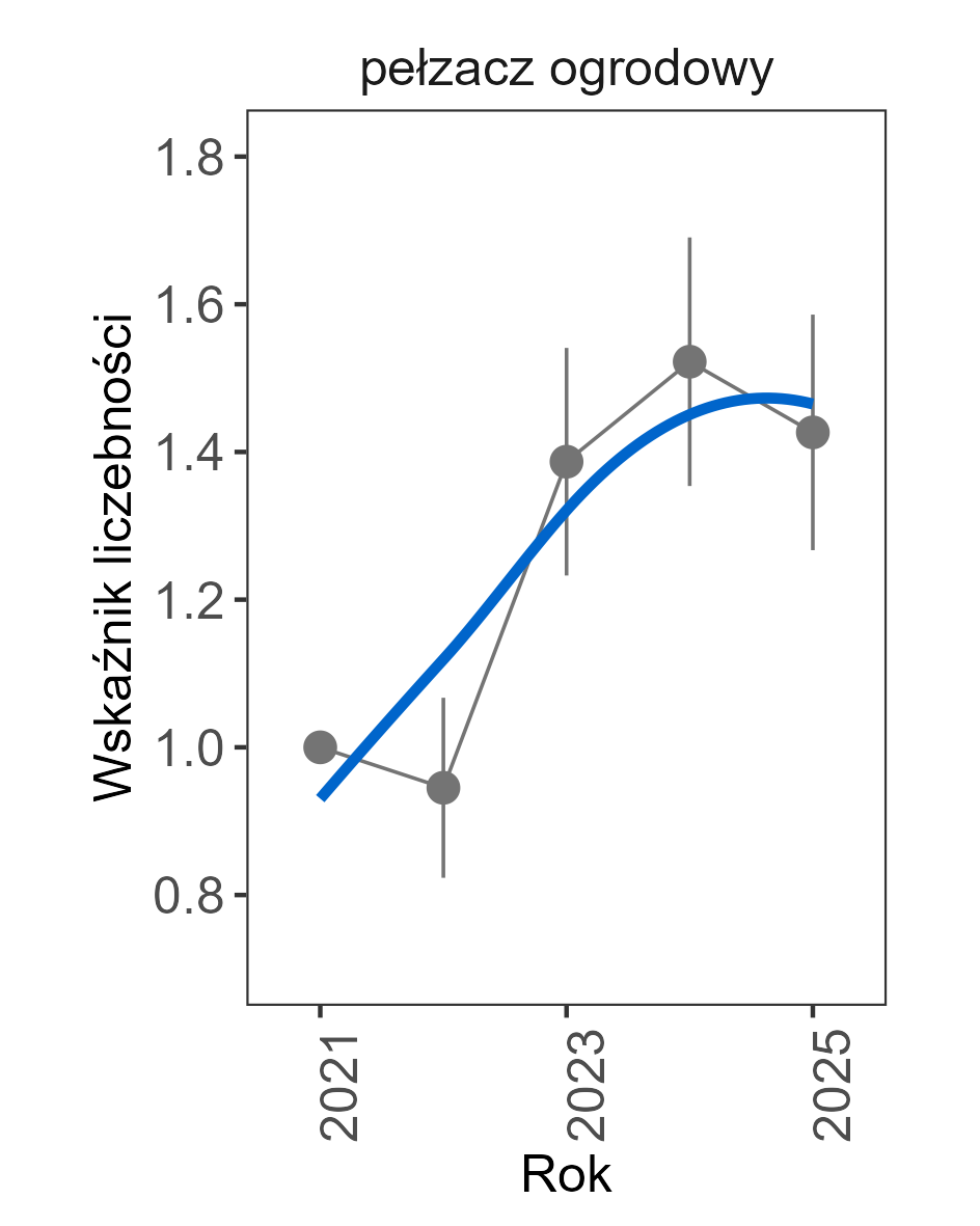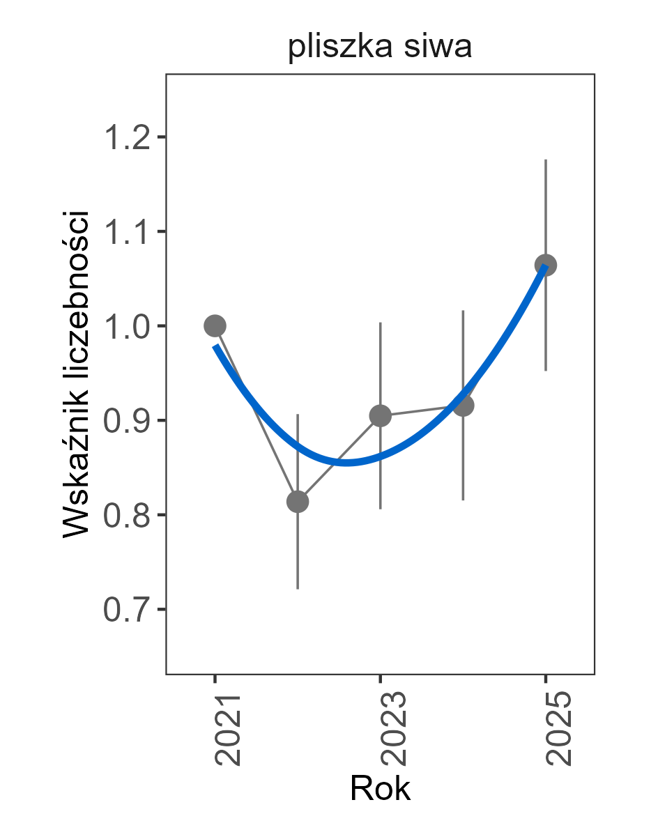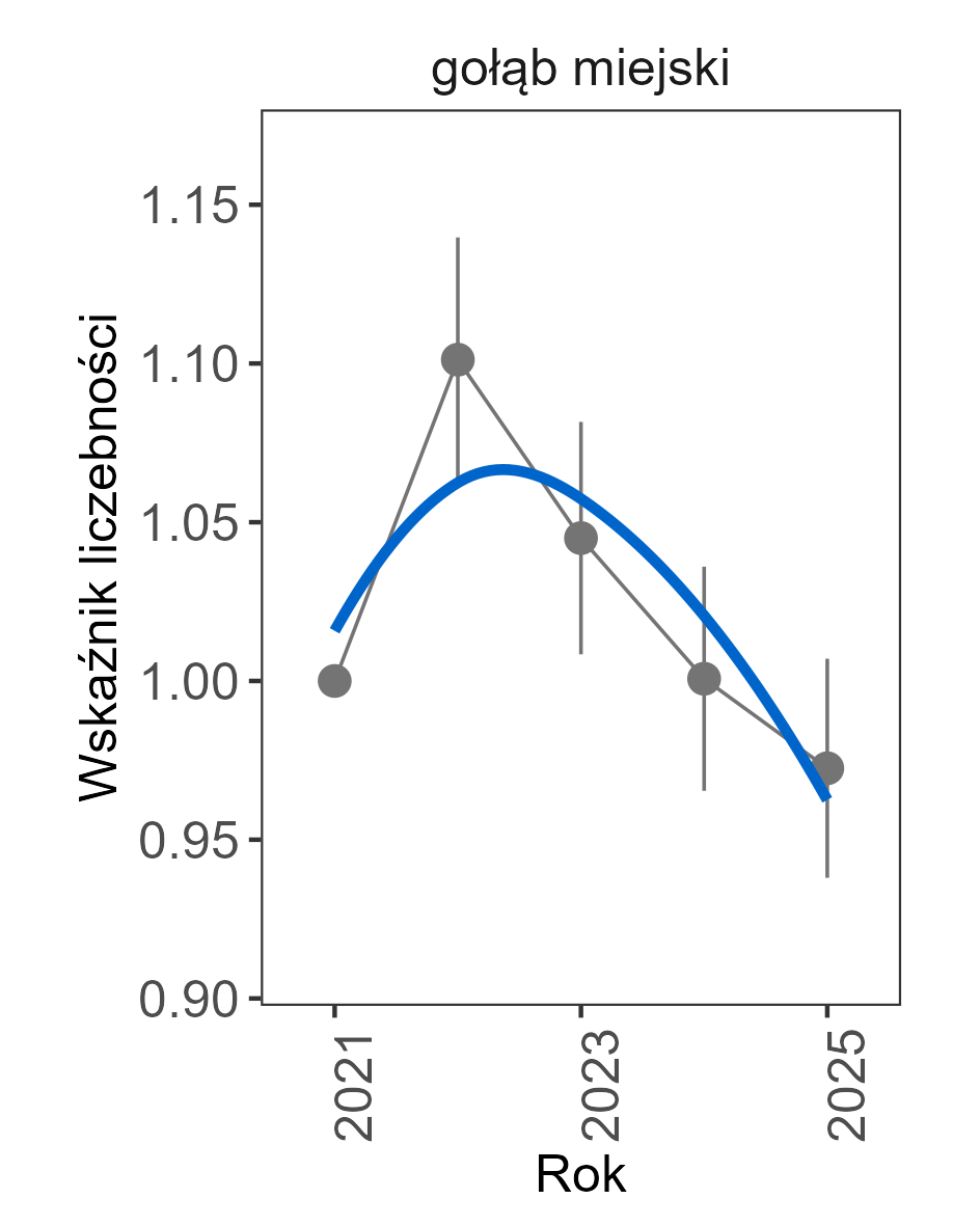 Dla 28 gatunków uzyskano istotne statystycznie trendy zmian liczebności. Silny wzrost wskaźnika liczebności odnotowano tylko u piegży. Umiarkowany wzrost wskaźnika liczebności zarejestrowano u 7 gatunków: jerzyka, dzięcioła dużego, dzięcioła zielonego, kapturki, pleszki, pełzacza ogrodowego, dymówki. Stabilne populacje stwierdzono u 11 gatunków: gołębia miejskiego, grzywacza, sierpówki, kawki, wrony siwej, kosa, kwiczoła, kopciuszka, pierwiosnka, szpaka i modraszki. Umiarkowany spadek wskaźnika liczebności odnotowano u 9 gatunków: krzyżówki, sroki, piecuszka, oknówki, bogatki, wróbla, mazurka, zięby i dzwońca.