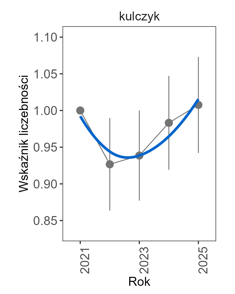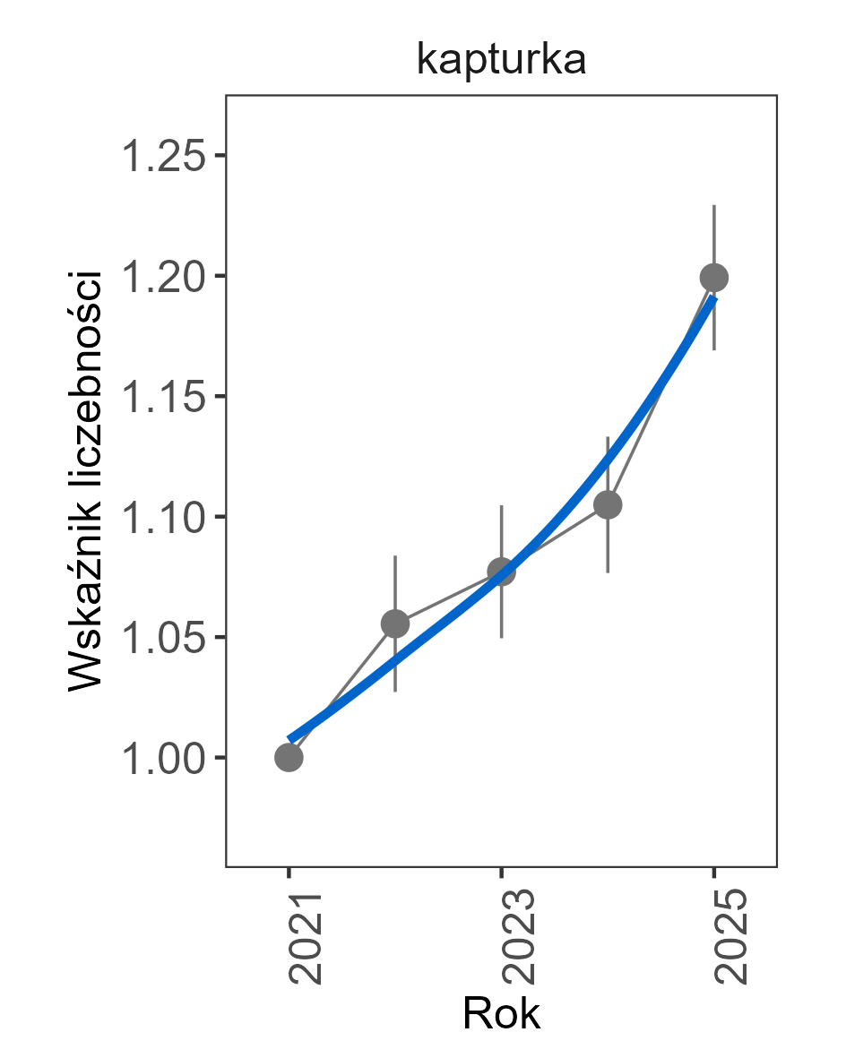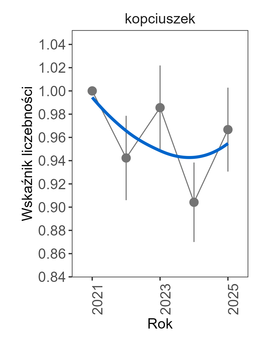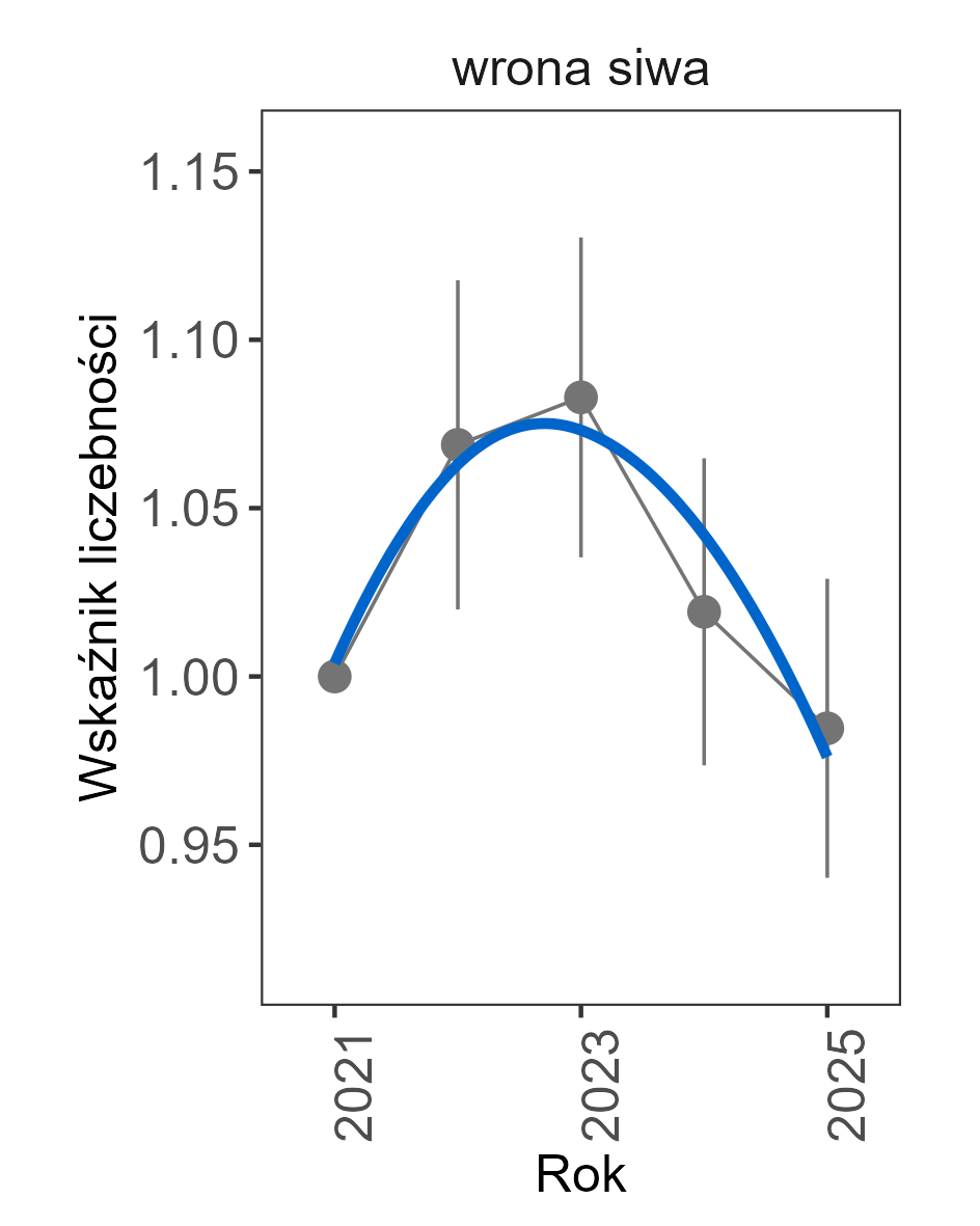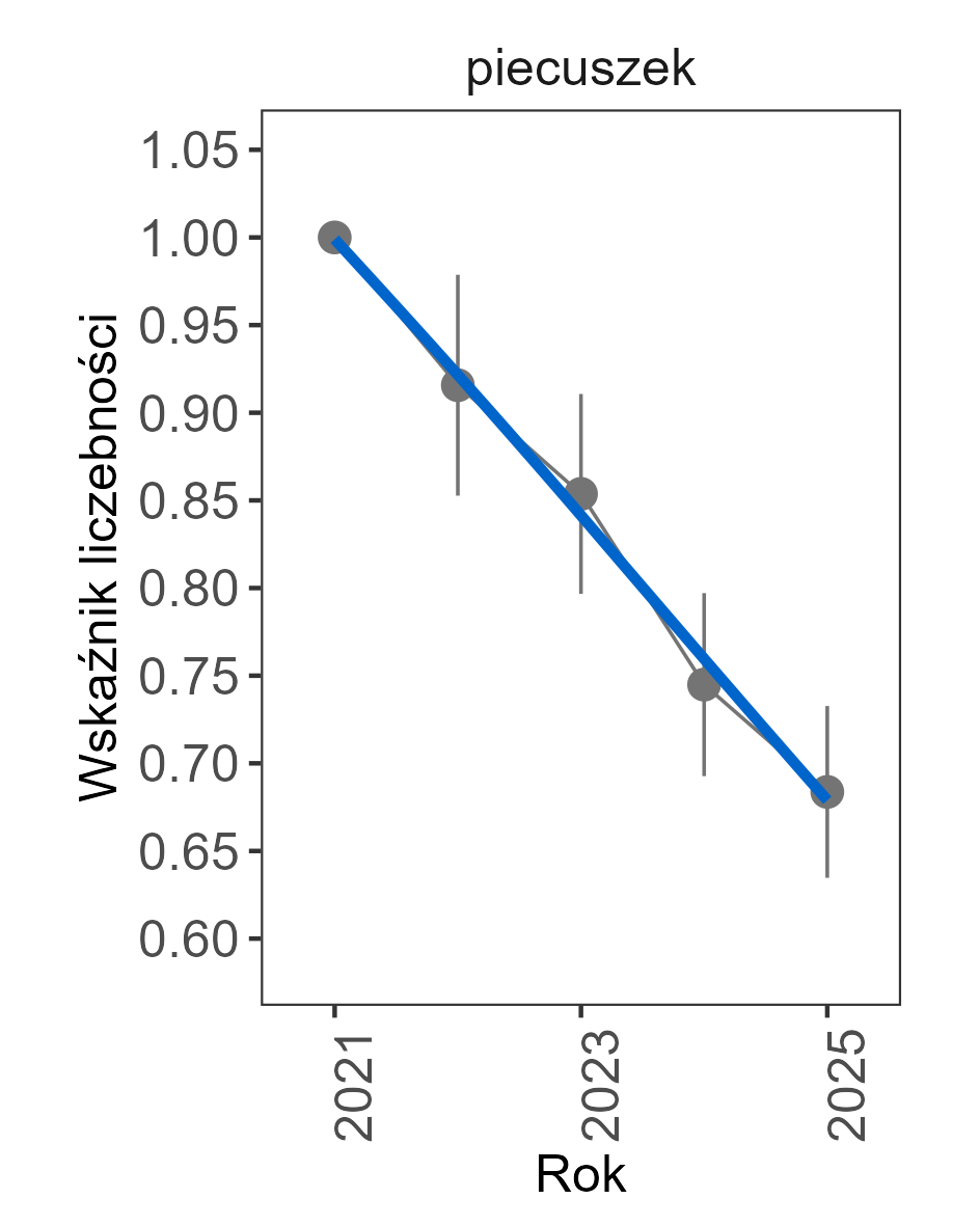 Dla 28 gatunków uzyskano istotne statystycznie trendy zmian liczebności. Silny wzrost wskaźnika liczebności odnotowano tylko u piegży. Umiarkowany wzrost wskaźnika liczebności zarejestrowano u 7 gatunków: jerzyka, dzięcioła dużego, dzięcioła zielonego, kapturki, pleszki, pełzacza ogrodowego, dymówki. Stabilne populacje stwierdzono u 11 gatunków: gołębia miejskiego, grzywacza, sierpówki, kawki, wrony siwej, kosa, kwiczoła, kopciuszka, pierwiosnka, szpaka i modraszki. Umiarkowany spadek wskaźnika liczebności odnotowano u 9 gatunków: krzyżówki, sroki, piecuszka, oknówki, bogatki, wróbla, mazurka, zięby i dzwońca.