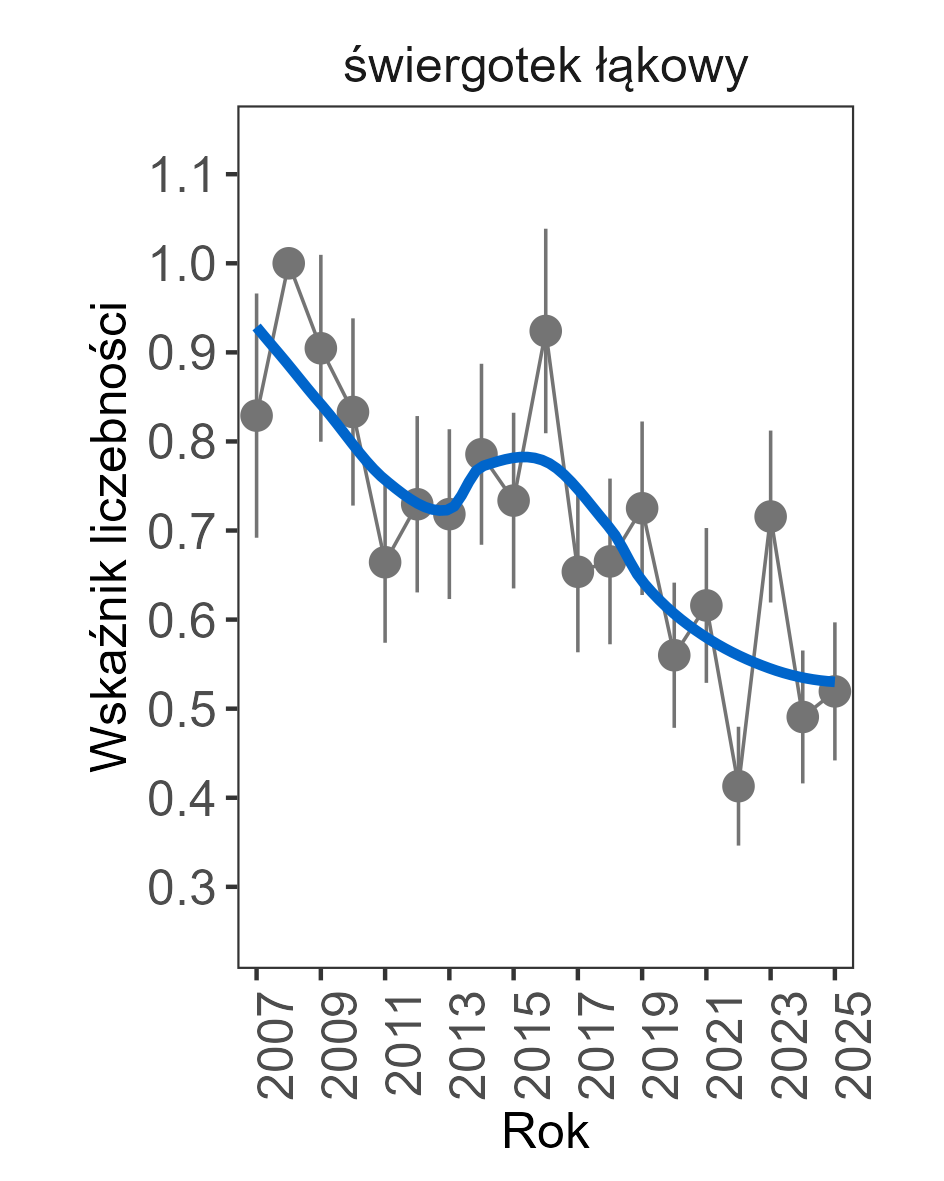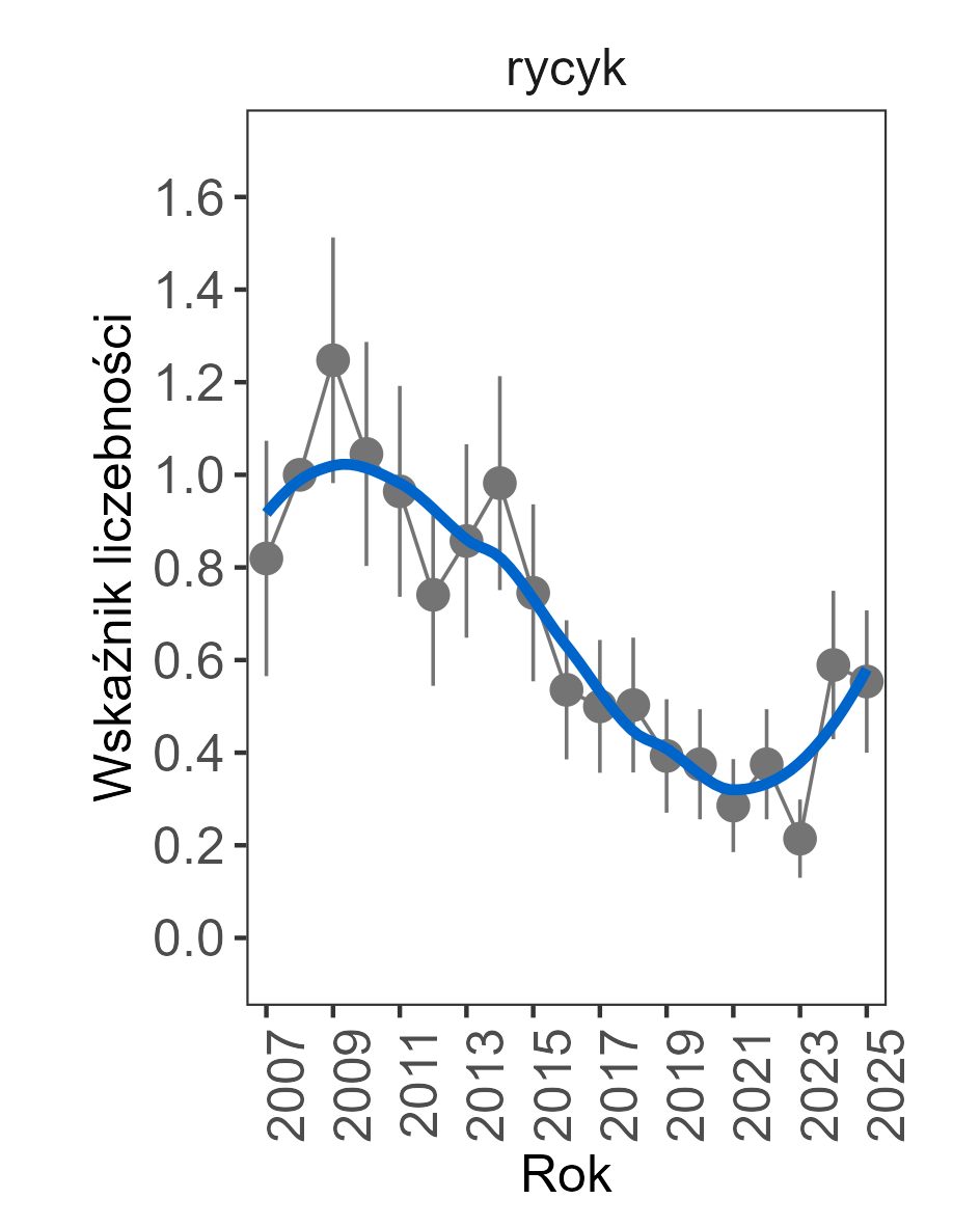 Wśród gatunków o sprecyzowanych trendach liczebności od początku programu zanotowano istotne spadki liczebności 17 gatunków. Najsilniej w tym okresie spadała liczebność: rycyka (–7,2% rocznie), krwawodzioba (–5,1% rocznie), remiza (–5,1%), błotniaka łąkowego (–4,5% rocznie), słowika szarego (–4,1%), świerszczaka (–3,4%) oraz świergotka łąkowego i pokląskwy (oba –3,2% rocznie).