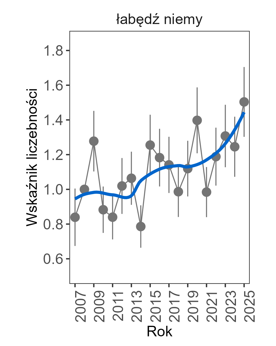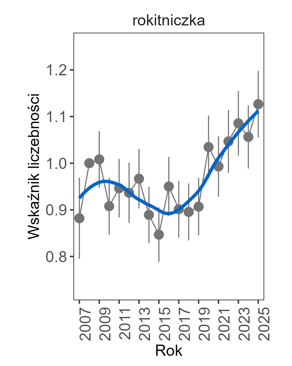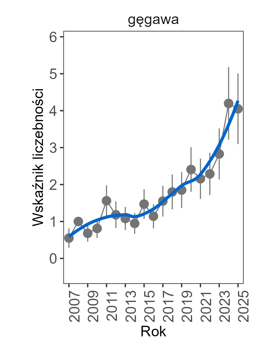 W przypadku 18 gatunków odnotowano trend wzrostowy, w tym silny wzrost u gęgawy (+9,4% rocznie) i słowika rdzawego (+7,6% rocznie).