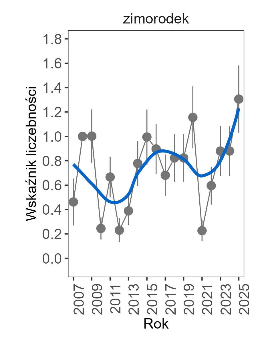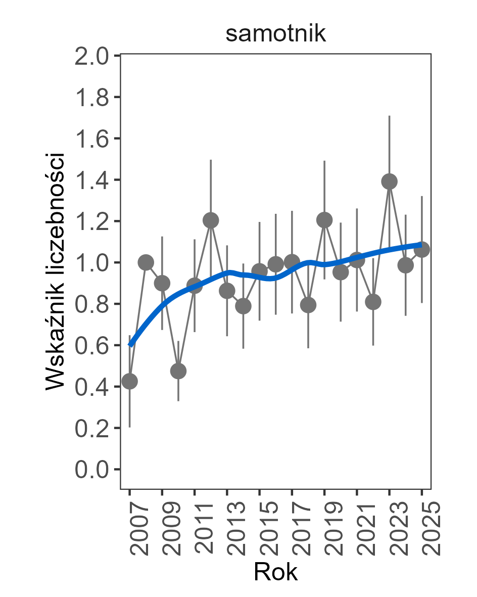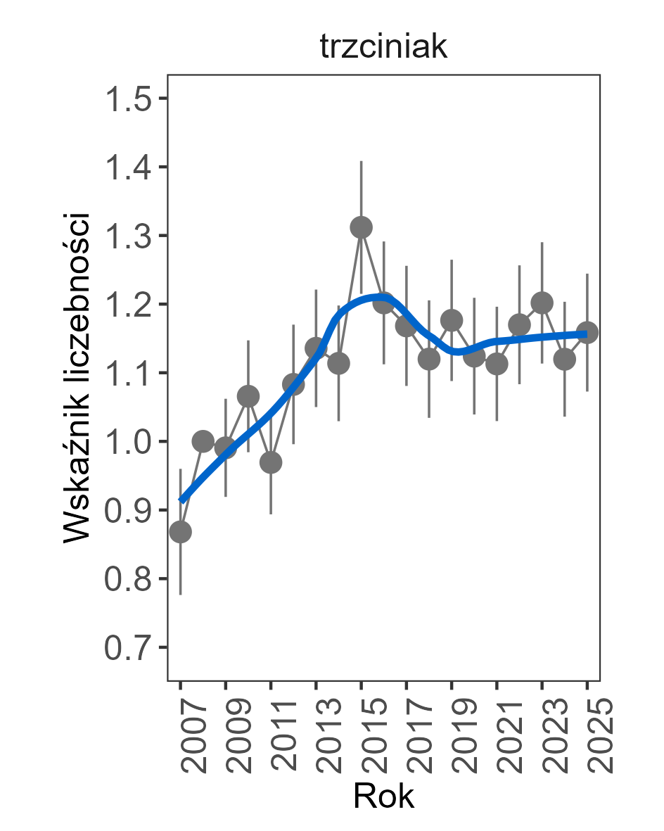 W przypadku 18 gatunków odnotowano trend wzrostowy, w tym silny wzrost u gęgawy (+9,4% rocznie) i słowika rdzawego (+7,6% rocznie).