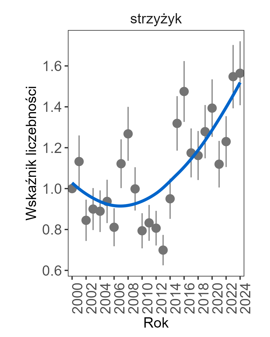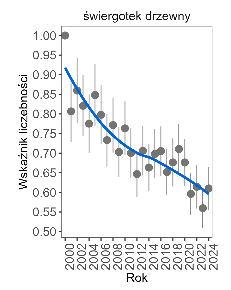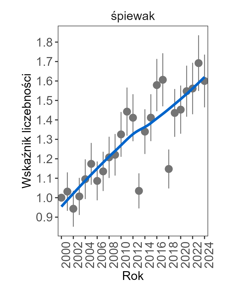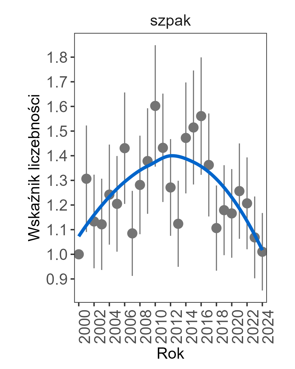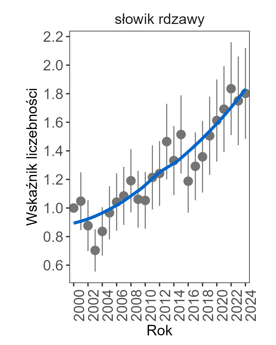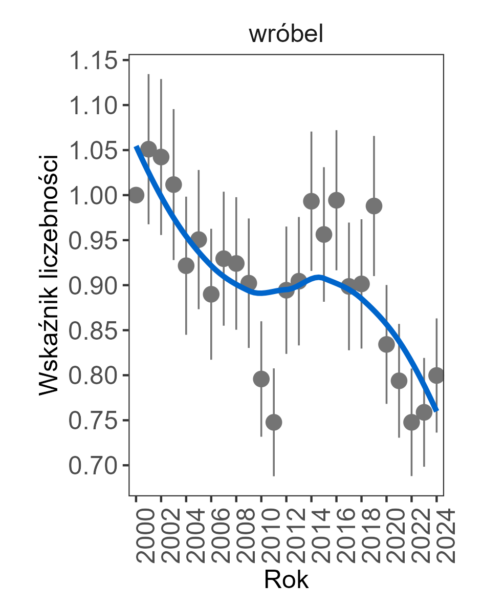 W ciągu 25 lat badań odnotowano umiarkowany wzrost liczebności 100 najszerzej rozpowszechnionych gatunków ptaków w Polsce. Wartość wskaźnika w roku 2024 wynosiła 1,0368, a średnie roczne tempo zmian w latach 2000-2024 – 0,23% . Jednak w okresie krótkoterminowym (ostatnie 12 lat) wartości wskaźnika zaczęły się zmniejszać, a jego krótkoterminowy trend okazał się być spadkowy.