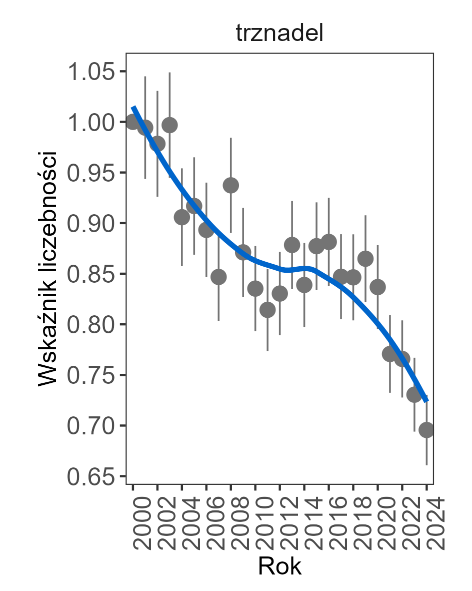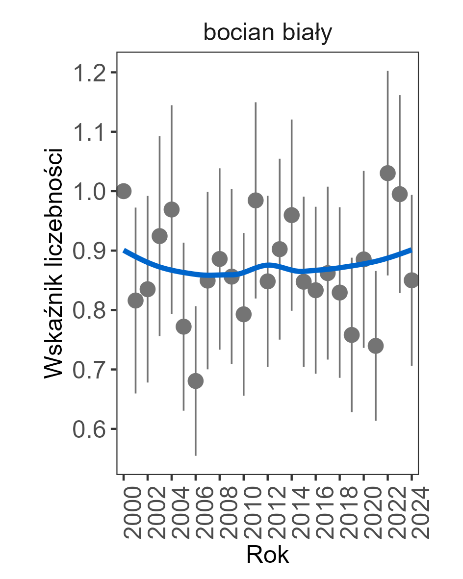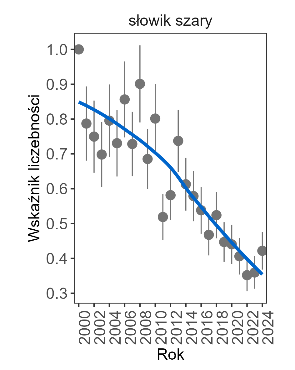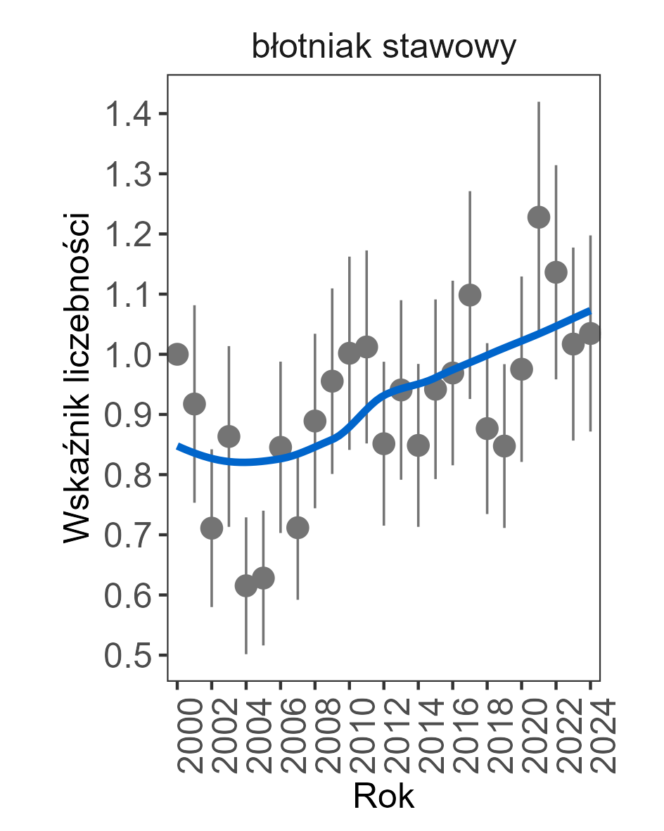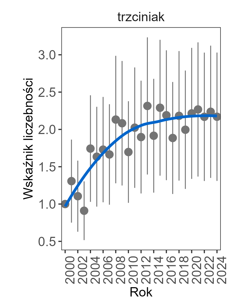 W ciągu 25 lat badań odnotowano umiarkowany wzrost liczebności 100 najszerzej rozpowszechnionych gatunków ptaków w Polsce. Wartość wskaźnika w roku 2024 wynosiła 1,0368, a średnie roczne tempo zmian w latach 2000-2024 – 0,23% . Jednak w okresie krótkoterminowym (ostatnie 12 lat) wartości wskaźnika zaczęły się zmniejszać, a jego krótkoterminowy trend okazał się być spadkowy.
