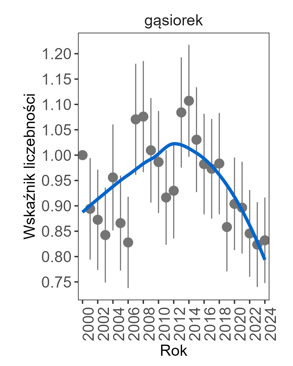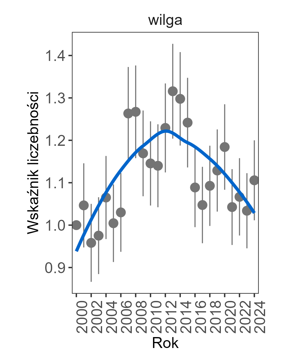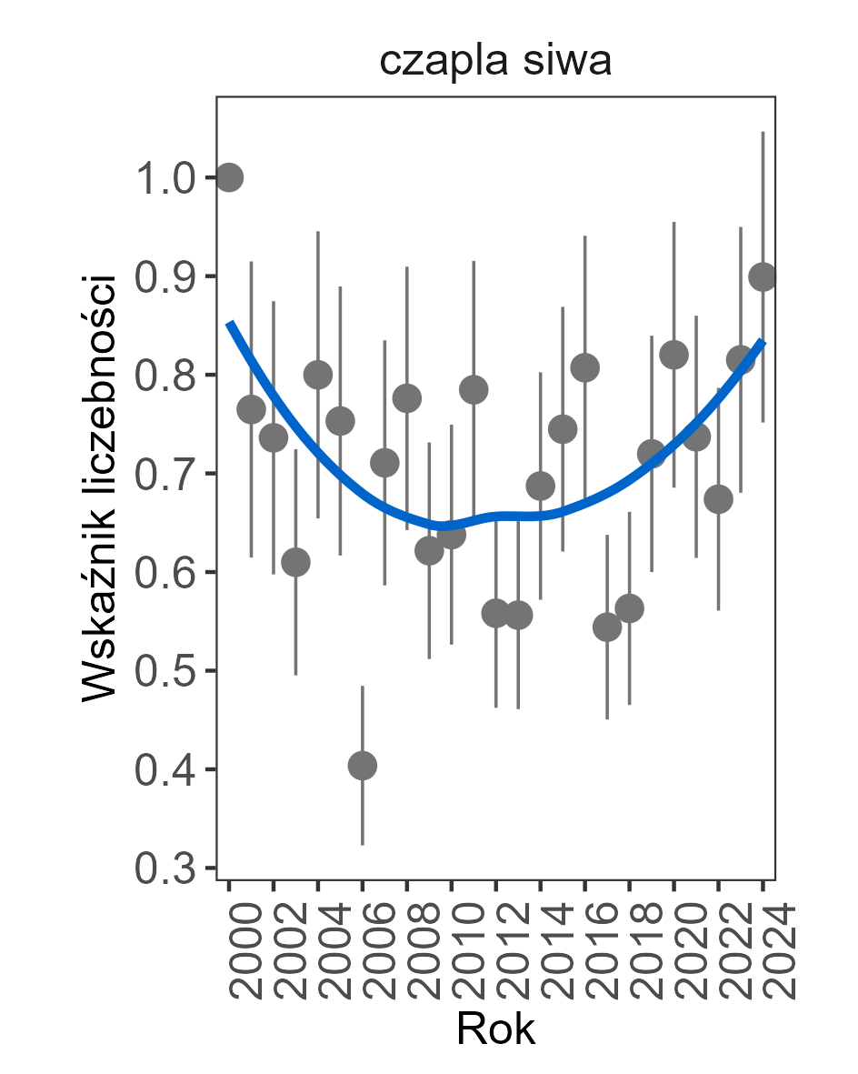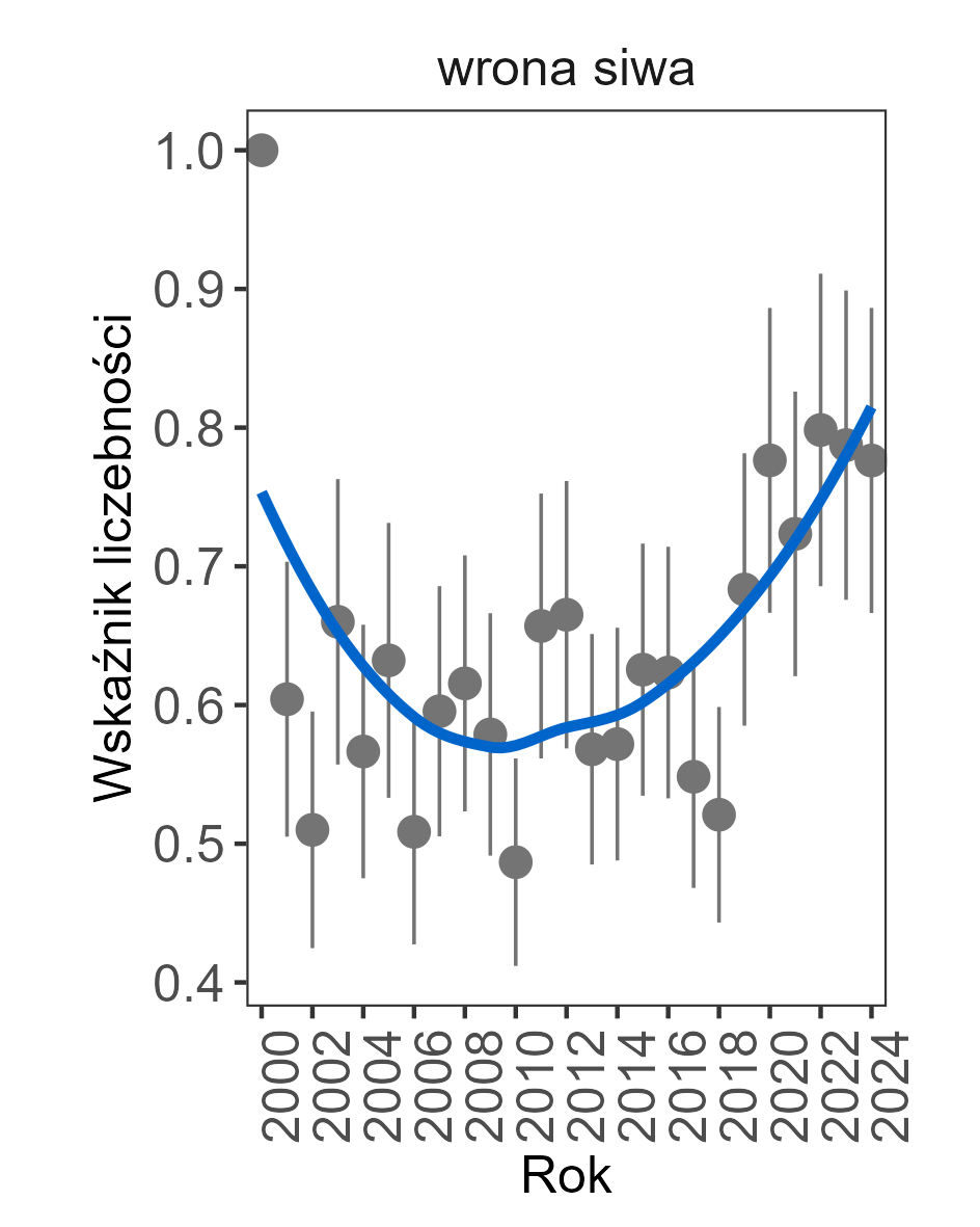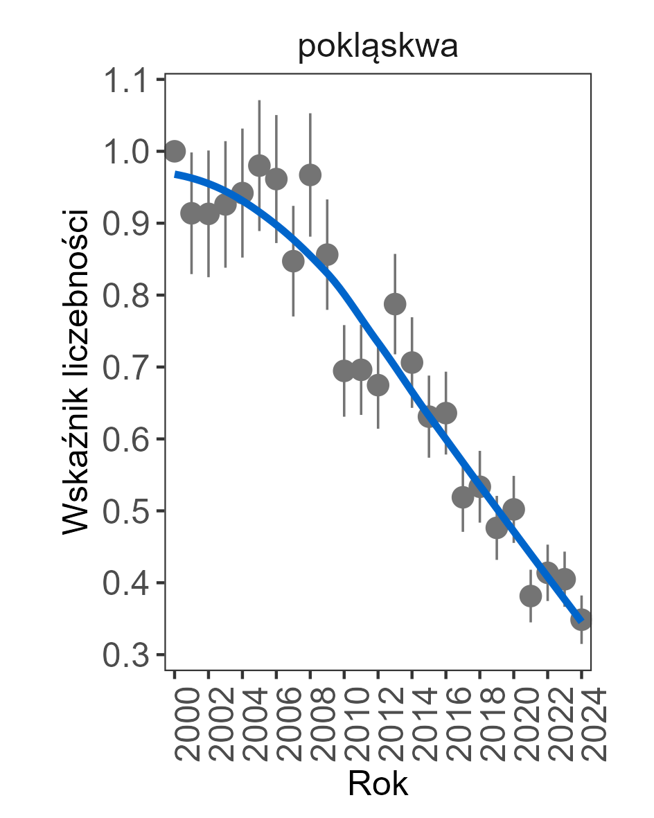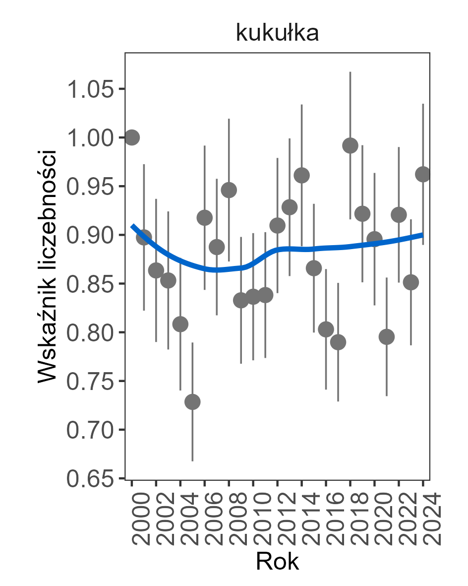 W ciągu 25 lat badań odnotowano umiarkowany wzrost liczebności 100 najszerzej rozpowszechnionych gatunków ptaków w Polsce. Wartość wskaźnika w roku 2024 wynosiła 1,0368, a średnie roczne tempo zmian w latach 2000-2024 – 0,23% . Jednak w okresie krótkoterminowym (ostatnie 12 lat) wartości wskaźnika zaczęły się zmniejszać, a jego krótkoterminowy trend okazał się być spadkowy.