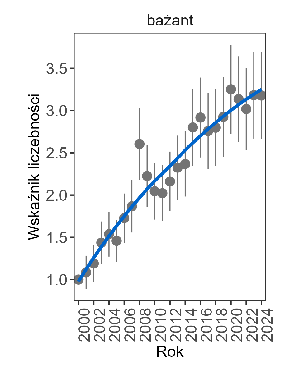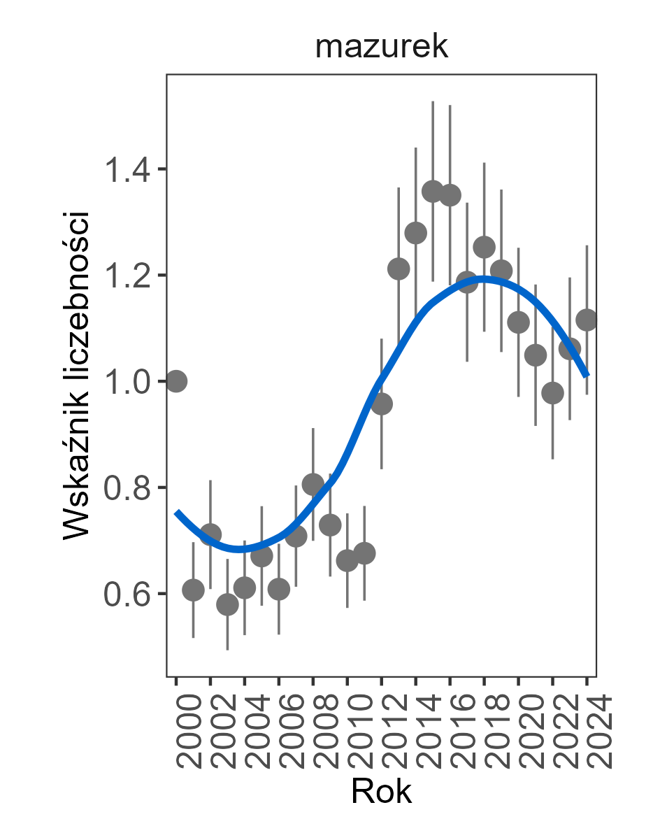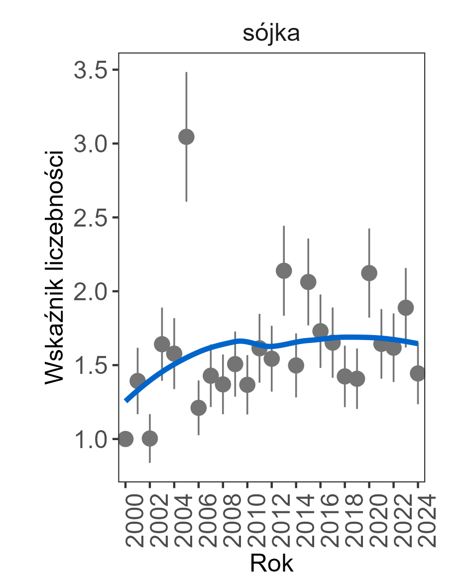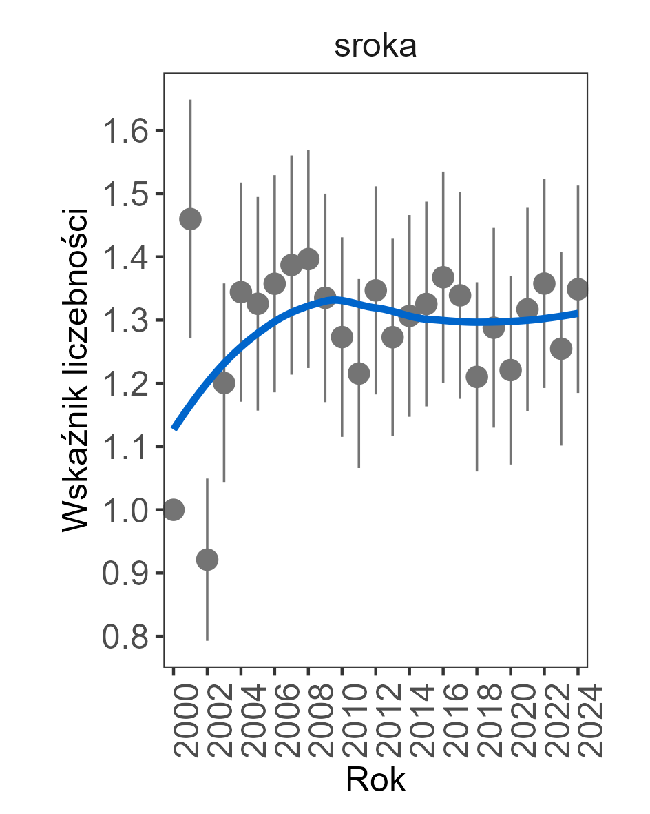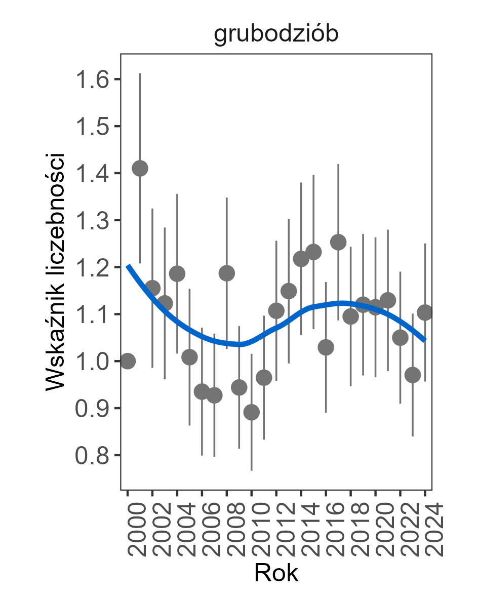 W ciągu 25 lat badań odnotowano umiarkowany wzrost liczebności 100 najszerzej rozpowszechnionych gatunków ptaków w Polsce. Wartość wskaźnika w roku 2024 wynosiła 1,0368, a średnie roczne tempo zmian w latach 2000-2024 – 0,23% . Jednak w okresie krótkoterminowym (ostatnie 12 lat) wartości wskaźnika zaczęły się zmniejszać, a jego krótkoterminowy trend okazał się być spadkowy.