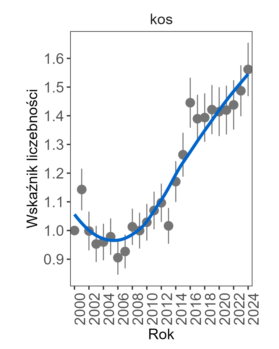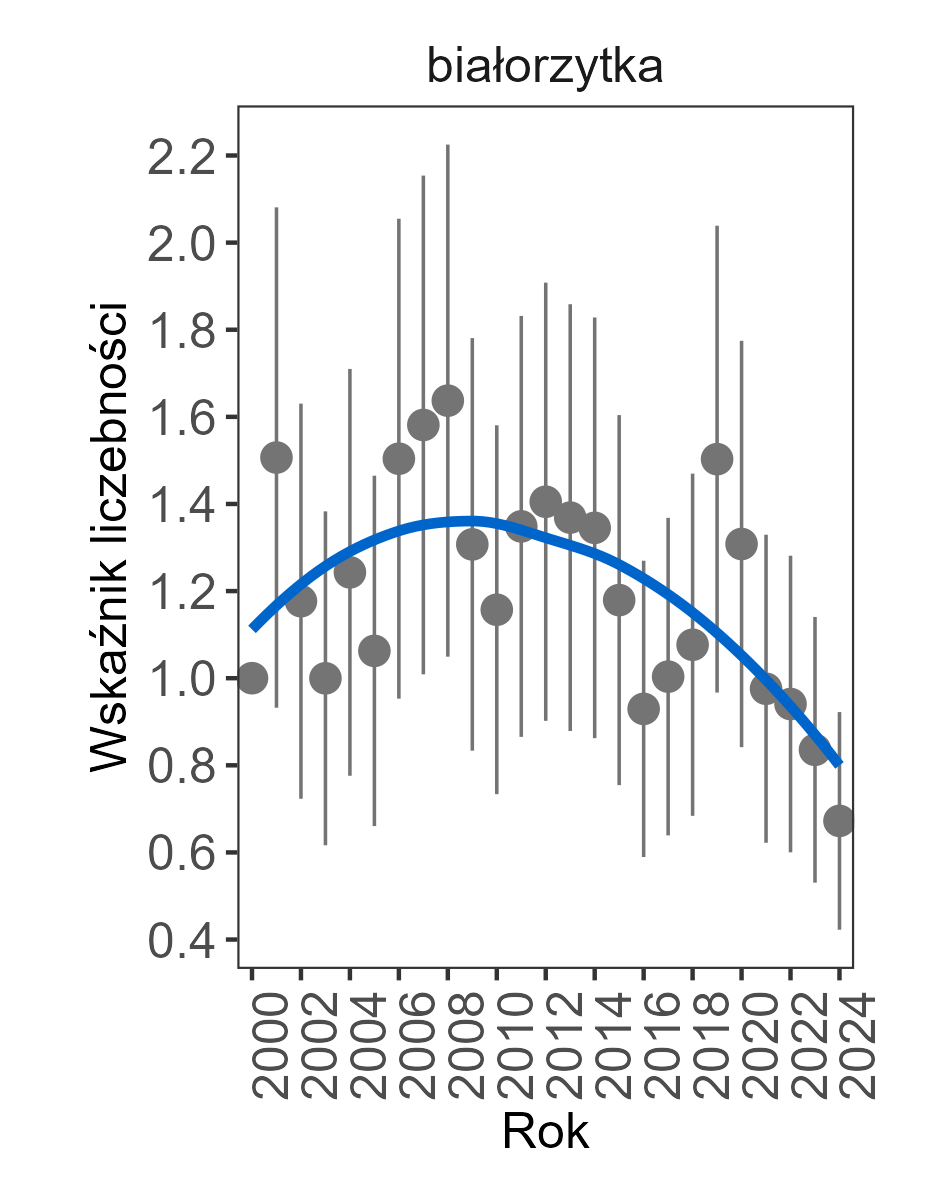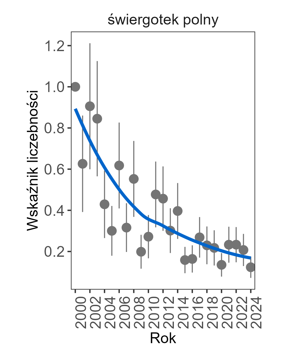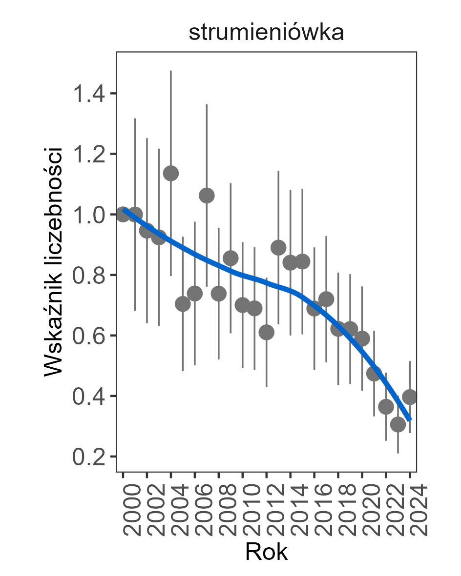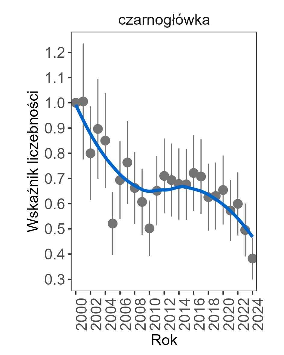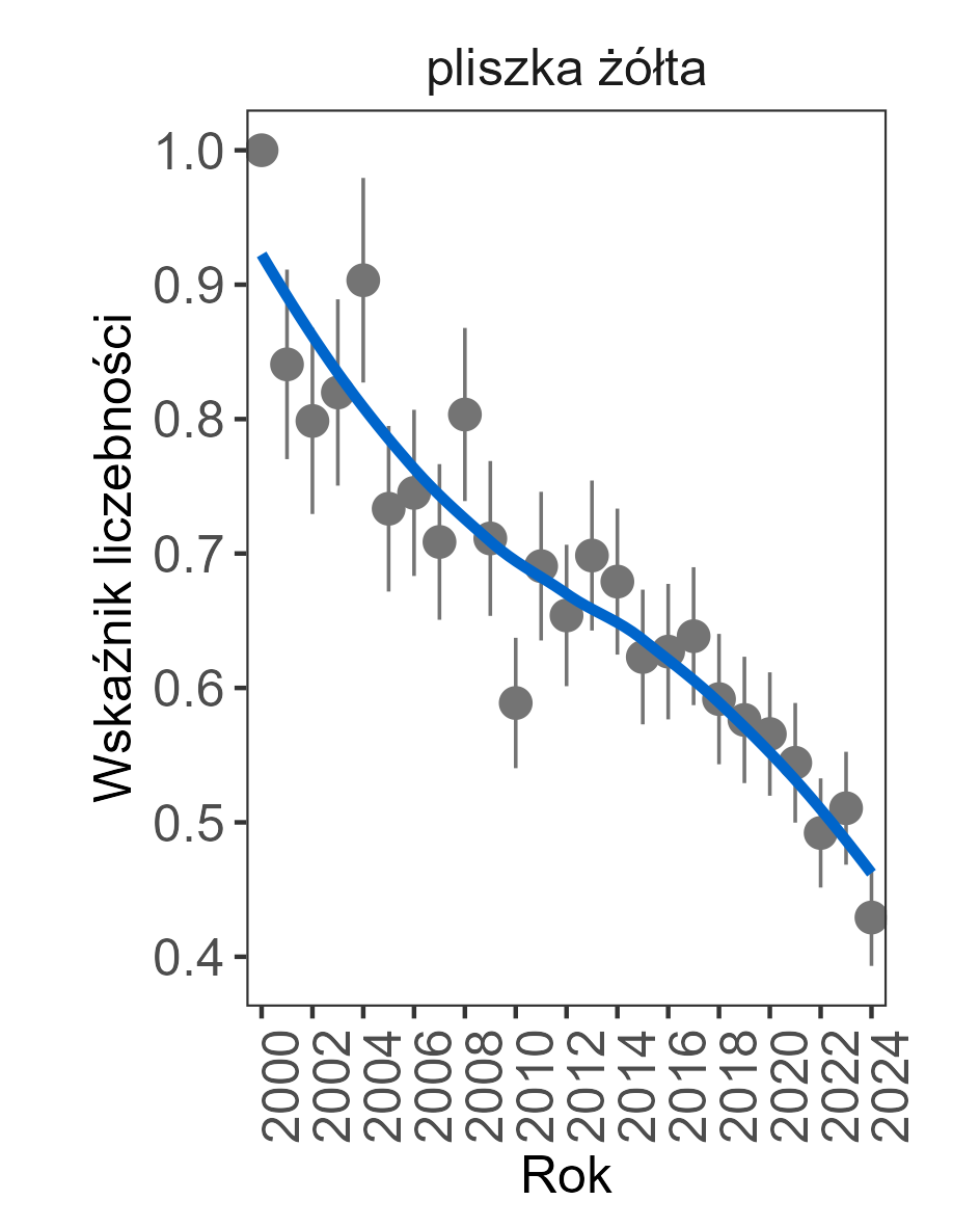 W ciągu 25 lat badań odnotowano umiarkowany wzrost liczebności 100 najszerzej rozpowszechnionych gatunków ptaków w Polsce. Wartość wskaźnika w roku 2024 wynosiła 1,0368, a średnie roczne tempo zmian w latach 2000-2024 – 0,23% . Jednak w okresie krótkoterminowym (ostatnie 12 lat) wartości wskaźnika zaczęły się zmniejszać, a jego krótkoterminowy trend okazał się być spadkowy.