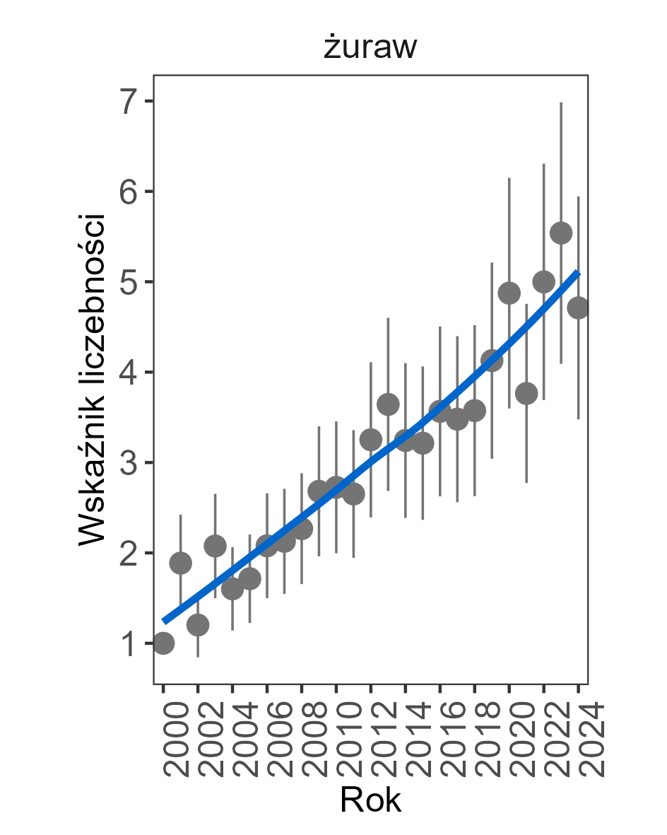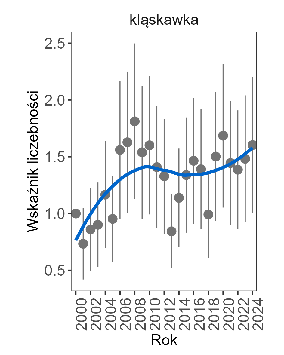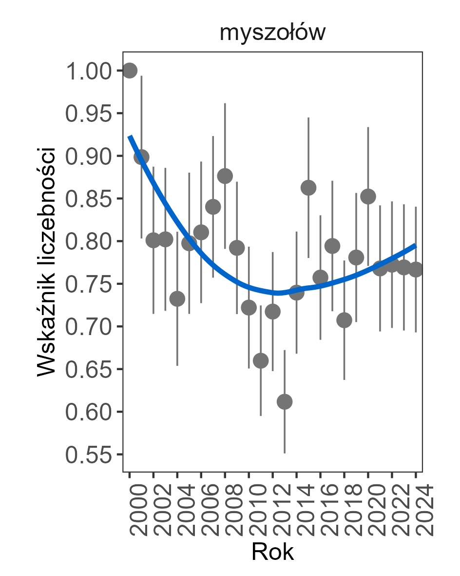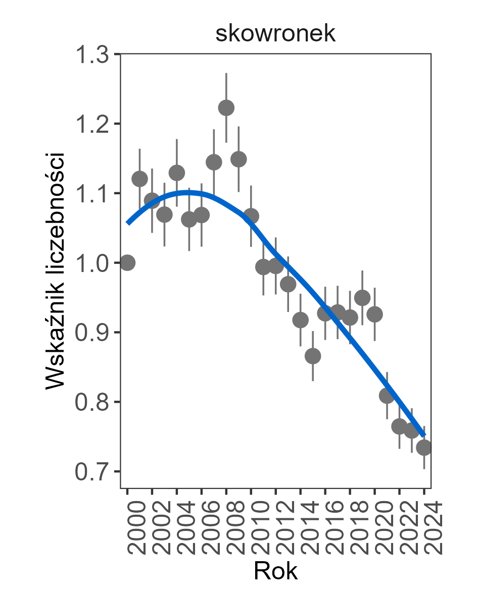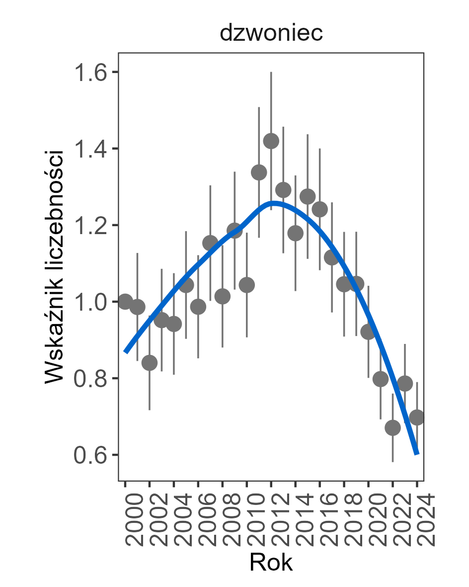 W ciągu 25 lat badań odnotowano umiarkowany wzrost liczebności 100 najszerzej rozpowszechnionych gatunków ptaków w Polsce. Wartość wskaźnika w roku 2024 wynosiła 1,0368, a średnie roczne tempo zmian w latach 2000-2024 – 0,23% . Jednak w okresie krótkoterminowym (ostatnie 12 lat) wartości wskaźnika zaczęły się zmniejszać, a jego krótkoterminowy trend okazał się być spadkowy.