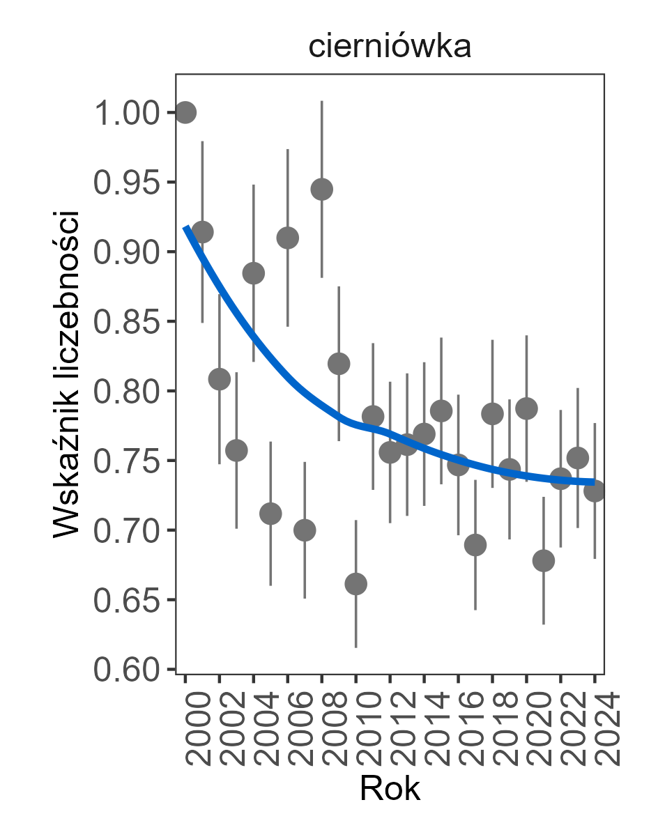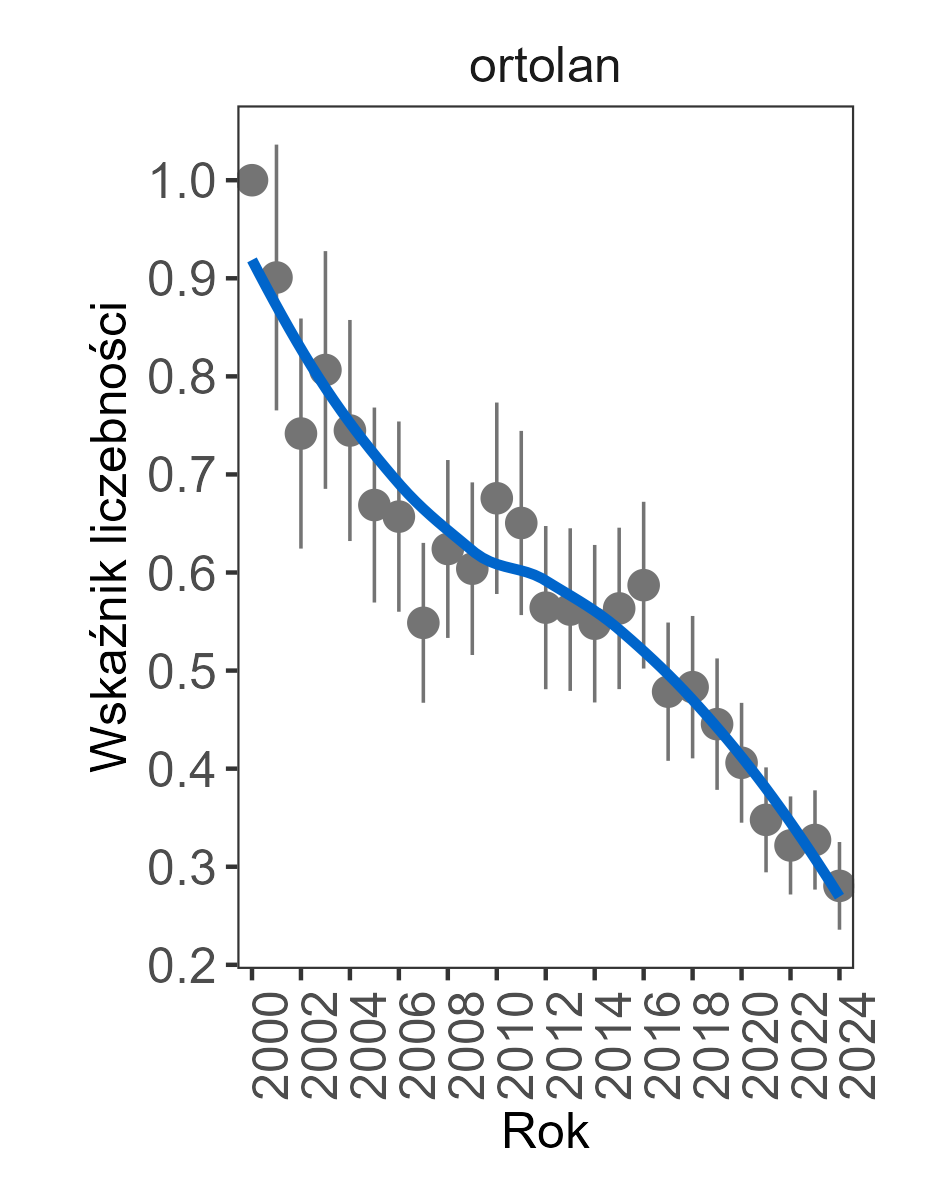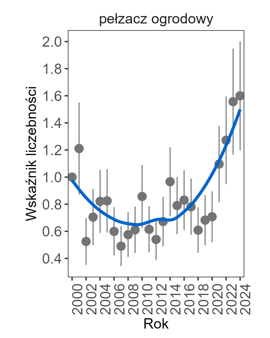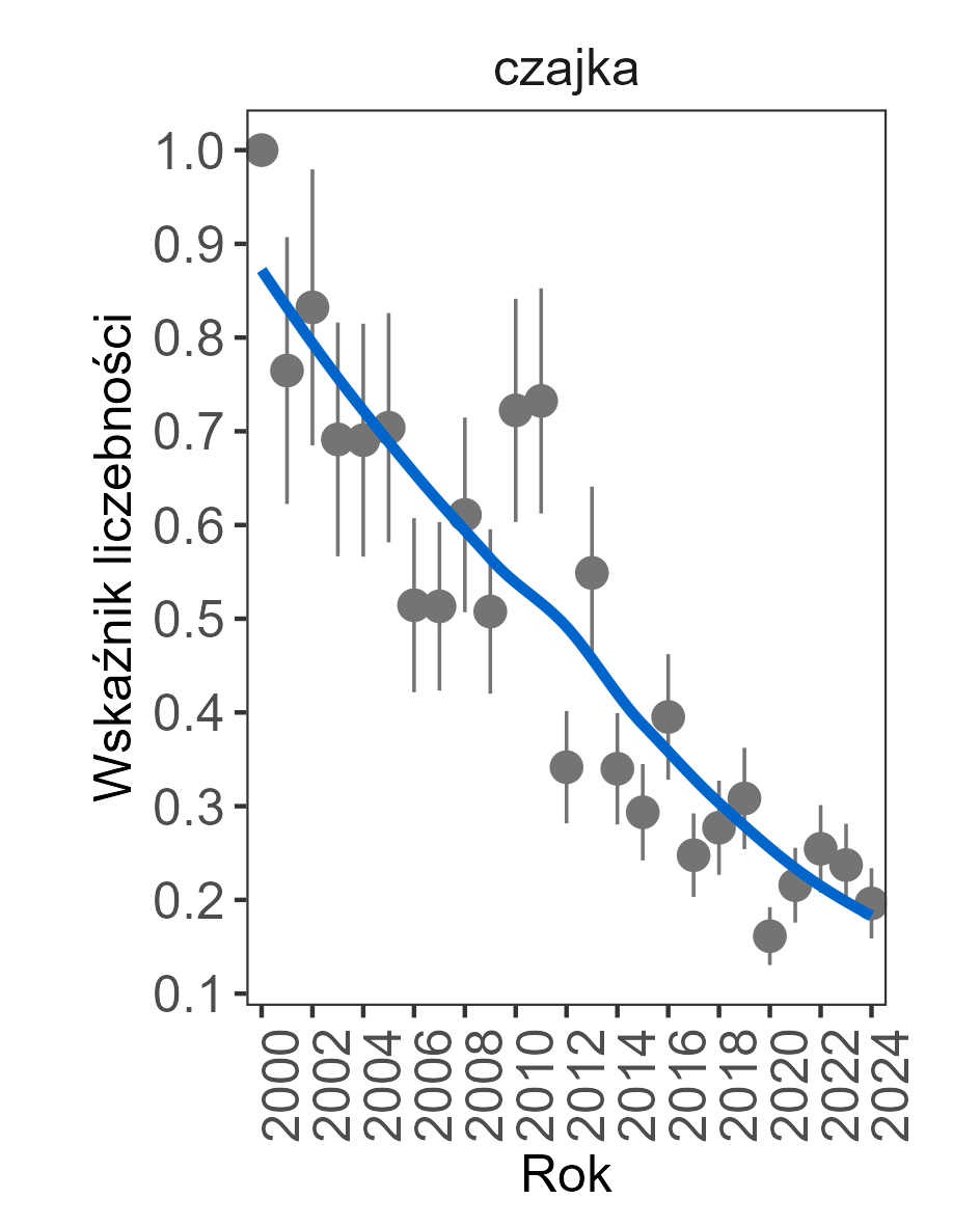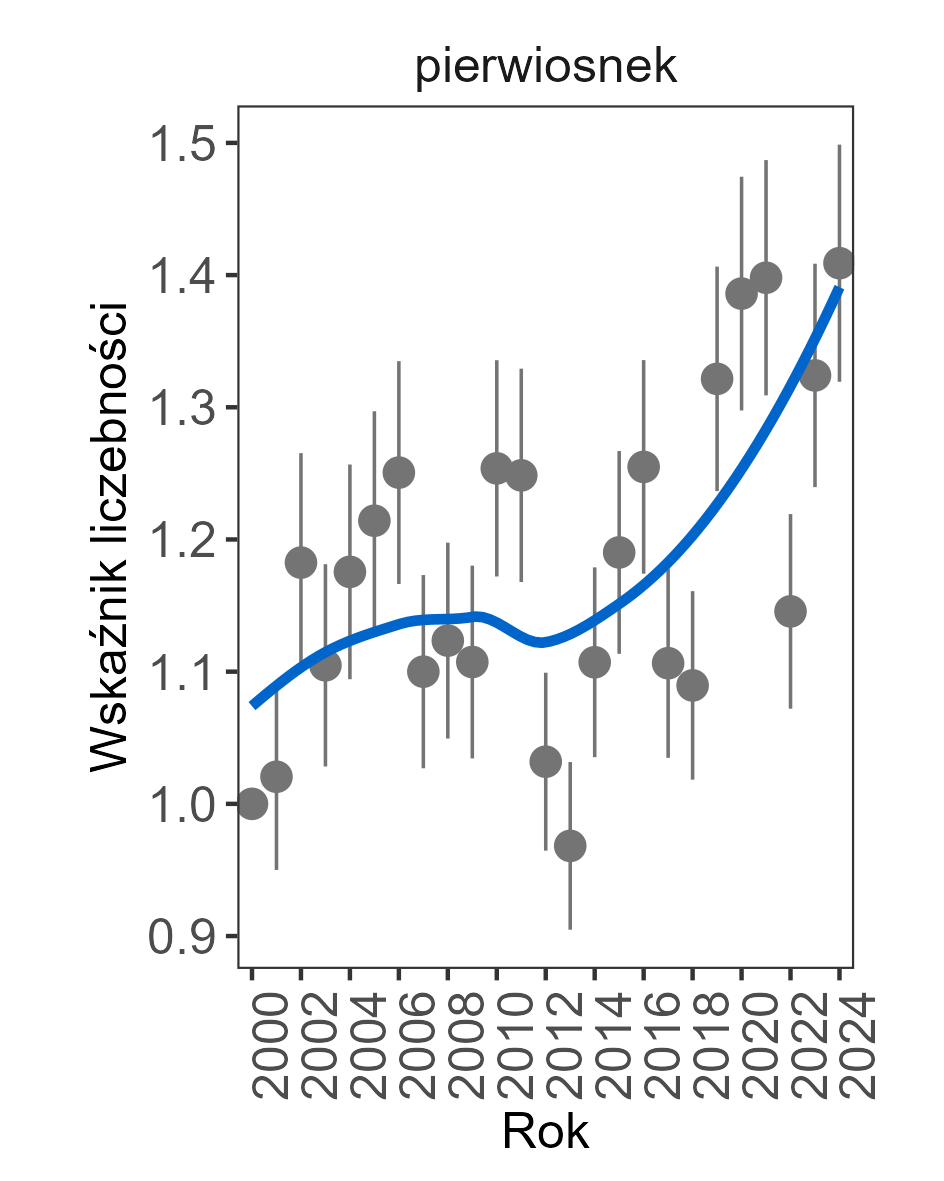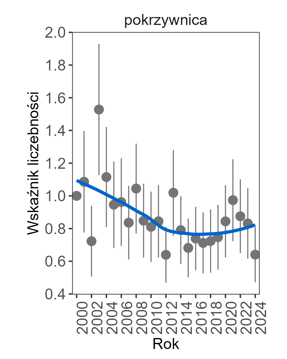 W ciągu 25 lat badań odnotowano umiarkowany wzrost liczebności 100 najszerzej rozpowszechnionych gatunków ptaków w Polsce. Wartość wskaźnika w roku 2024 wynosiła 1,0368, a średnie roczne tempo zmian w latach 2000-2024 – 0,23% . Jednak w okresie krótkoterminowym (ostatnie 12 lat) wartości wskaźnika zaczęły się zmniejszać, a jego krótkoterminowy trend okazał się być spadkowy.