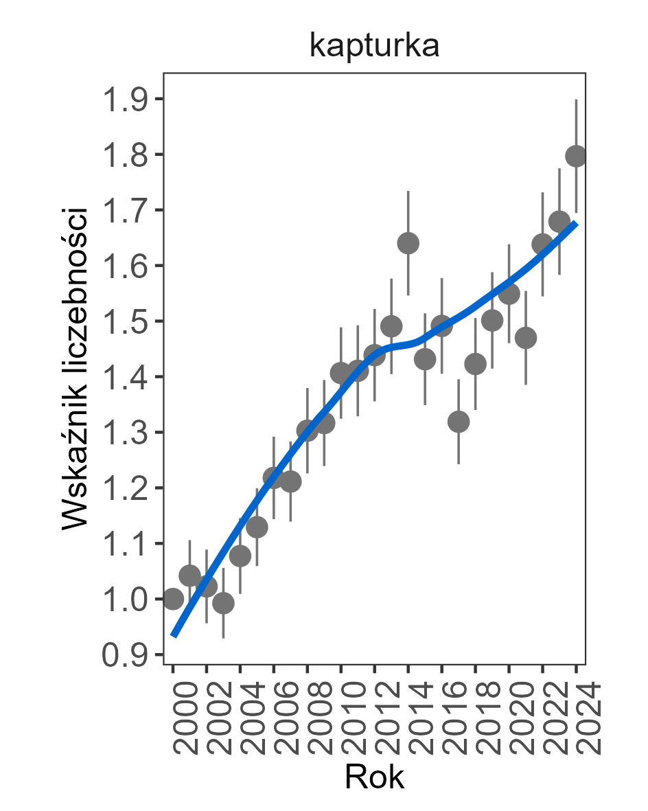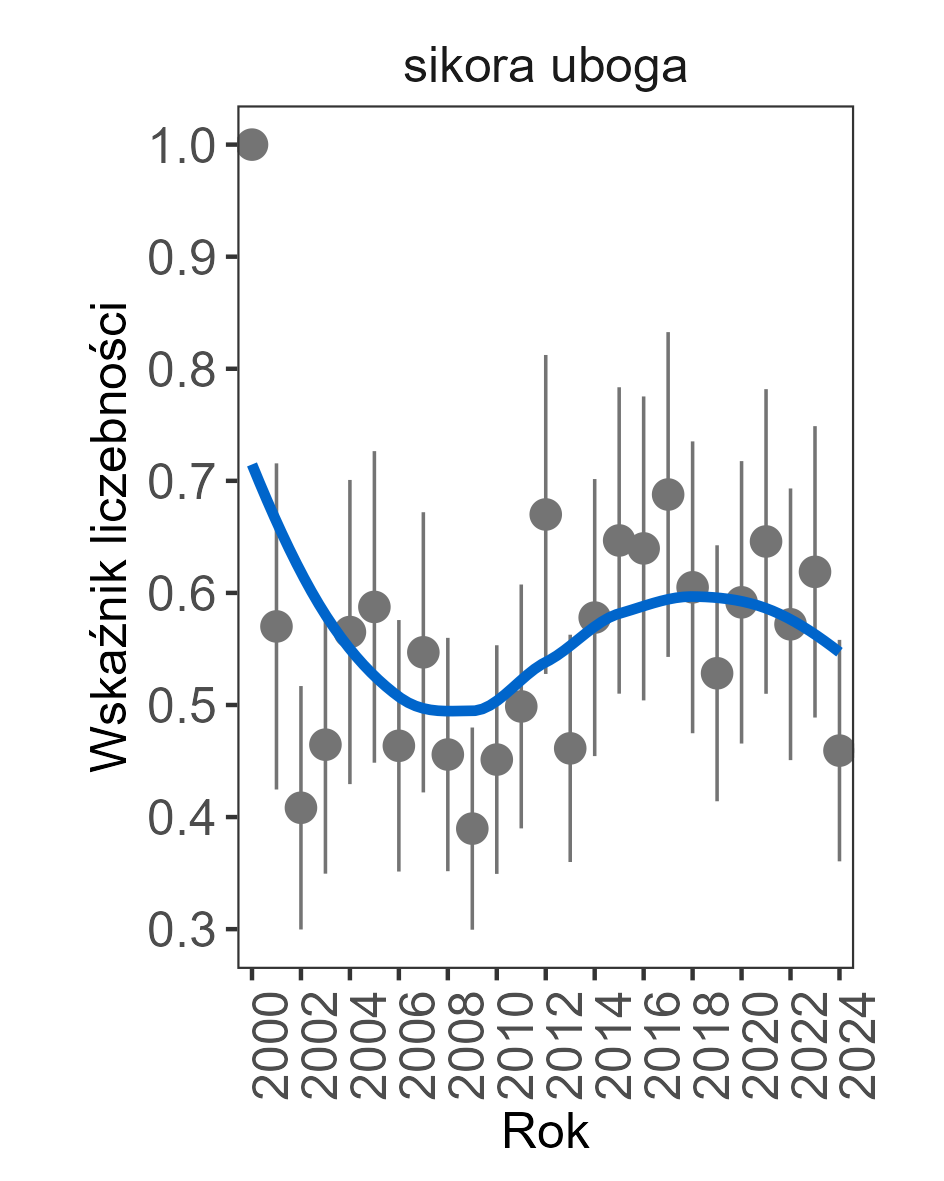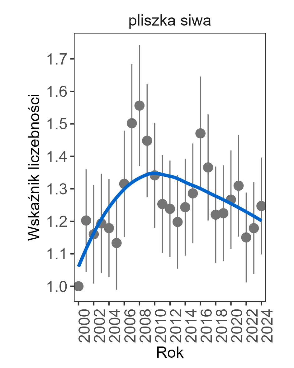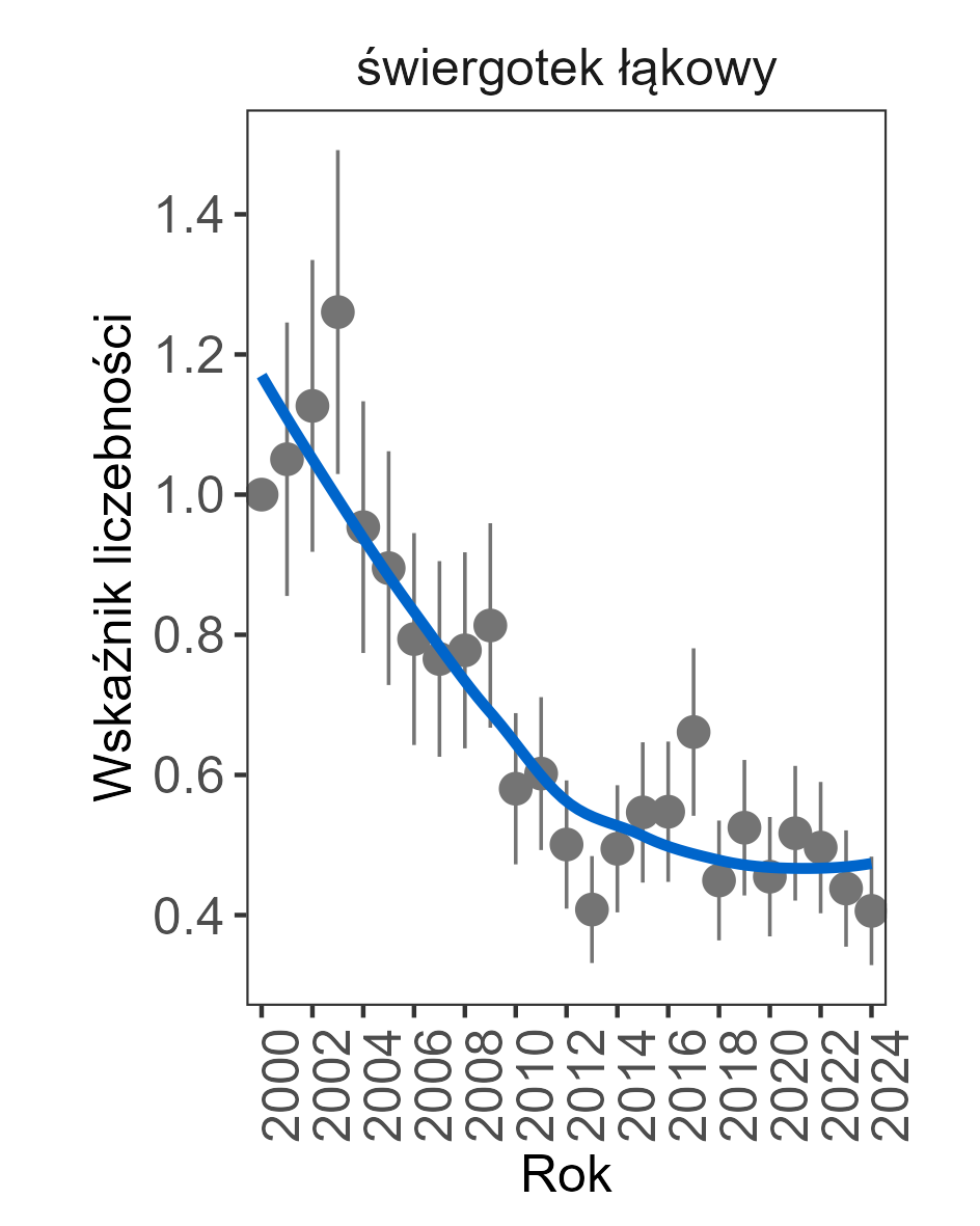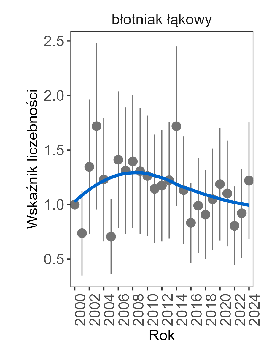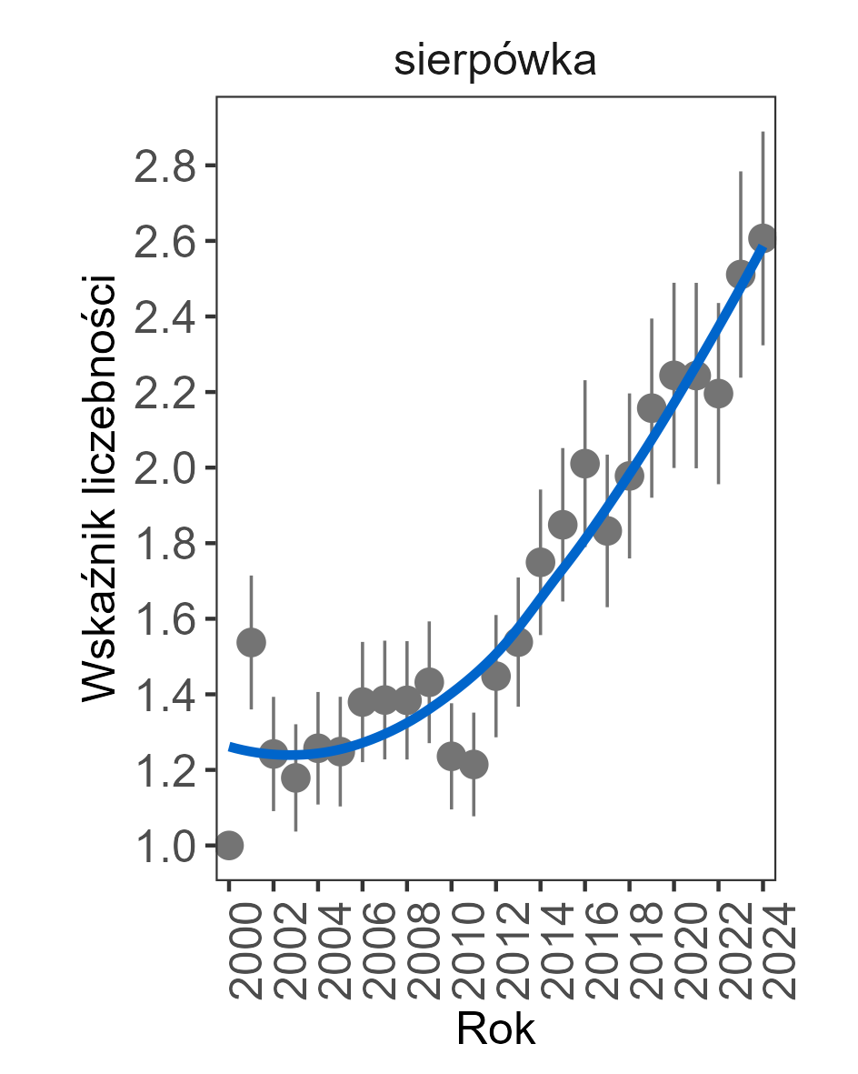 W ciągu 25 lat badań odnotowano umiarkowany wzrost liczebności 100 najszerzej rozpowszechnionych gatunków ptaków w Polsce. Wartość wskaźnika w roku 2024 wynosiła 1,0368, a średnie roczne tempo zmian w latach 2000-2024 – 0,23% . Jednak w okresie krótkoterminowym (ostatnie 12 lat) wartości wskaźnika zaczęły się zmniejszać, a jego krótkoterminowy trend okazał się być spadkowy.