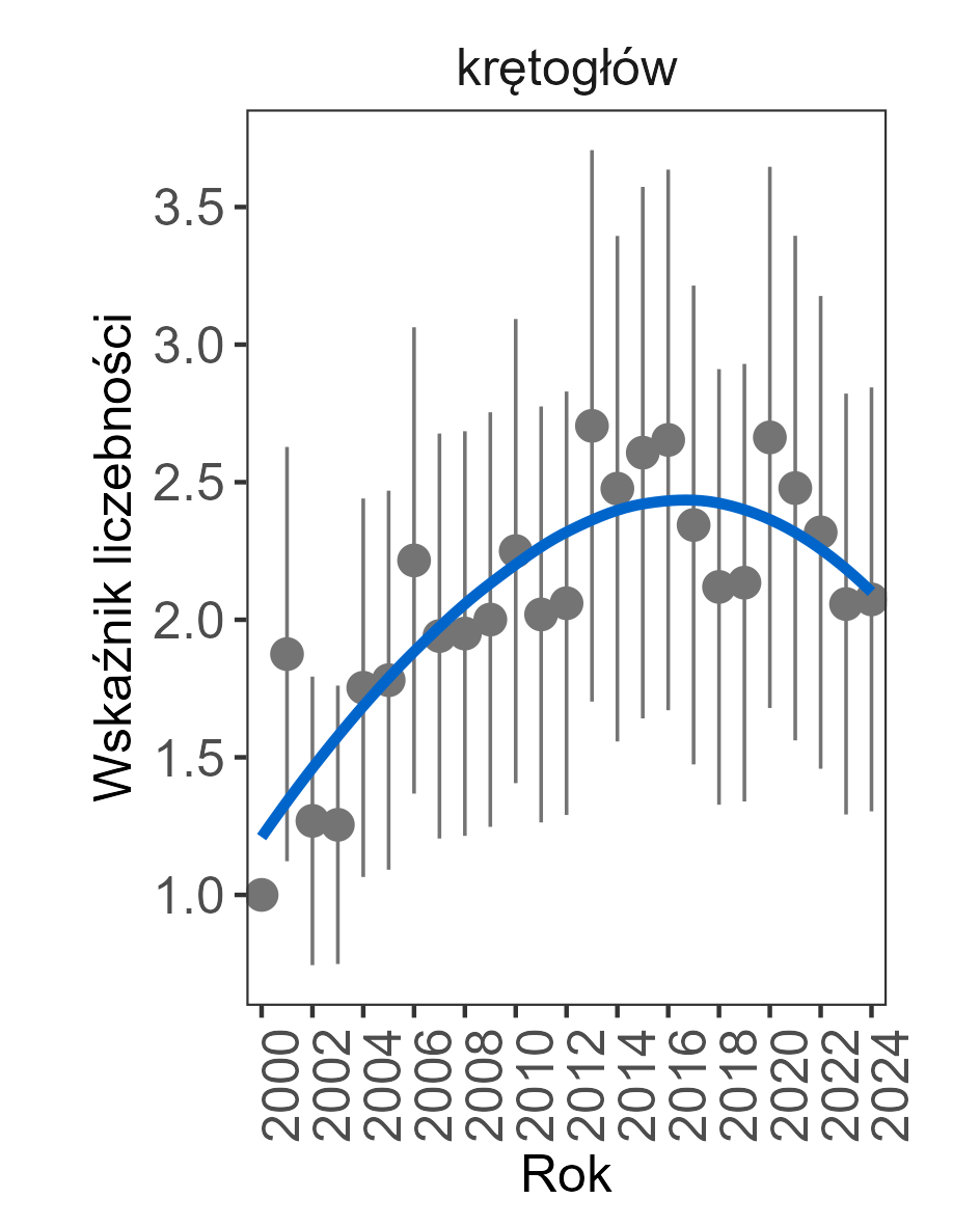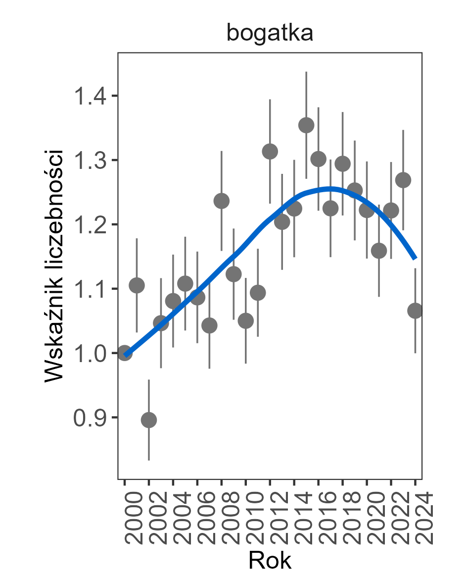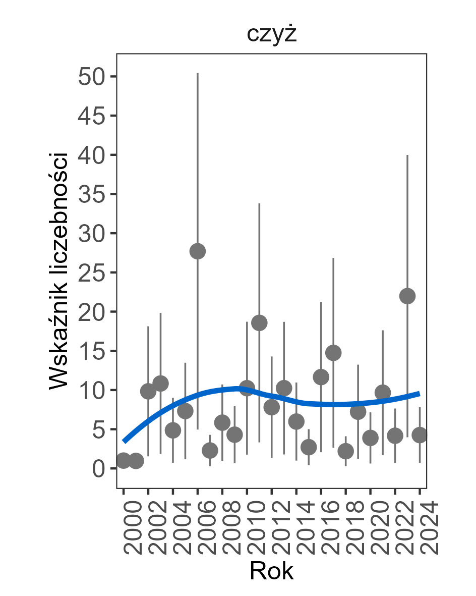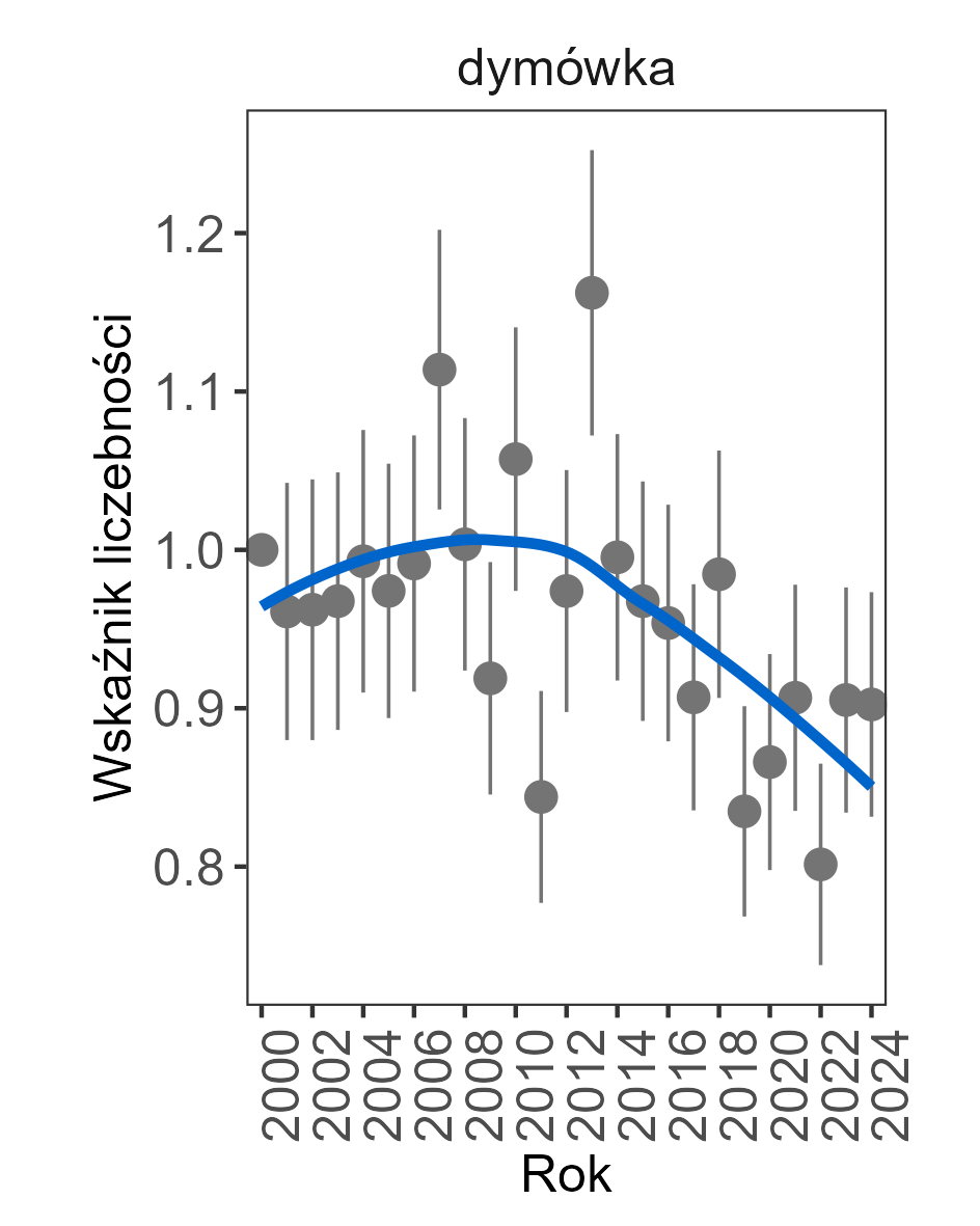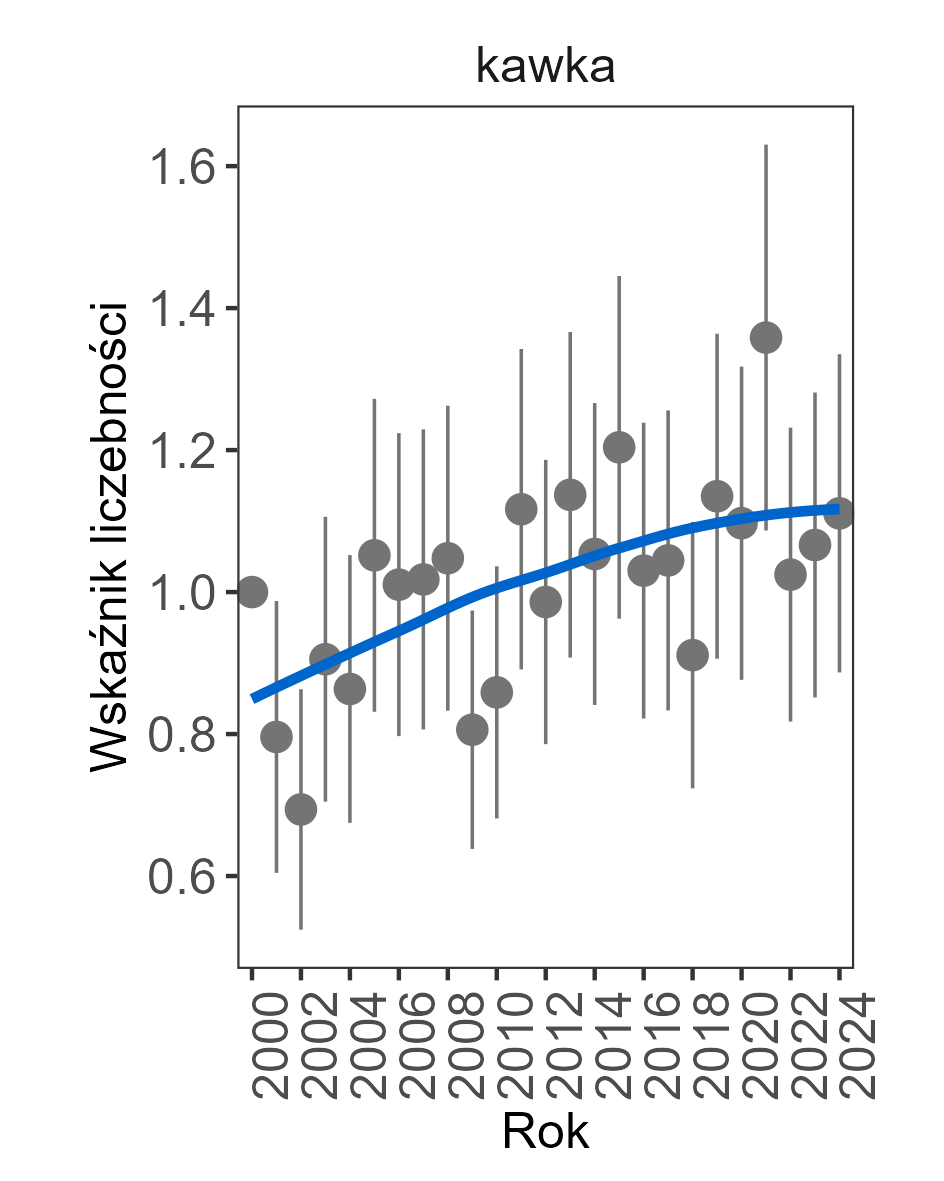 W ciągu 25 lat badań odnotowano umiarkowany wzrost liczebności 100 najszerzej rozpowszechnionych gatunków ptaków w Polsce. Wartość wskaźnika w roku 2024 wynosiła 1,0368, a średnie roczne tempo zmian w latach 2000-2024 – 0,23% . Jednak w okresie krótkoterminowym (ostatnie 12 lat) wartości wskaźnika zaczęły się zmniejszać, a jego krótkoterminowy trend okazał się być spadkowy.