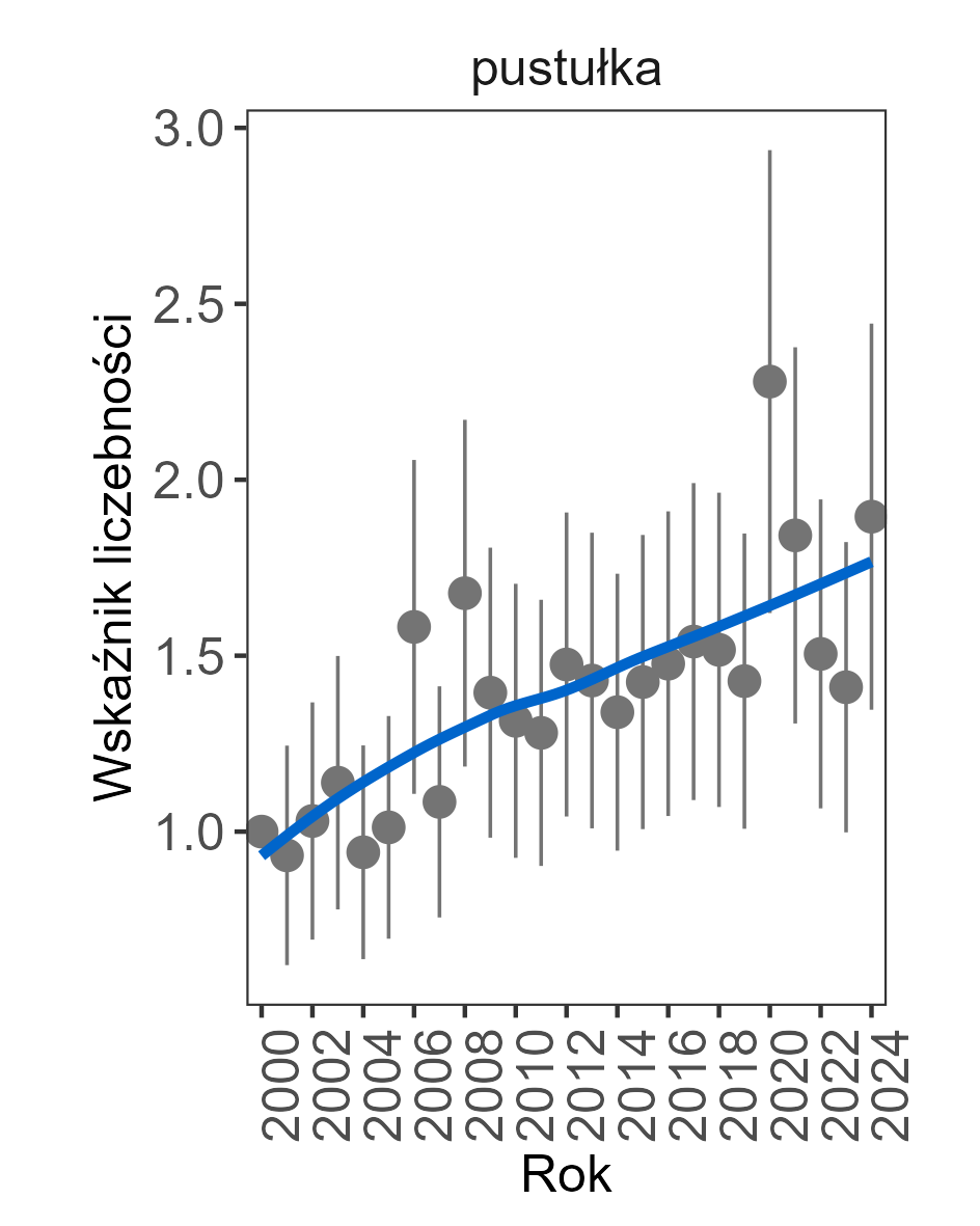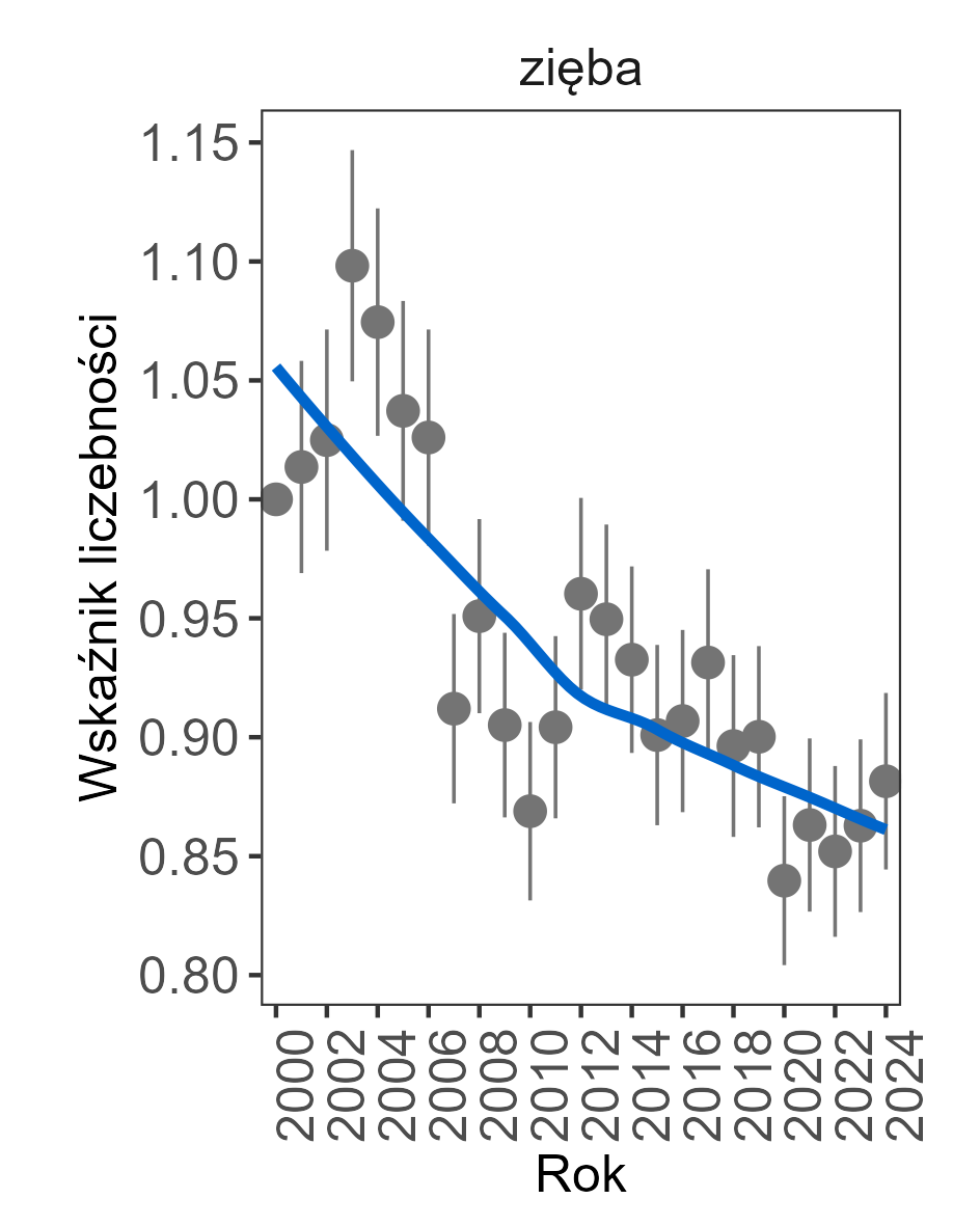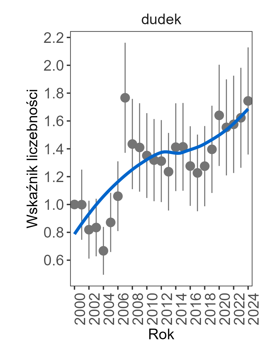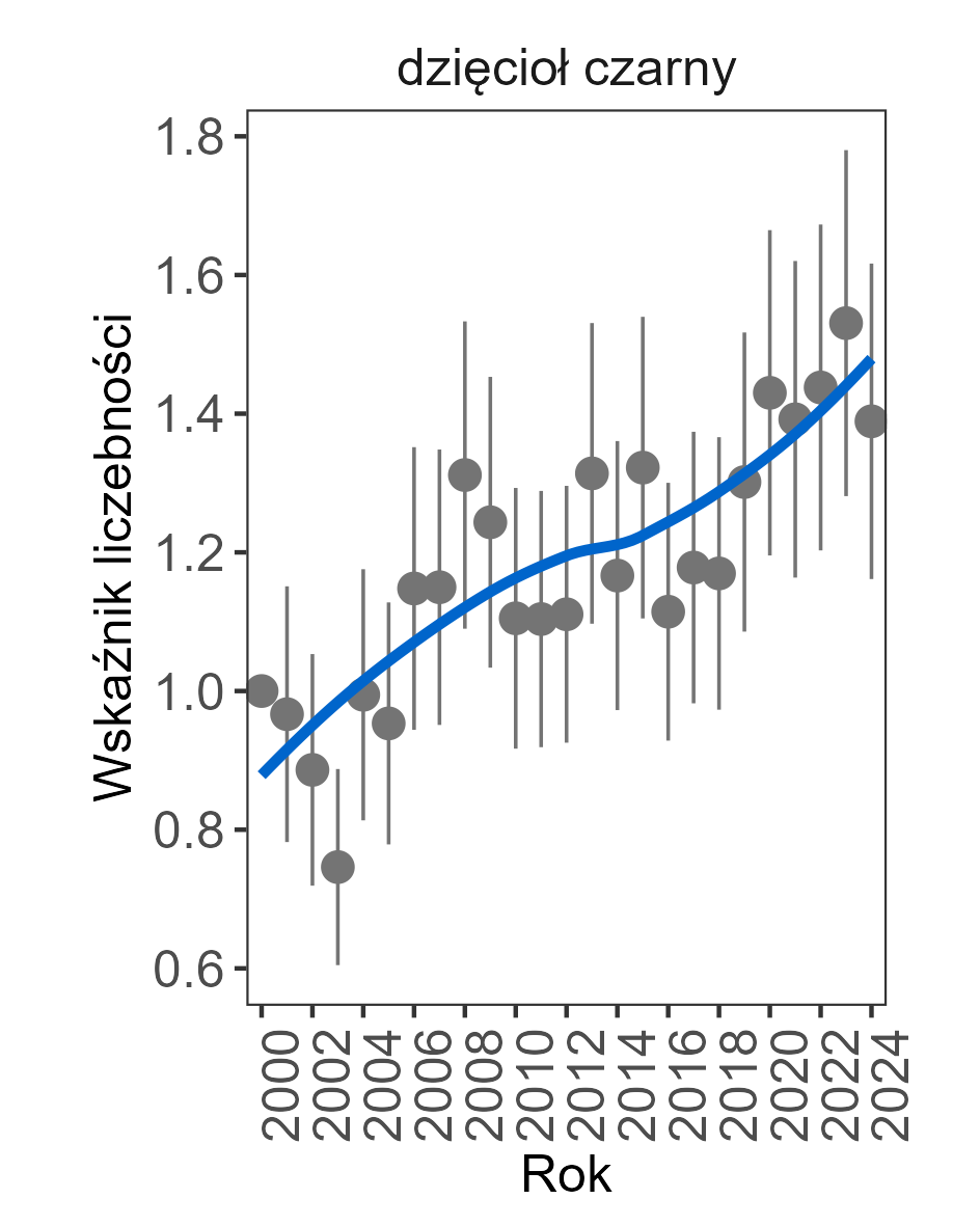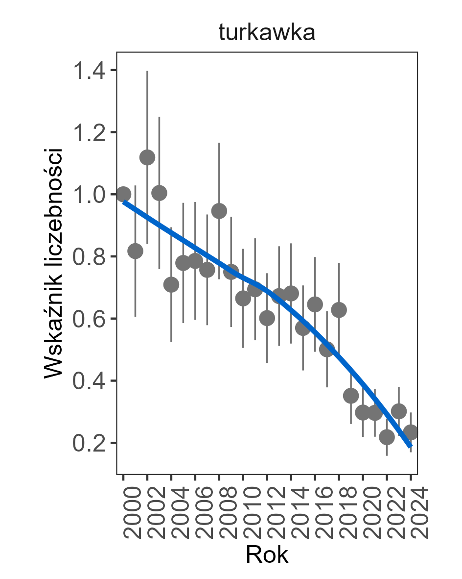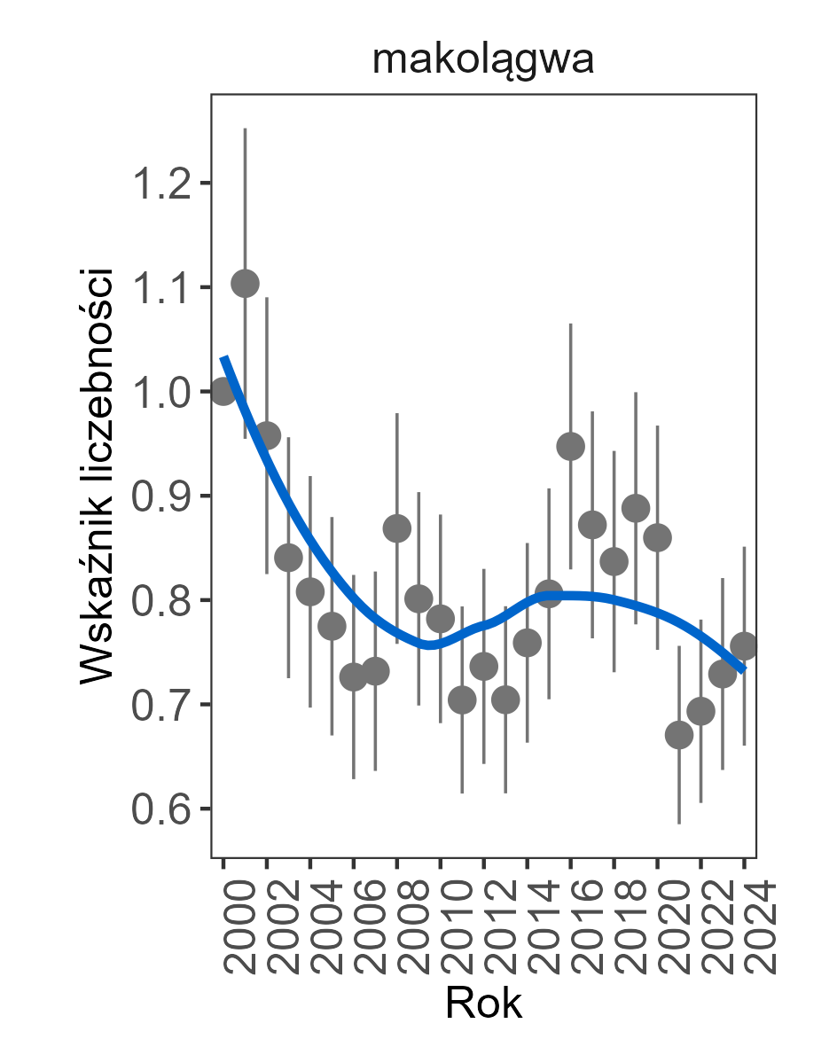 W ciągu 25 lat badań odnotowano umiarkowany wzrost liczebności 100 najszerzej rozpowszechnionych gatunków ptaków w Polsce. Wartość wskaźnika w roku 2024 wynosiła 1,0368, a średnie roczne tempo zmian w latach 2000-2024 – 0,23% . Jednak w okresie krótkoterminowym (ostatnie 12 lat) wartości wskaźnika zaczęły się zmniejszać, a jego krótkoterminowy trend okazał się być spadkowy.