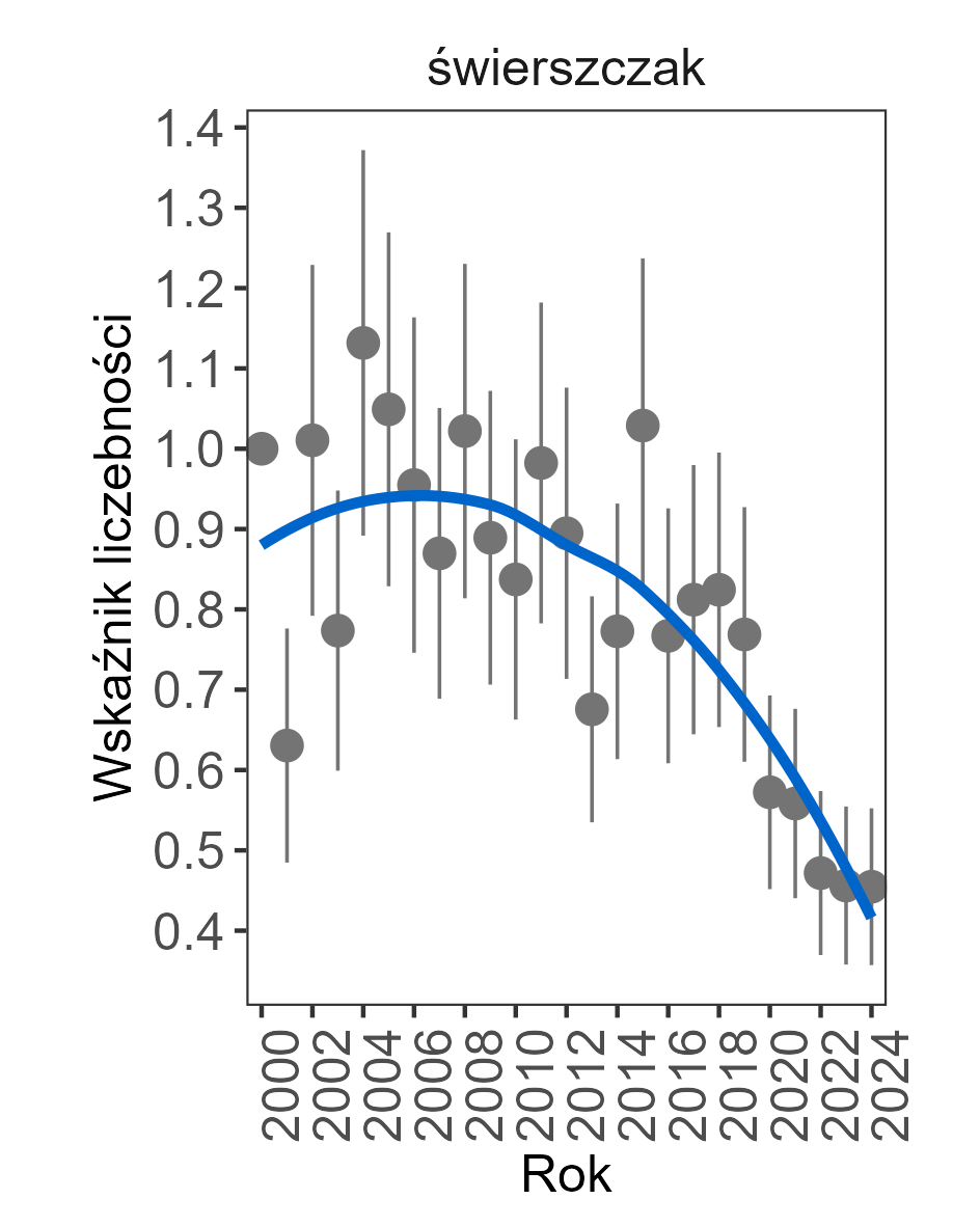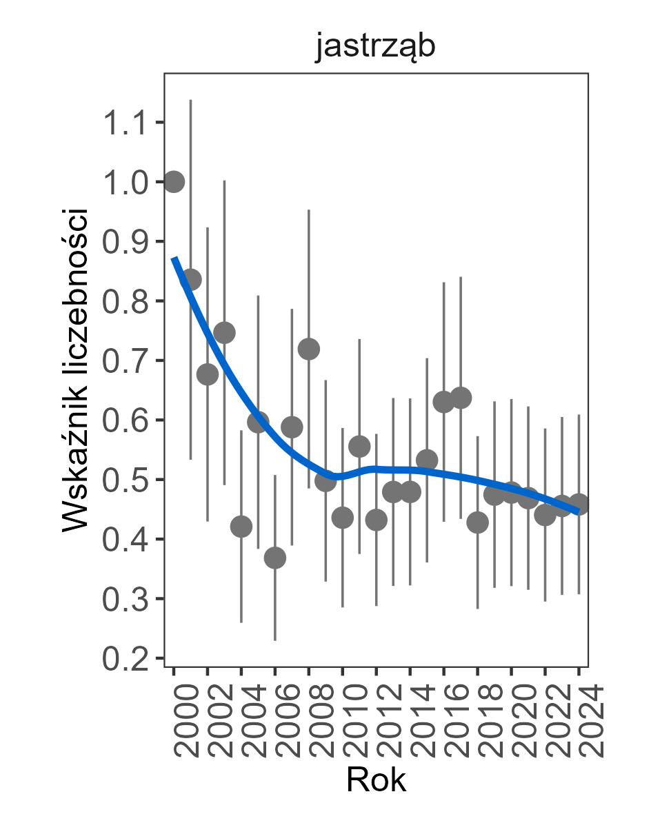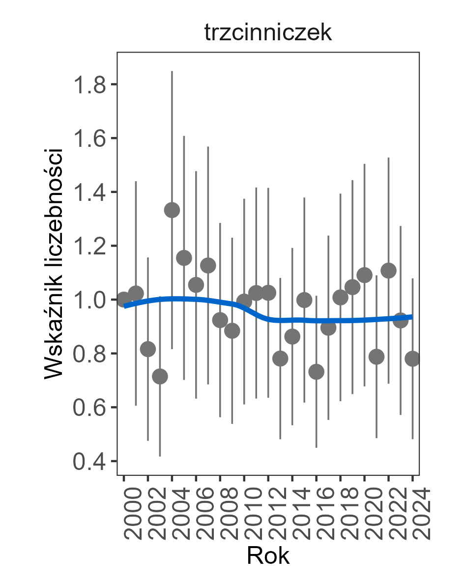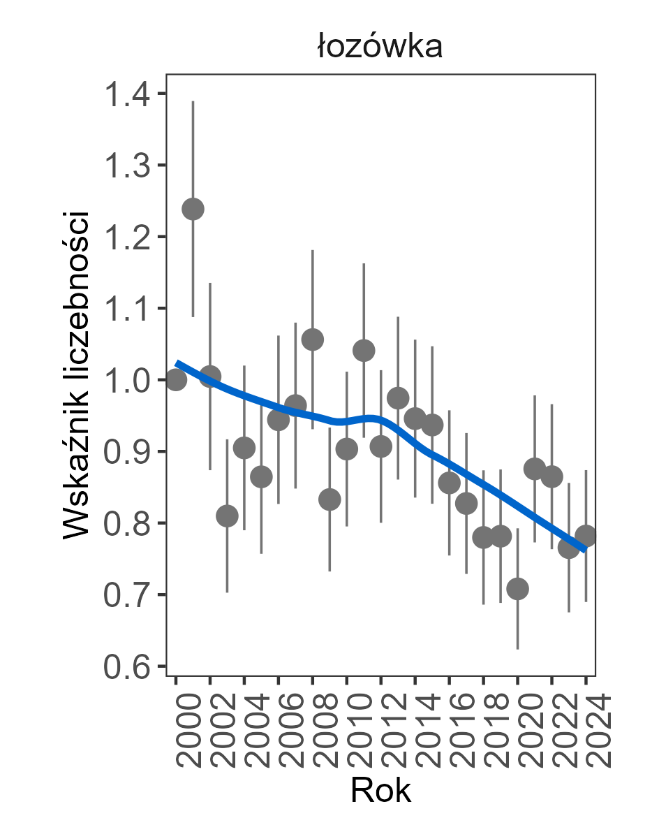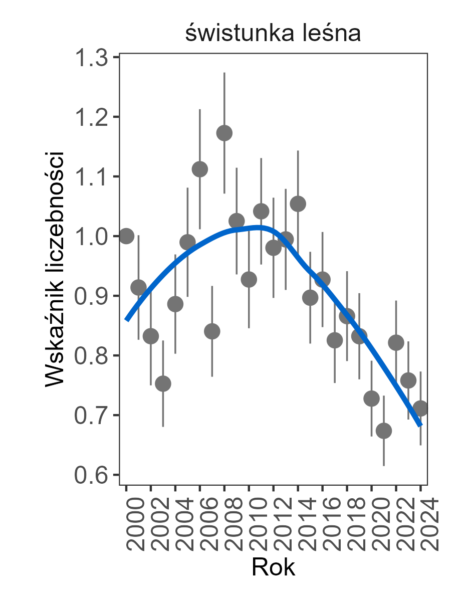 W całym okresie badań wykazano umiarkowany spadek indeksu zmian liczebności ptaków krajobrazu rolniczego, a tempo spadku wynosiło około 1% na rok (wskaźnik obliczany jest dla 22 gatunków silnie związanych z krajobrazem rolniczym, więcej informacji tu). Z kolei wskaźnik zmian liczebności pospolitych ptaków leśnych w całym okresie badań wykazywał umiarkowany wzrost w tempie 1% rocznie (indeks liczebności obliczany jest dla 34 gatunków silnie związanych z siedliskami leśnymi - więcej informacji tu).