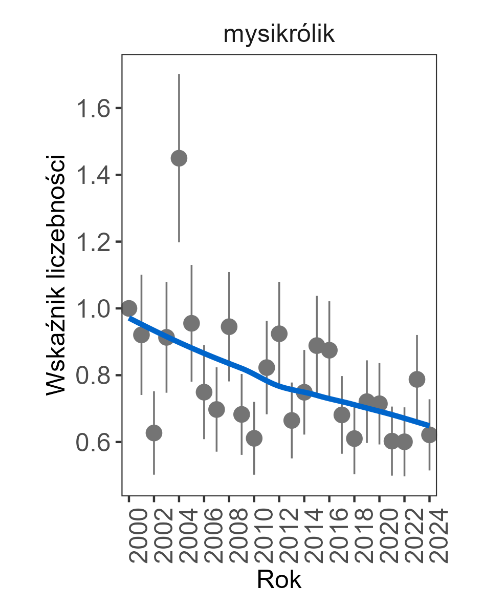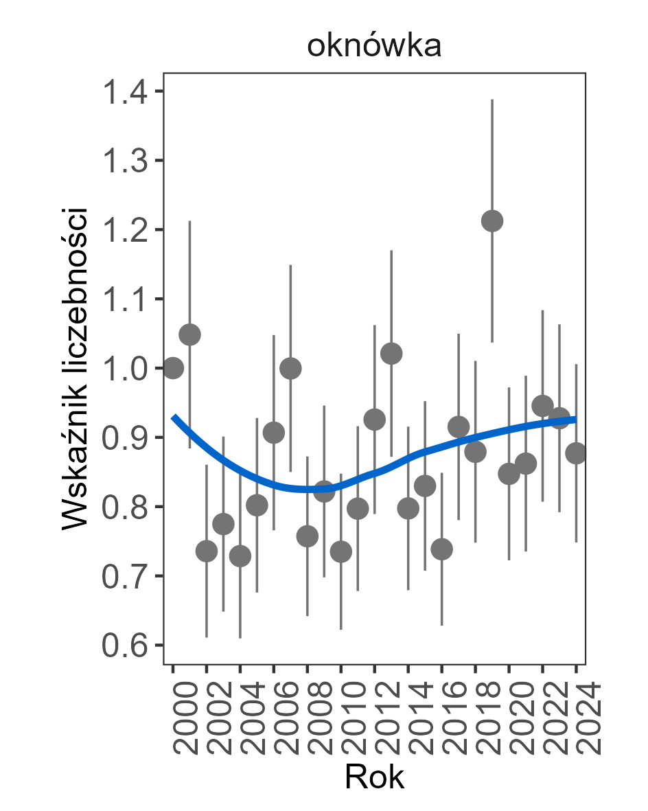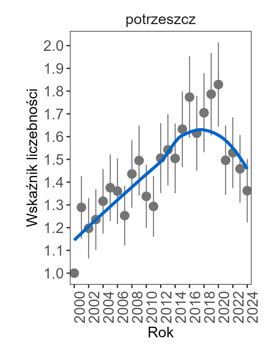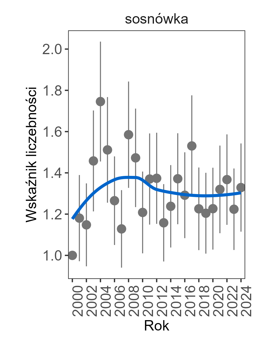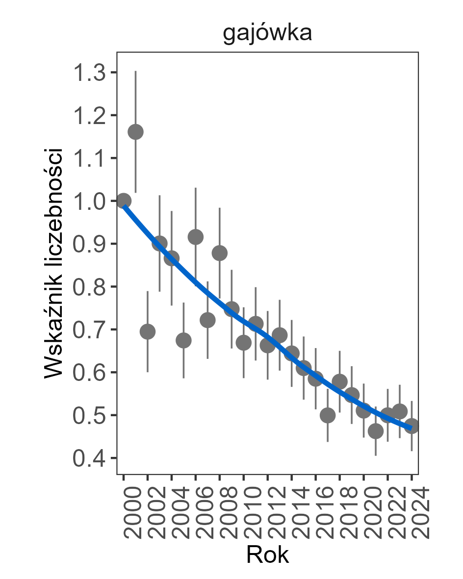W całym okresie badań wykazano umiarkowany spadek indeksu zmian liczebności ptaków krajobrazu rolniczego, a tempo spadku wynosiło około 1% na rok (wskaźnik obliczany jest dla 22 gatunków silnie związanych z krajobrazem rolniczym, więcej informacji tu). Z kolei wskaźnik zmian liczebności pospolitych ptaków leśnych w całym okresie badań wykazywał umiarkowany wzrost w tempie 1% rocznie (indeks liczebności obliczany jest dla 34 gatunków silnie związanych z siedliskami leśnymi - więcej informacji tu).