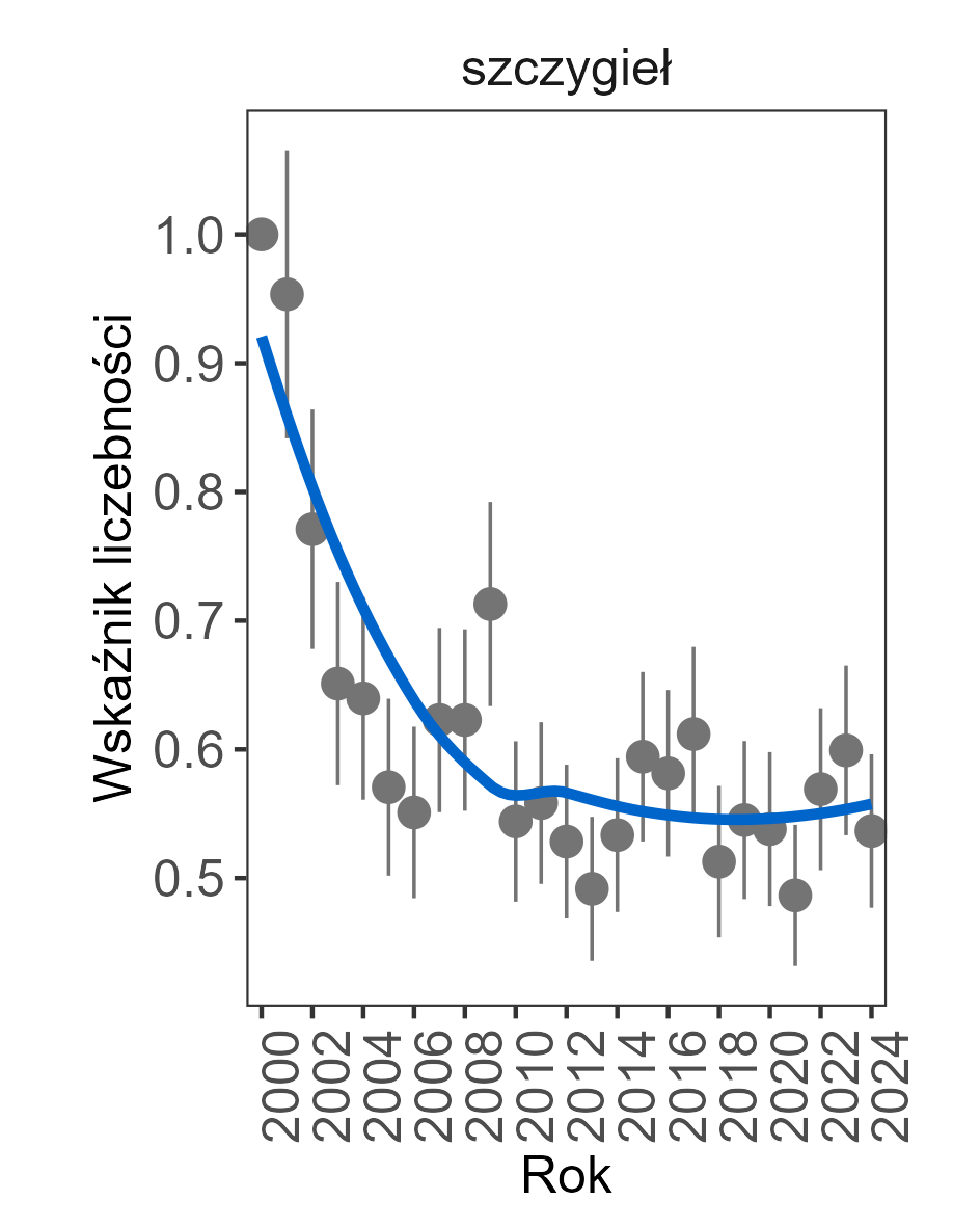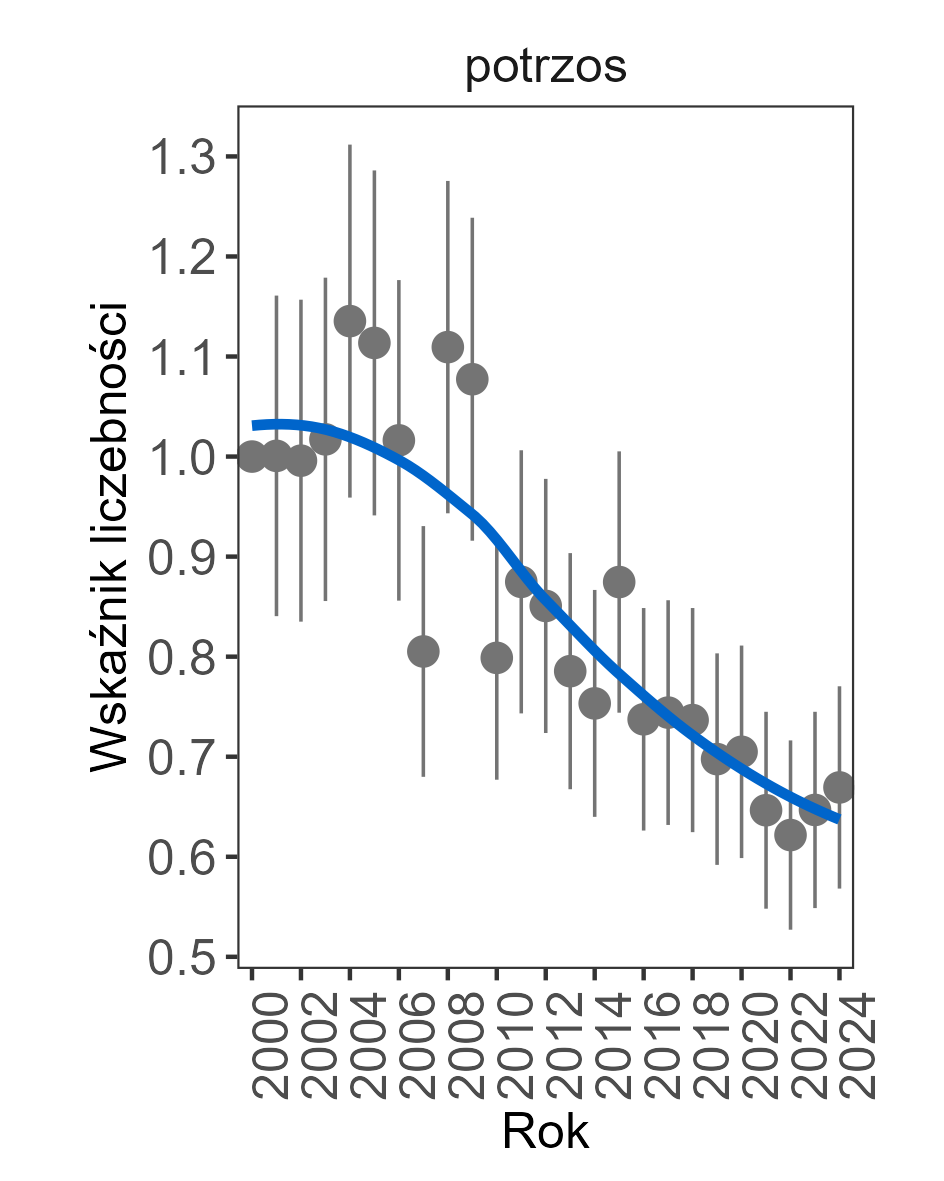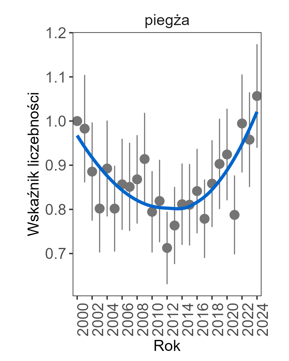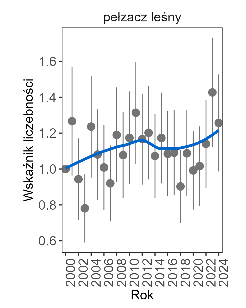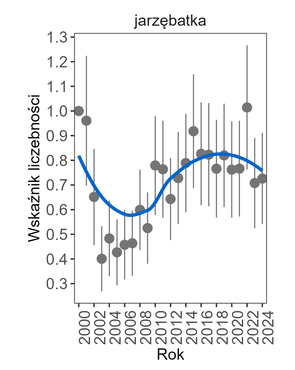 W całym okresie badań wykazano umiarkowany spadek indeksu zmian liczebności ptaków krajobrazu rolniczego, a tempo spadku wynosiło około 1% na rok (wskaźnik obliczany jest dla 22 gatunków silnie związanych z krajobrazem rolniczym, więcej informacji tu). Z kolei wskaźnik zmian liczebności pospolitych ptaków leśnych w całym okresie badań wykazywał umiarkowany wzrost w tempie 1% rocznie (indeks liczebności obliczany jest dla 34 gatunków silnie związanych z siedliskami leśnymi - więcej informacji tu).