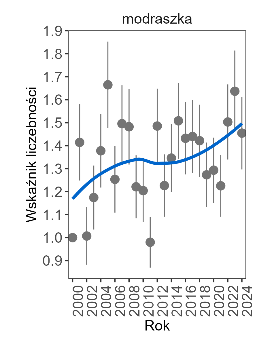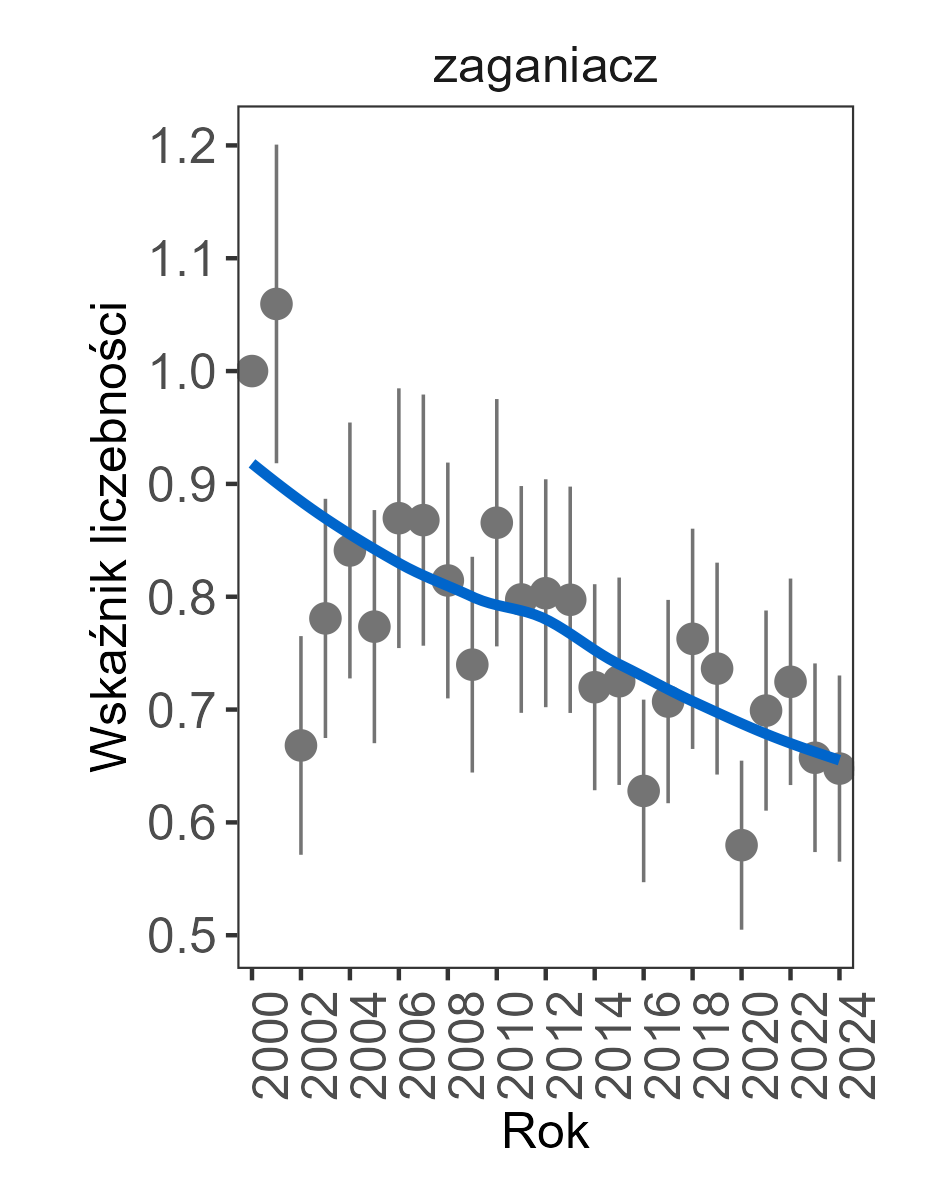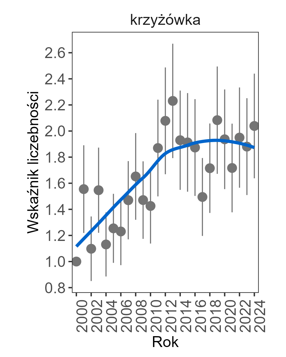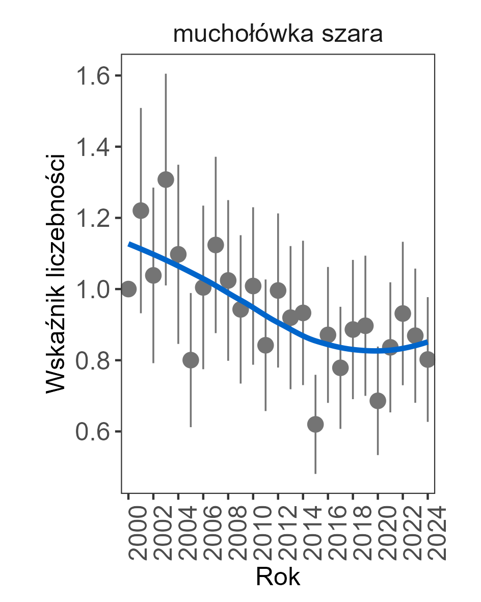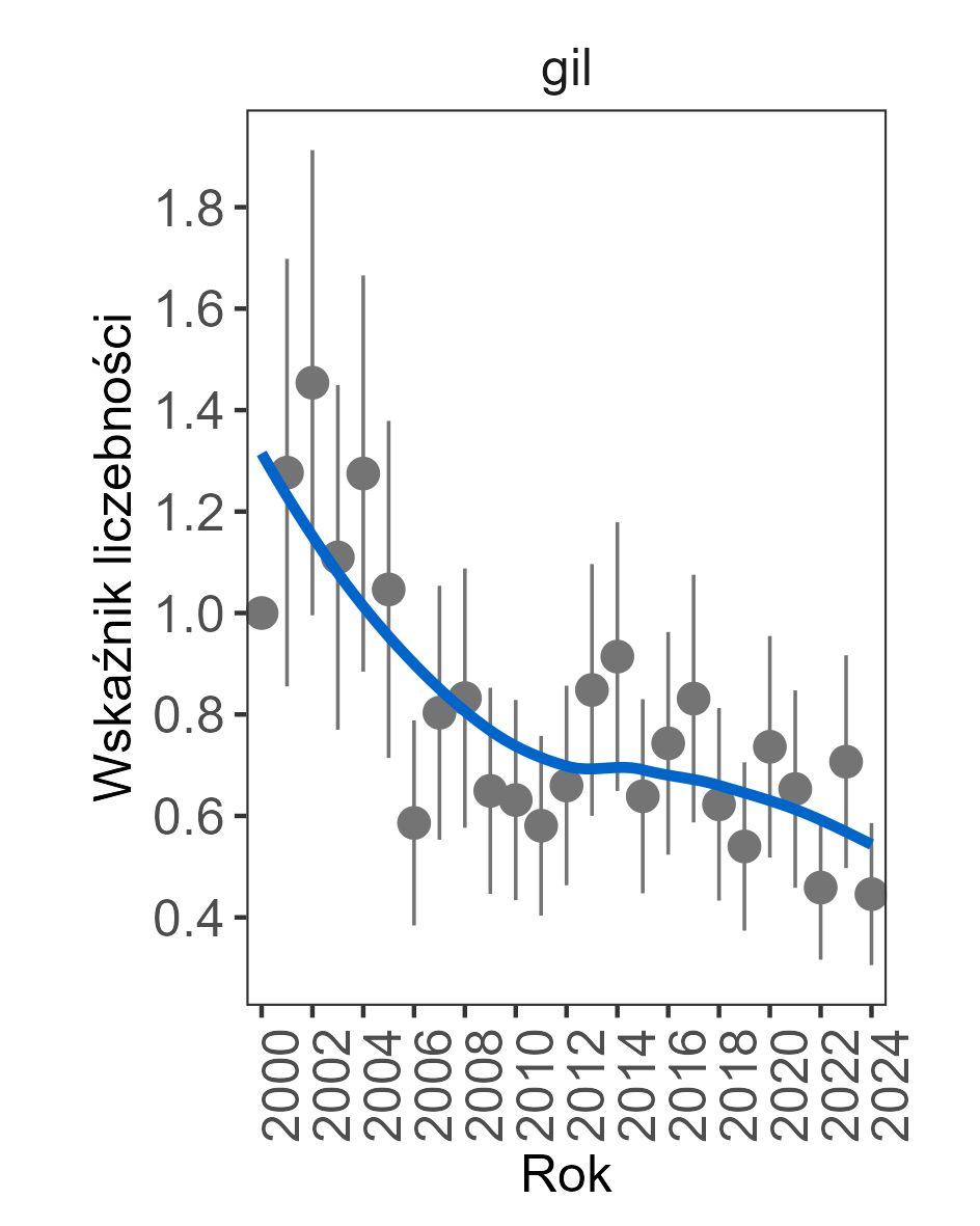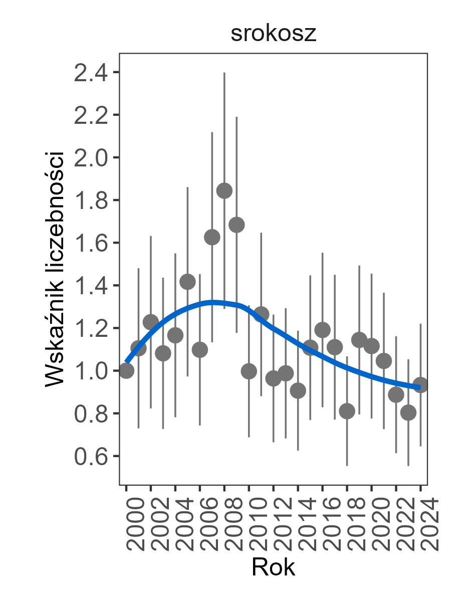 W całym okresie badań wykazano umiarkowany spadek indeksu zmian liczebności ptaków krajobrazu rolniczego, a tempo spadku wynosiło około 1% na rok (wskaźnik obliczany jest dla 22 gatunków silnie związanych z krajobrazem rolniczym, więcej informacji tu). Z kolei wskaźnik zmian liczebności pospolitych ptaków leśnych w całym okresie badań wykazywał umiarkowany wzrost w tempie 1% rocznie (indeks liczebności obliczany jest dla 34 gatunków silnie związanych z siedliskami leśnymi - więcej informacji tu).