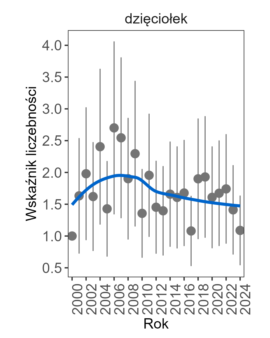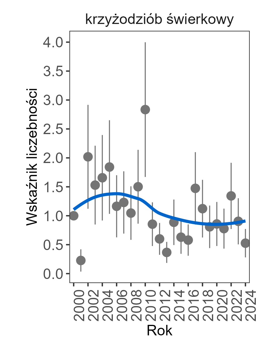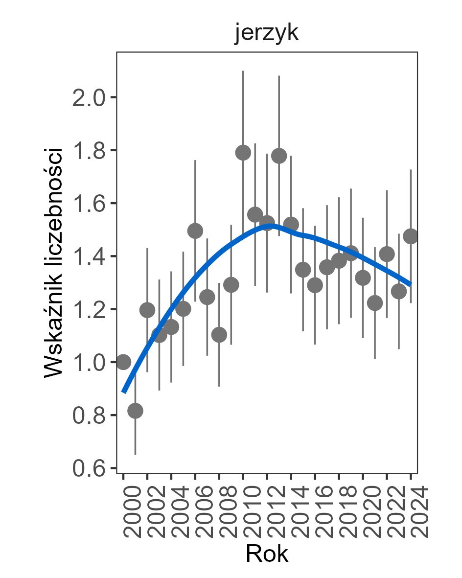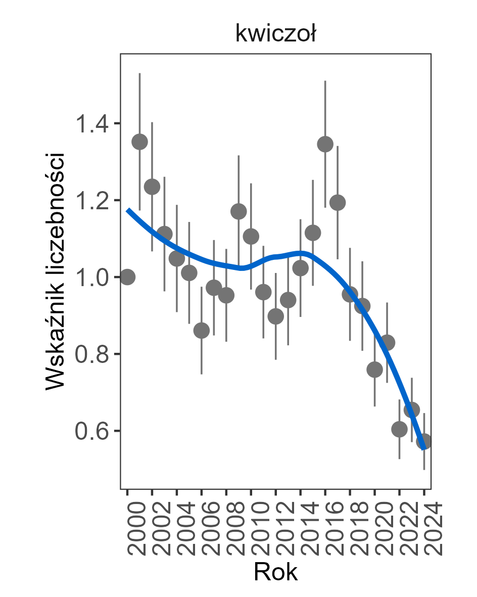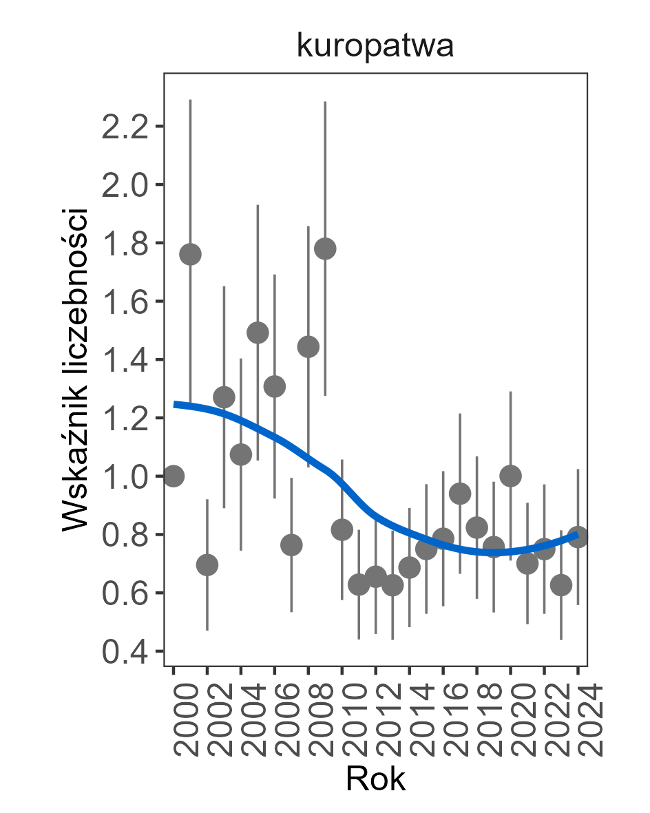 W całym okresie badań wykazano umiarkowany spadek indeksu zmian liczebności ptaków krajobrazu rolniczego, a tempo spadku wynosiło około 1% na rok (wskaźnik obliczany jest dla 22 gatunków silnie związanych z krajobrazem rolniczym, więcej informacji tu). Z kolei wskaźnik zmian liczebności pospolitych ptaków leśnych w całym okresie badań wykazywał umiarkowany wzrost w tempie 1% rocznie (indeks liczebności obliczany jest dla 34 gatunków silnie związanych z siedliskami leśnymi - więcej informacji tu).