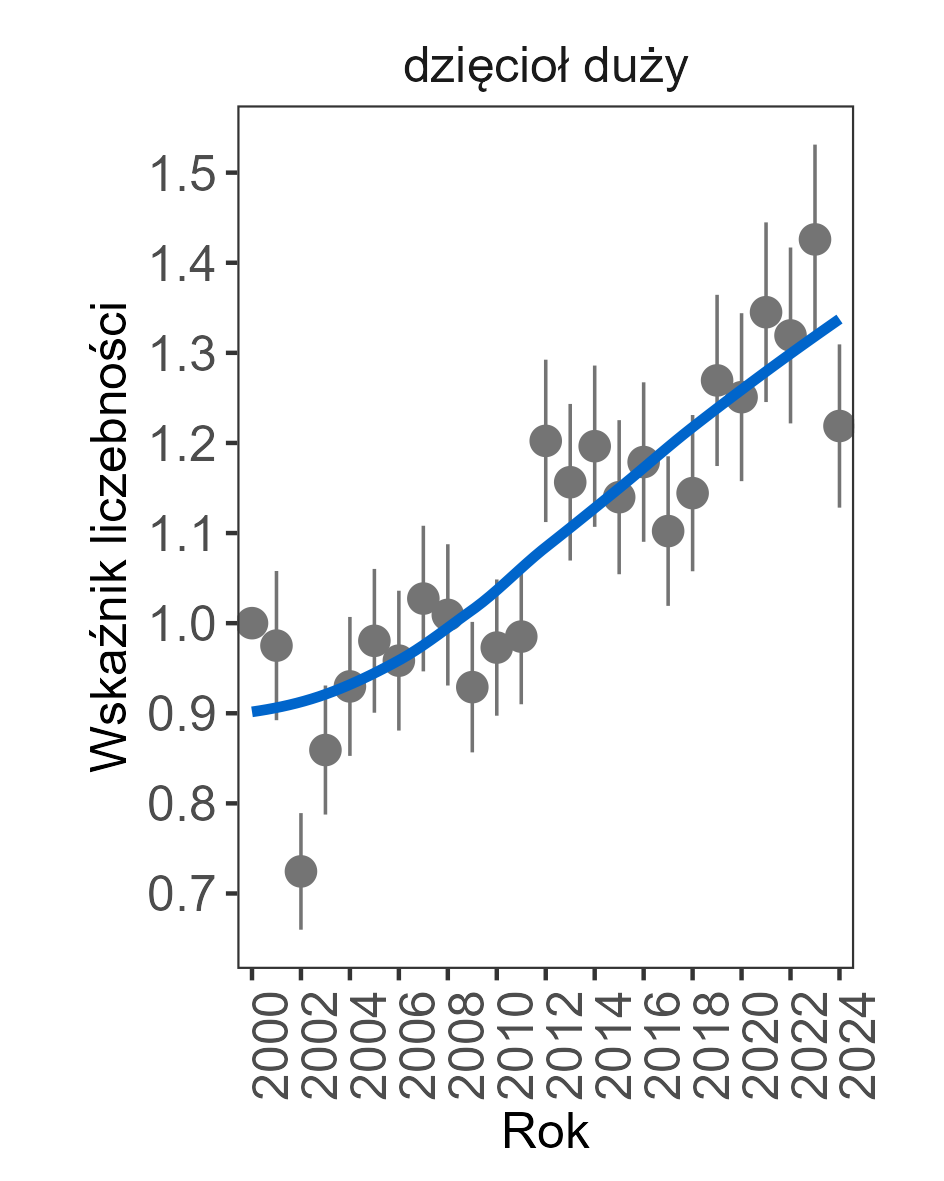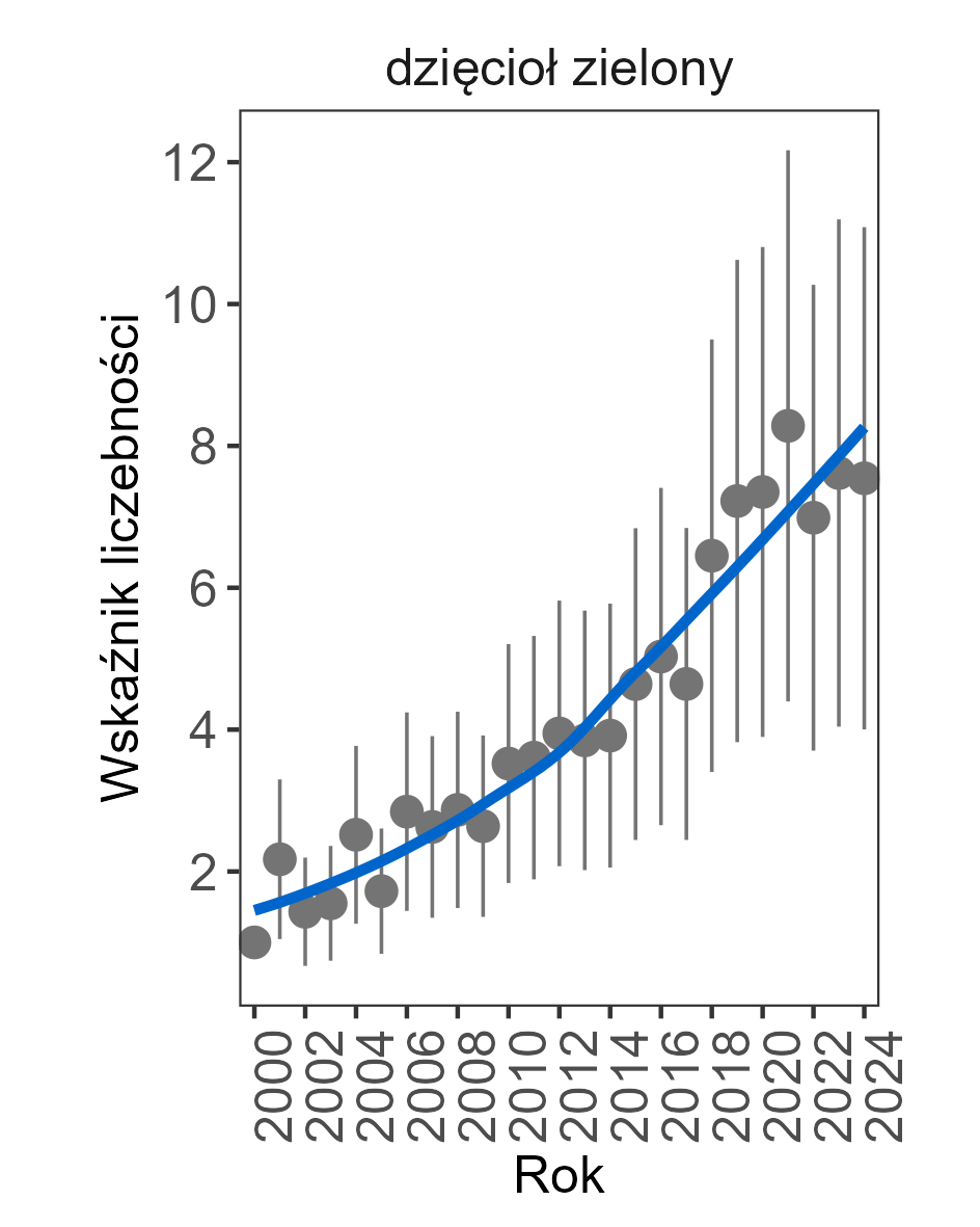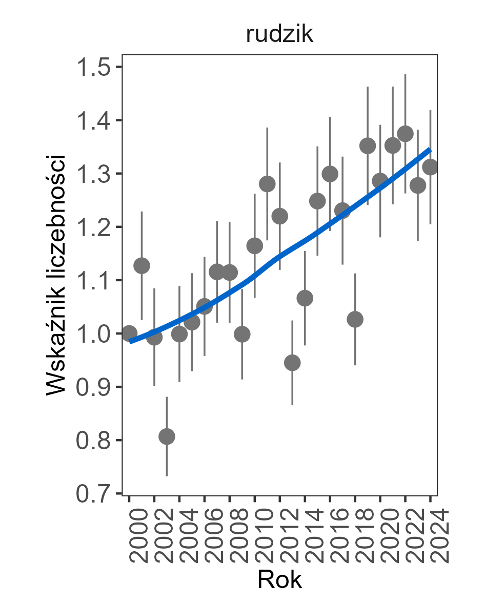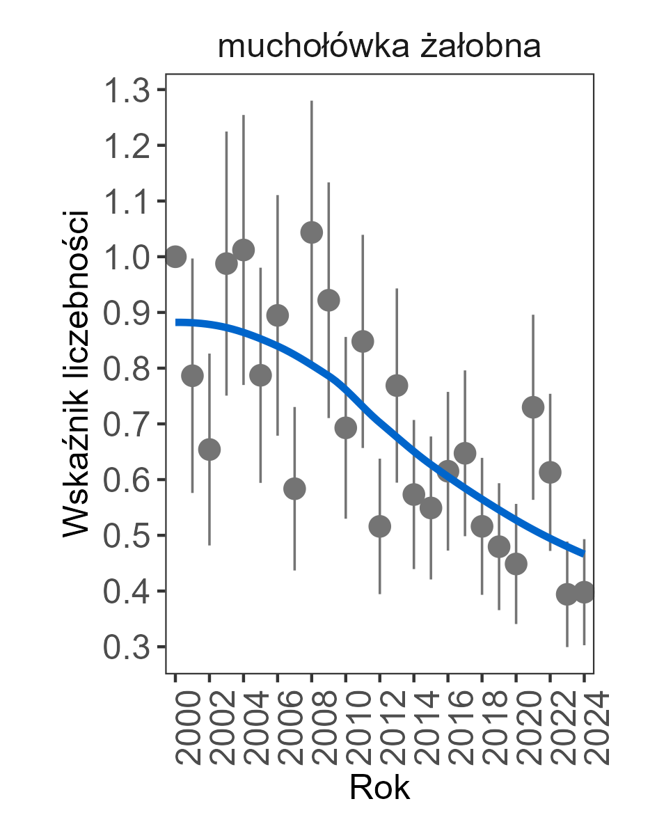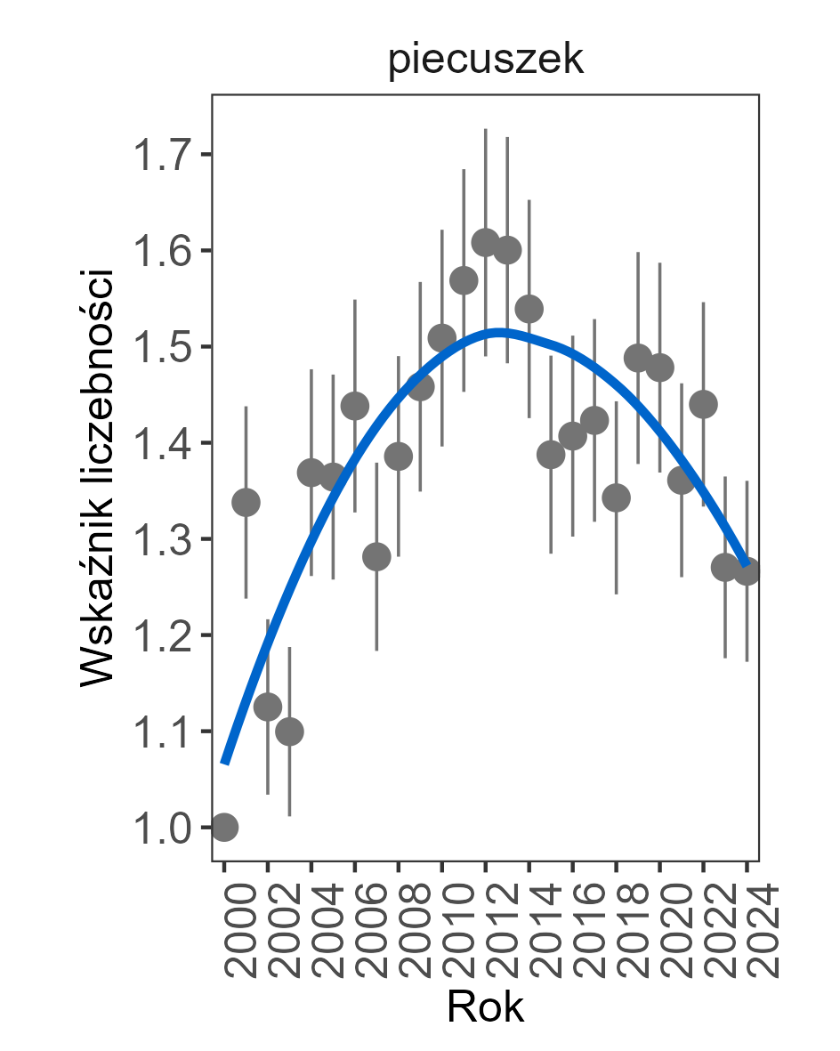 W całym okresie badań wykazano umiarkowany spadek indeksu zmian liczebności ptaków krajobrazu rolniczego, a tempo spadku wynosiło około 1% na rok (wskaźnik obliczany jest dla 22 gatunków silnie związanych z krajobrazem rolniczym, więcej informacji tu). Z kolei wskaźnik zmian liczebności pospolitych ptaków leśnych w całym okresie badań wykazywał umiarkowany wzrost w tempie 1% rocznie (indeks liczebności obliczany jest dla 34 gatunków silnie związanych z siedliskami leśnymi - więcej informacji tu).