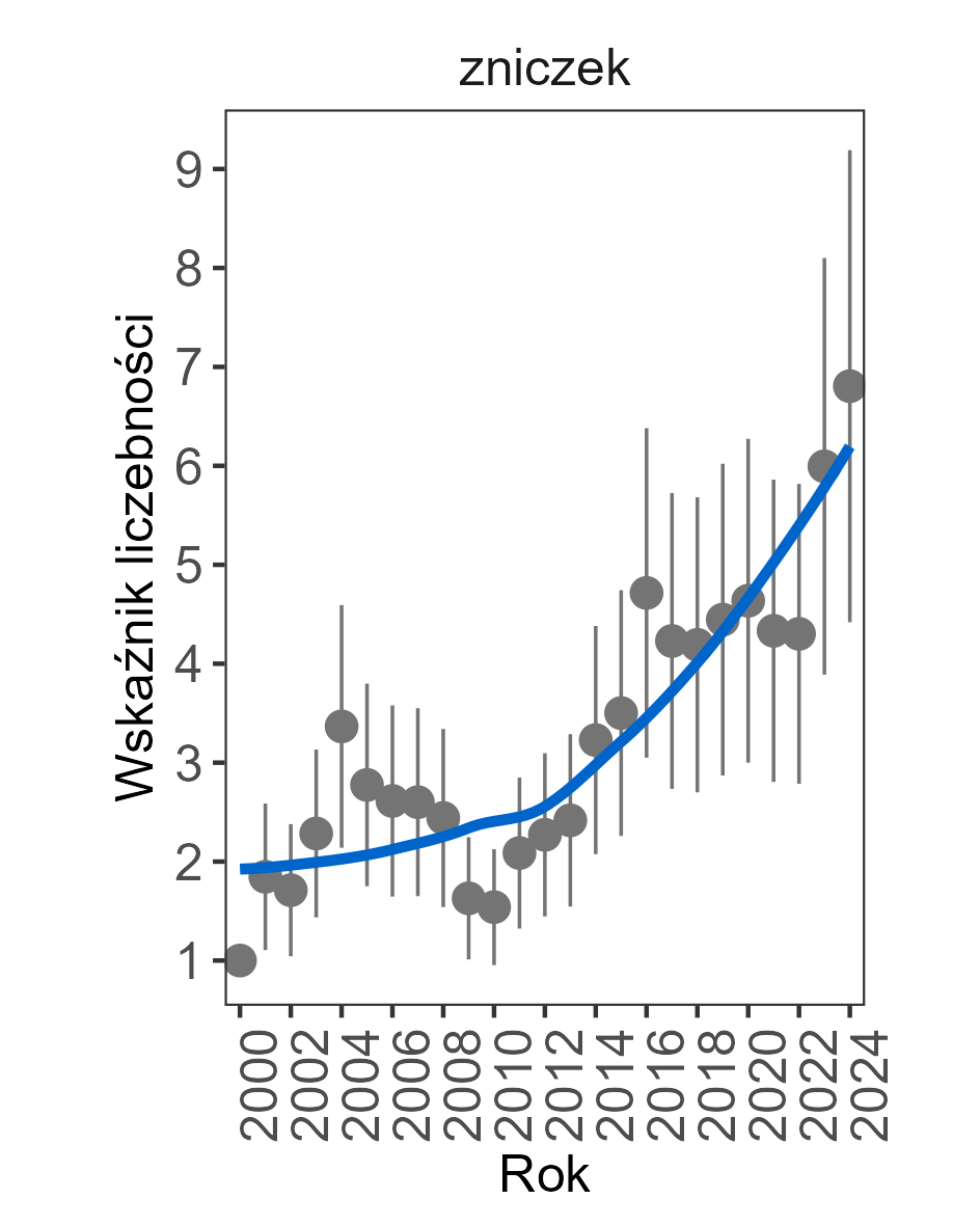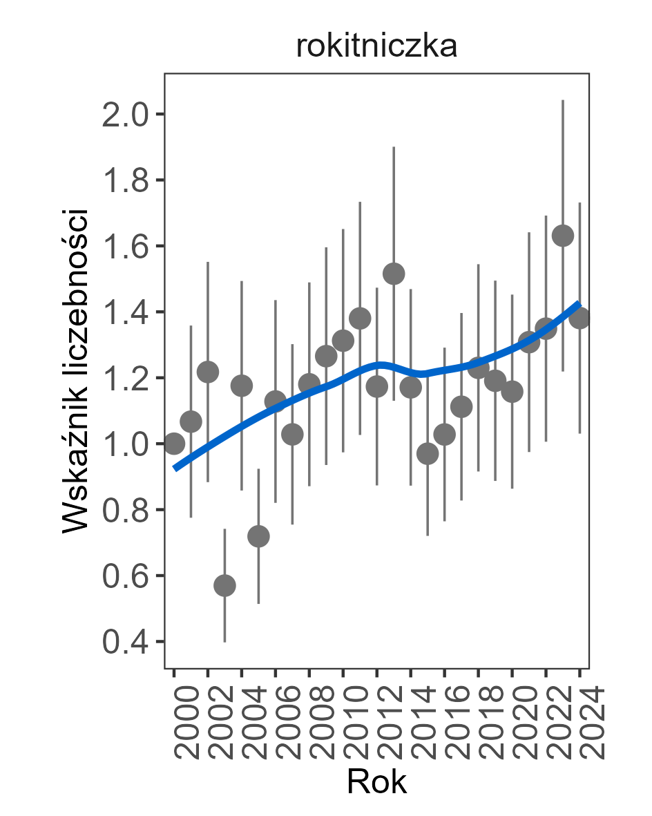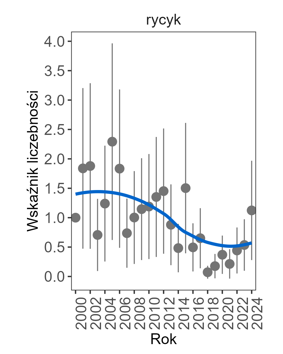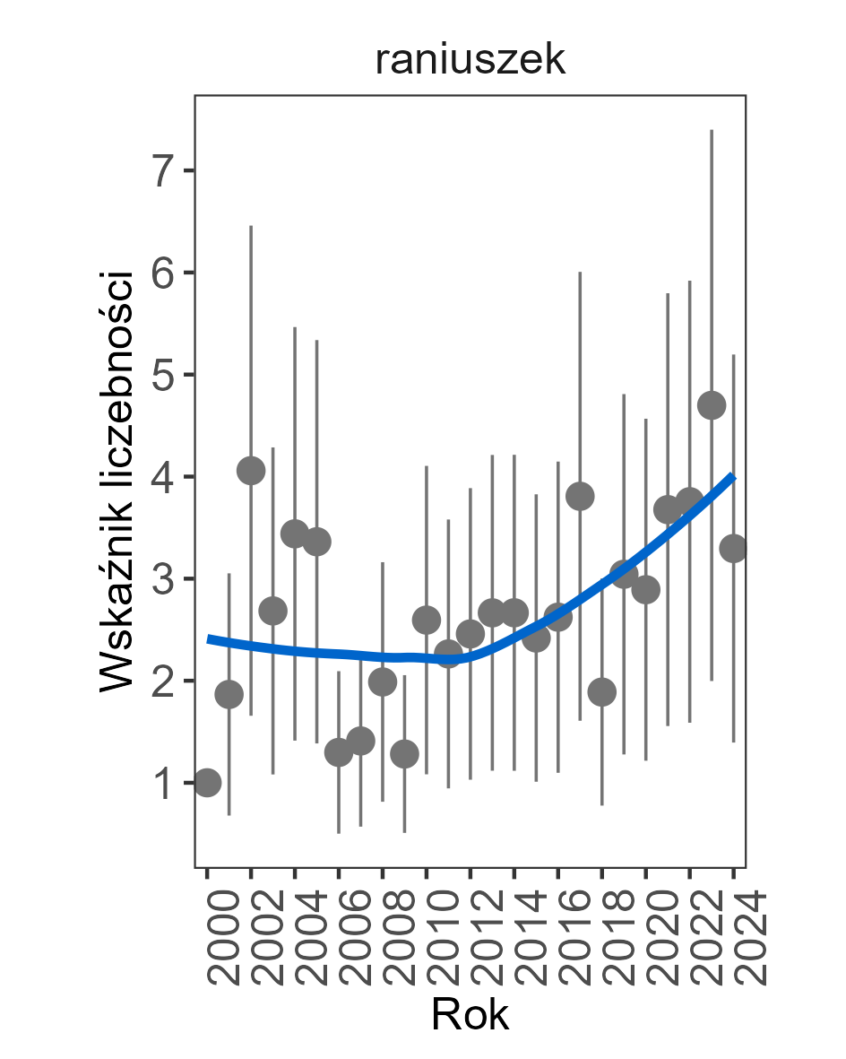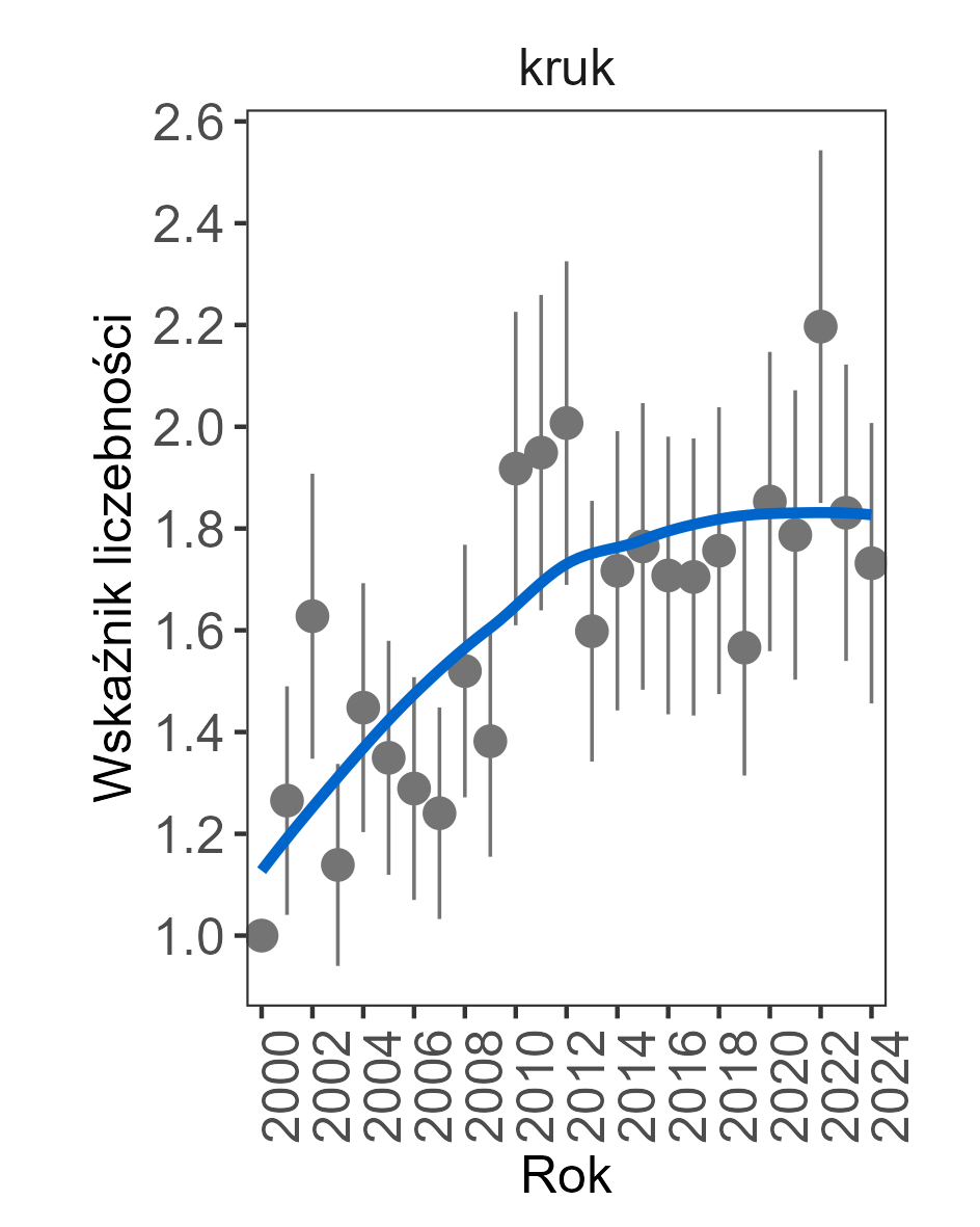 W całym okresie badań wykazano umiarkowany spadek indeksu zmian liczebności ptaków krajobrazu rolniczego, a tempo spadku wynosiło około 1% na rok (wskaźnik obliczany jest dla 22 gatunków silnie związanych z krajobrazem rolniczym, więcej informacji tu). Z kolei wskaźnik zmian liczebności pospolitych ptaków leśnych w całym okresie badań wykazywał umiarkowany wzrost w tempie 1% rocznie (indeks liczebności obliczany jest dla 34 gatunków silnie związanych z siedliskami leśnymi - więcej informacji tu).