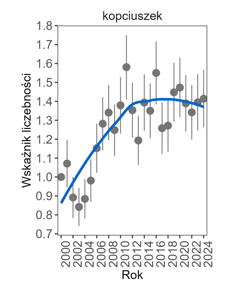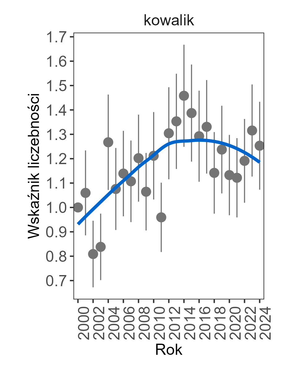 Na poniższych wykresach przedstawiono zmiany wskaźnika liczebności zagregowanego dla 100 najpospolitszych gatunków ptaków w latach 2000–2024 na obszarze całego kraju (lewy wykres) oraz w podziale na powierzchnie leżące w OSOP Natura 2000 (środkowy wykres) i poza nimi (prawy wykres). Skala osi Y na każdym wykresie ma inny zakres. Linią zaznaczono trend dopasowany za pomocą funkcji loess.
