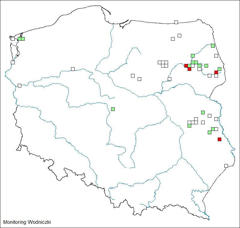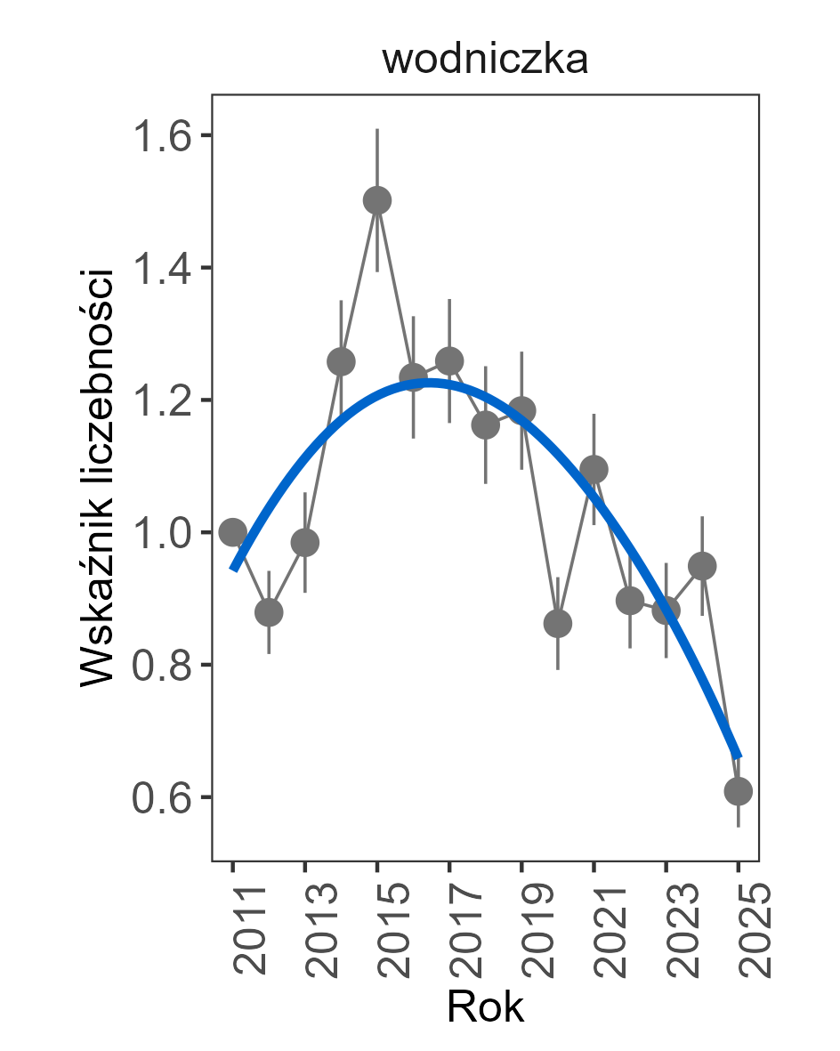 Dane zebrane na transektach wskazują, że od roku 2011 odnotowano stabilny trend rozpowszechnienia oraz umiarkowany spadek liczebności wodniczki (patrz wykres). Było to jednak zróżnicowane regionalnie, a stabilny trend liczebności zaobserwowano na transektach na Lubelszczyźnie, natomiast umiarkowany spadek odnotowano w Dolinie Biebrzy. Na stanowiskach MWO-P, zlokalizowanych poza kluczowymi obszarami występowania gatunku, również zaobserwowano umiarkowany spadek wskaźnika liczebności.